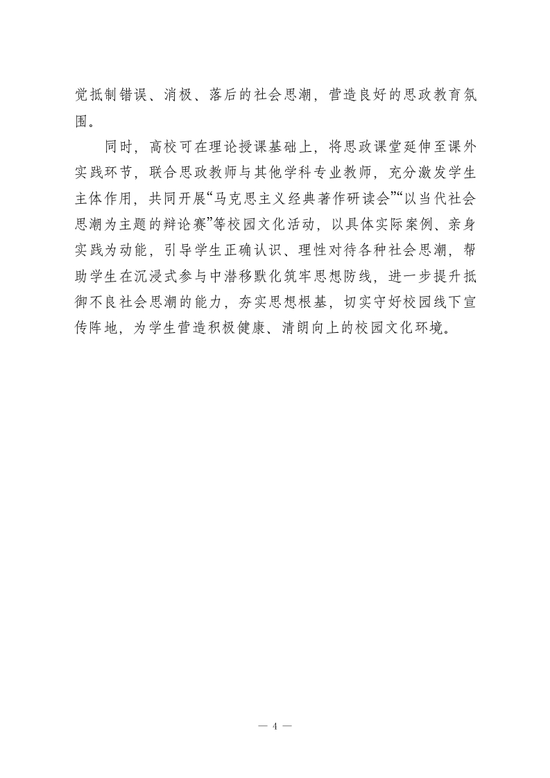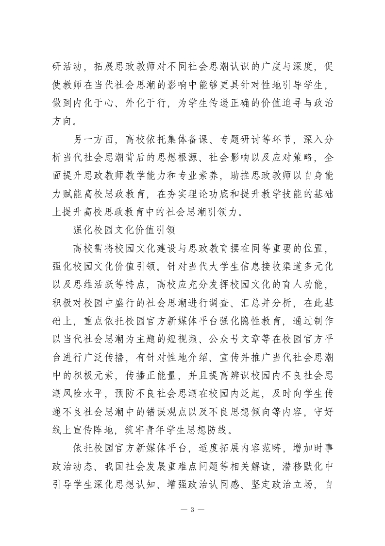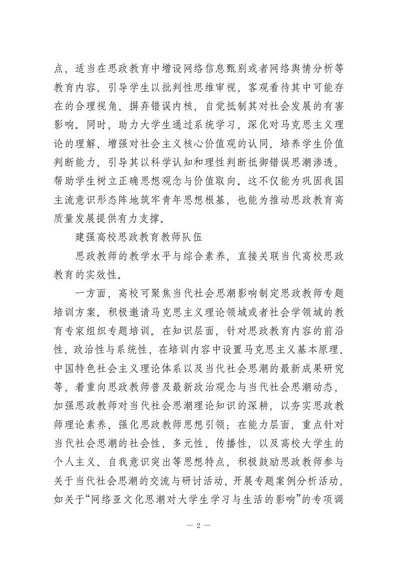 高校思政教育:在多元思潮中锚定价值航向当代社会思潮日益多元,不同观念交流碰撞的态势逐步显现。高校作为党的意识形态工作的前沿阵地,在引导学生辨析各类思潮、树立正确认知、坚定价值立场的过程中发挥着关键作用。面对新自由主义、历史虚无主义、实用主义等可能对大学生思想认知产生的影响,高校尤其需加强关注一一这类影响若缺乏及时有效地引导,可能给主流价值观的认同构建带来挑战,这也让高校思想政治教育工作在强化价值引领、凝聚思想共识、助力学生坚定理想信念方面的任务更显重要。优化高校思政教育内容高校应做好意识形态工作,着重以马克思主义的立场、观点以及方法为指导,融入马克思主义经典著作的文本研读专题课程。以《共产党宣言》为例,该著作是辨析社会思潮本质以及引领社会思潮的理论范本,阐述了唯物史观科学分析与批判错误思潮的重要价值以及独特视角。教师应引导学生将唯物史观视为“望远镜”与“显微镜”,并且运用《共产党宣言》中批判社会思潮的方法论,诸如辩证分析法、阶级分析法以及历史分析法等方法论,引导学生透过纷繁复杂的社会现象看清各种错误思潮的本质,增强学生对错误思潮的辨别力。在此基础上,教师应紧密结合时代发展脉搏与学生实际需求,将当代社会思潮中的热点话题或者现实问题,巧妙融入高校思政教育内容。同时,思政教师还应针对网络思潮传播的特1