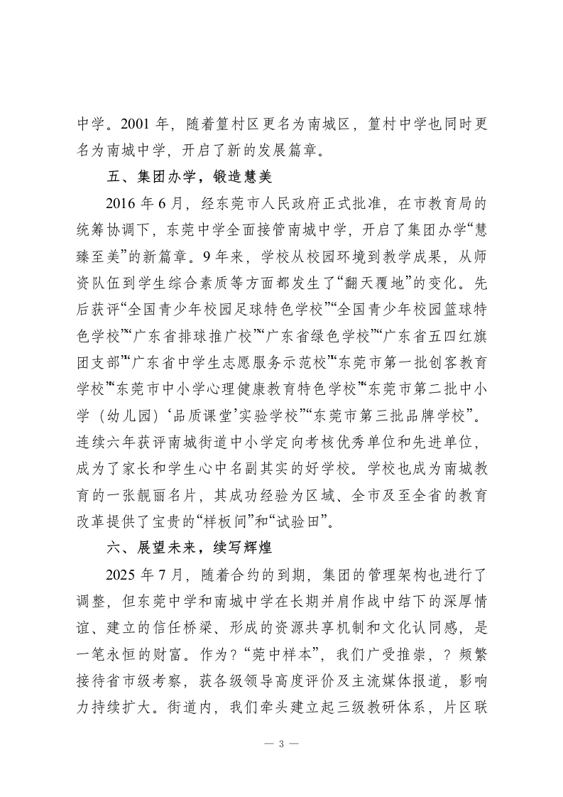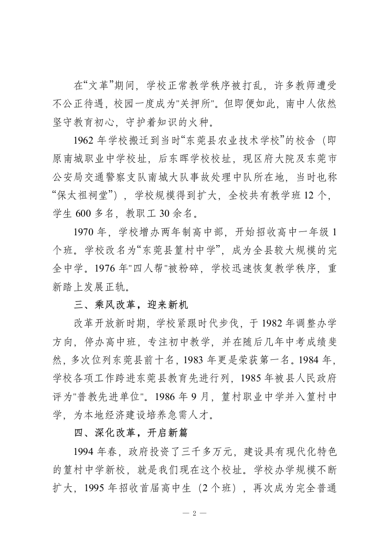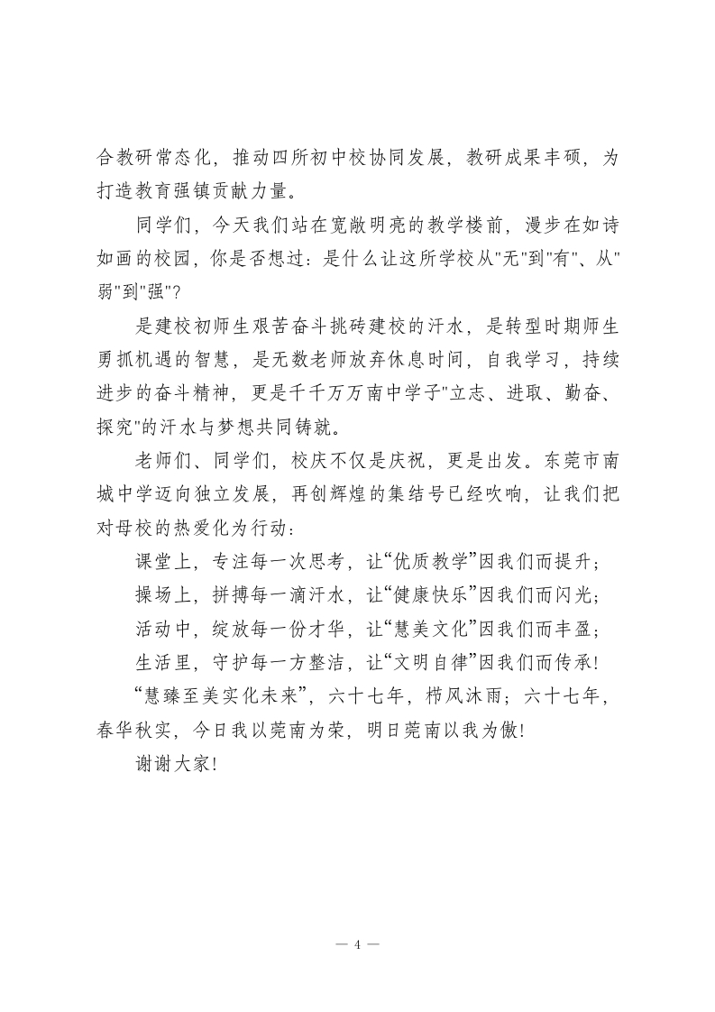 国旗下讲话:赓续荣光,砥砺前行一一献礼东莞市南城学校67周年校庆亲爱的老师们、同学们:大家早上好!今天,我们怀着无比自豪与激动的心情,在鲜艳的五星红旗下,共同迎来南城中学建校六十七周年的重要时刻。此刻,我们不仅是在庆祝学校的生日,更是在致敬一段薪火相传、砥砺奋进的教育征程!请大家随我一起回顾那段峥嵘岁月。一、回顾历史,致敬先辈穿越历史的烟云,回望1958年,南城中学的前身一东莞县篁村初中班,在亨美黄金园的一片荒地上诞生。那时,全校只有一个班,55名学生、2名教师。没有教室,借用祠堂上课;没有课桌,学生就自带床板、桌椅;学生上午学习文化课,下午在老师的带领下参加建校劳动。他们从恬甲砖瓦厂等地把砖瓦、木石等建筑器材挑回学校。通过师生的艰辛劳动,到12月初,一所新的学校建成了。仅有两间红砖平房,一间作教室,一间作老师的办公室和宿舍。如此艰苦的条件下,师生凭借着“教育报国”的信念,刻苦学习,在1959年全地区语文、数学统考中取得第一名的佳绩。此后,学校陆续获得“省先进集体”“省文教战线社会主义建设先进单位”等荣誉,从此勤劳、踏实、刻苦成为了南中人代代相传的基因。二、历经磨难,坚守初心一1