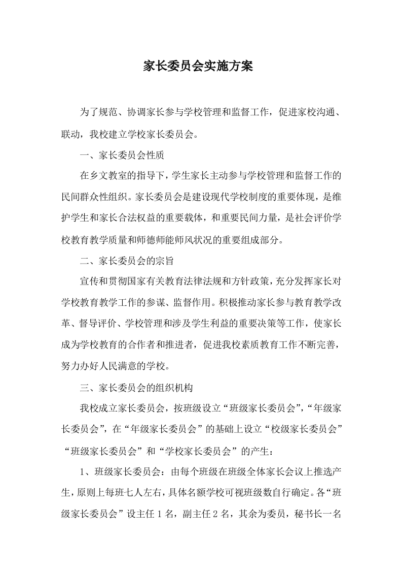 家长委员会实施方案为了规范、协调家长参与学校管理和监督工作,促进家校沟通、联动,我校建立学校家长委员会。一、家长委员会性质在乡文教室的指导下,学生家长主动参与学校管理和监督工作的民间群众性组织。家长委员会是建设现代学校制度的重要体现,是维护学生和家长合法权益的重要载体,和重要民间力量,是社会评价学校教育教学质量和师德师能师风状况的重要组成部分。二、家长委员会的宗旨宣传和贯彻国家有关教育法律法规和方针政策,充分发挥家长对学校教育教学工作的参谋、监督作用。积极推动家长参与教育教学改革、督导评价、学校管理和涉及学生利益的重要决策等工作,使家长成为学校教育的合作者和推进者,促进我校素质教育工作不断完善,努力办好人民满意的学校三、家长委员会的组织机构我校成立家长委员会,按班级设立“班级家长委员会”,“年级家长委员会”,在“年级家长委员会”的基础上设立“校级家长委员会”“班级家长委员会”和“学校家长委员会”的产生:1、班级家长委员会:由每个班级在班级全体家长会议上推选产生,原则上每班七人左右,具体名额学校可视班级数自行确定。各“班级家长委员会”设主任1名,副主任2名,其余为委员,秘书长一名