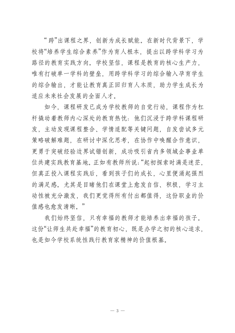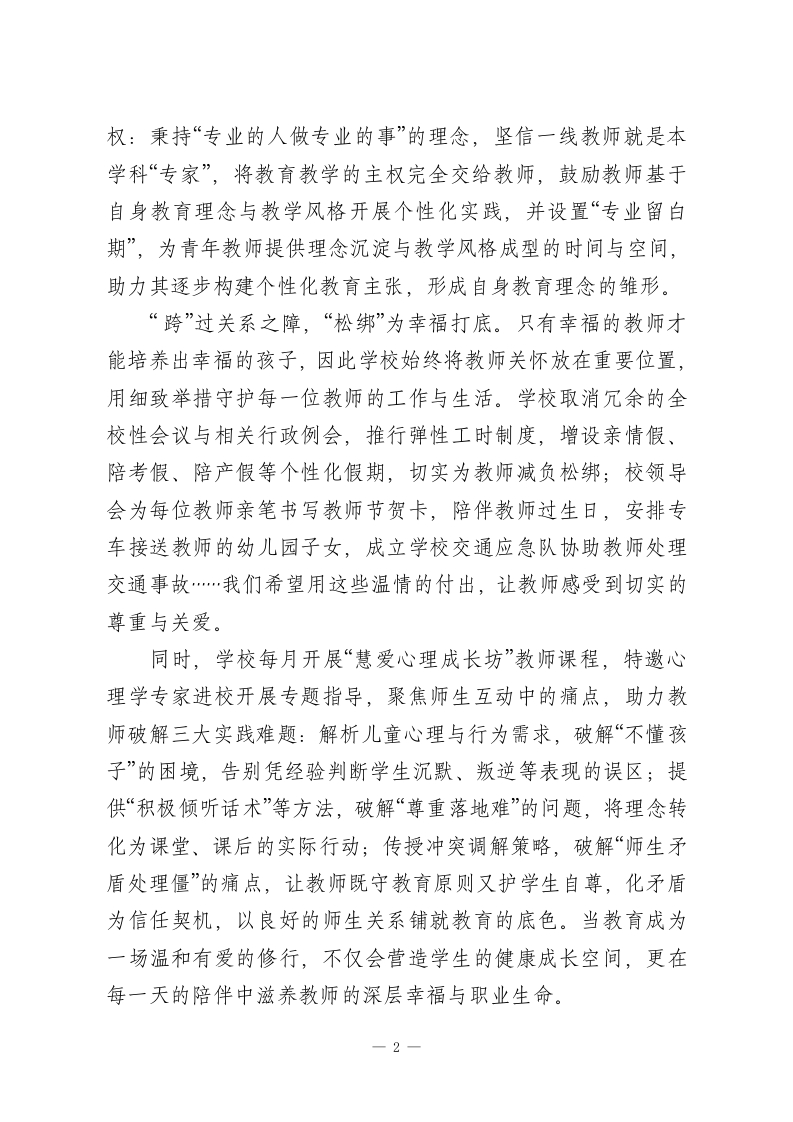 教师会议上校长讲话:让教师自主“跨”向成长的幸福教育的生命力,源于教师内心的光芒与温度。7年前建校伊始,我们便确立了“去功利化”的办学定位,致力于共建师生幸福成长的家园,这为后续系统化推进教师队伍建设奠定了坚实基础。然而,理想与现实之间往往存在沟壑。20XX年,学校管理出现瓶颈一一教师队伍以青年教师为主,虽具备较强的执行力与工作热情,呈现“指令响应型”的高效工作状态,但深层问题逐渐凸显:教师自主发展意识薄弱,专业成长缺乏内生动力。如何破解“执行有余而创造不足”的发展困境,成为学校亟待突破的核心课题。学校从理念更新入手,组织教师研读教育类书籍,同时打破校园“围墙”,跨界参访海尔集团、阿里巴巴、字节跳动等知名企业,借鉴企业“扁平化管理“服务型组织”的先进理念,将企业凝聚人心、激发员工内驱力的方法逐步迁移应用到学校教师队伍建设中。“跨”越治理之难,自主为专业增值。学校以组织结构优化为切入点,推行“服务型扁平化治理”模式,将行政职能从“管理”转向“服务”。行政部门统揽事务性工作,把一线教师从繁杂的非教学事务中解放出来,使其预留充足时间沉浸式投入教育教学。同时,学校实施年级主任自治,赋予级部充分的决策自主-1