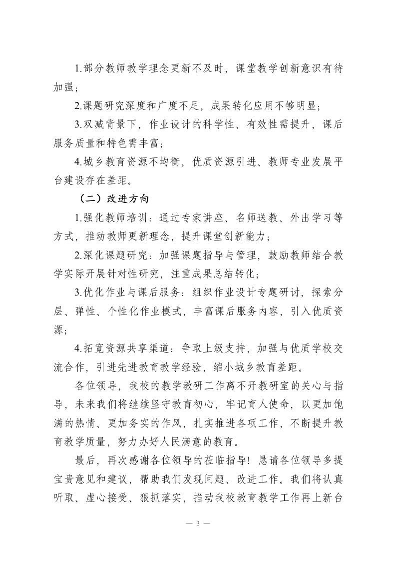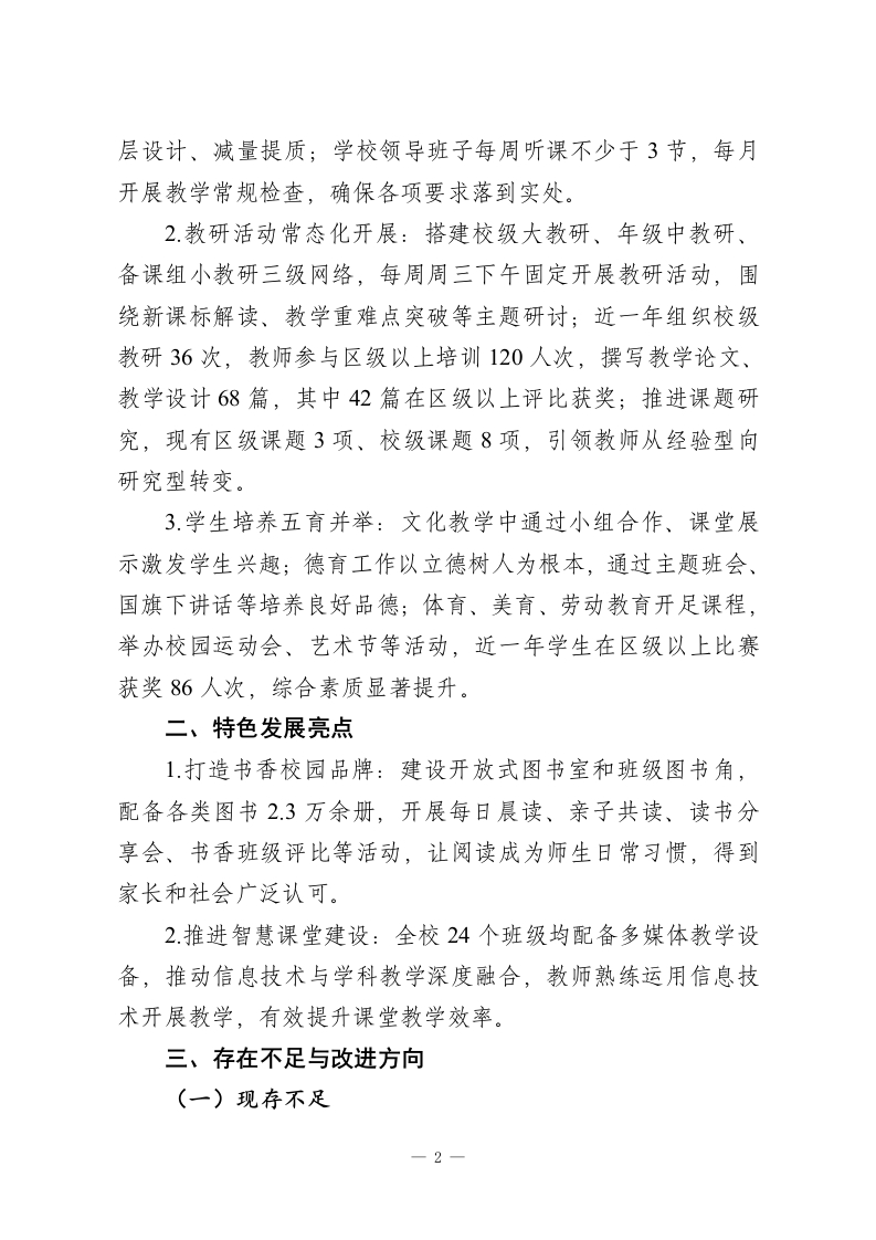 教研室领导视察学校,小学校长汇报发言:更加务实的作风,扎实推进各项工作尊敬的教研室各位领导:大家上午好!首先,我代表XX小学全体师生,向各位领导在百忙之中莅临我校指导教学教研工作,表示最热烈的欢迎和最衷心的感谢!一直以来,教研室的悉心指导与精准引领,是我校教育教学质量稳步提升的重要保障。今天各位领导的到来,既是对我们过往工作的检阅,更是对我们未来发展的鞭策,下面我将从三个方面向各位领导作详细汇报。一、学校基本情况与教学教研基础工作我校创办于1995年,是一所具有28年办学历史的全日制公办小学。目前全校共有24个教学班,在校学生1120名,教职工92名,其中专任教师85名,市级骨干教师6名,区级骨干教师15名,教师队伍平均年龄35岁,整体呈现结构合理、朝气蓬勃、爱岗敬业的良好态势。学校占地面积8600平方米,建筑面积5200平方米,配备标准化教室、实验室、图书室等功能场馆,教学设施设备齐全,为教育教学提供坚实保障。在教学教研基础工作中,我们始终坚持以生为本、以研促教、质量立校的核心理念,扎实推进各项工作:1.常规管理落地见效:严格落实课程计划,开齐国家规定课程,增设书法、阅读等特色校本课程;建立备课一上课一作业一辅导一评价全流程管理制度,要求教师备教材、备学生、备教法、备学法,课堂注重互动生成、因材施教,作业实行分1-