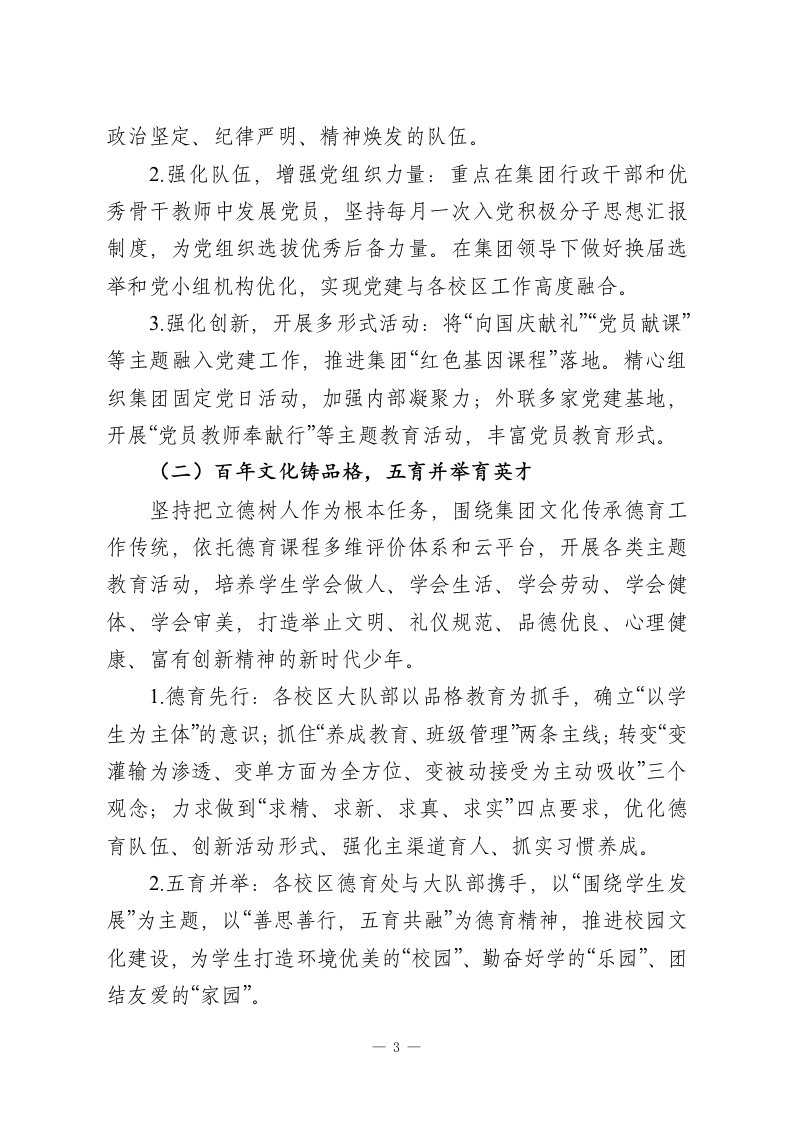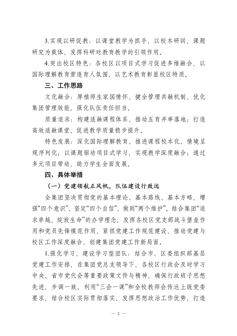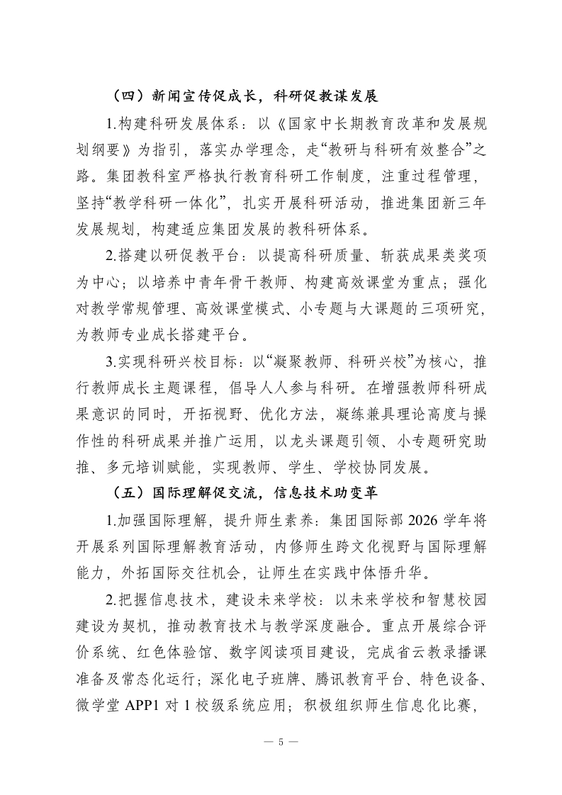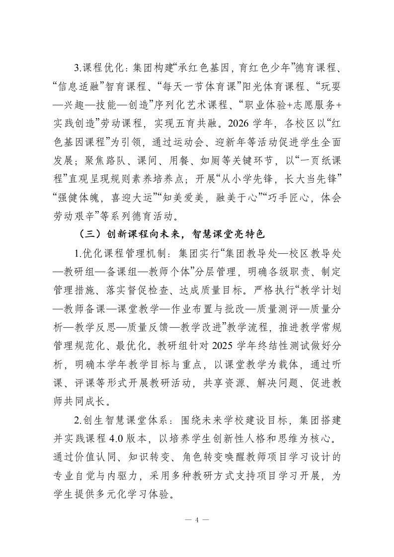 教育集团化学校2026学年工作计划“凡事预则立,不预则废”。2025学年,集团各校区紧紧围绕“立德树人”根本任务,推进课程建设,在民主管理、德育实践、教学改革和未来学校建设等领域取得显著成果。站在2026学年的新起点,集团将聚焦品质提升与创新探索,以提高教育教学质量为核心,统领教学教研工作,加大课程改革力度,提升课程实施水平,创新未来学校建设举措。结合各校区实际情况,制定本学年工作计划。一、指导思想在《关于深化教育教学改革全面提高义务教育质量的意见》及相关精神指导下,坚持以党建为引领,带动共青团、少先队协同发展,深入贯彻党的教育方针,落实立德树人根本任务。遵循教育规律,强化教师队伍基础作用,围绕凝聚人心、完善人格、开发人力、培育人才、造福人民的工作目标,发展素质教育,培养德智体美劳五育并举、全面发展的社会主义建设者和接班人。以新课程下的课堂教学研究与实践为核心,抓实基础教育课程改革,实现集团高位发展、教师专业进阶、学生核心素养有效落地。二、工作目标1.传承集团文化:融通各校区管理机制,强化办学标高,突出价值追求,凝聚队伍合力。2.提升育人质量:围绕五育融合优化课程建设,聚焦学生素养优化学科教学,持续提升绿色教育质量。1