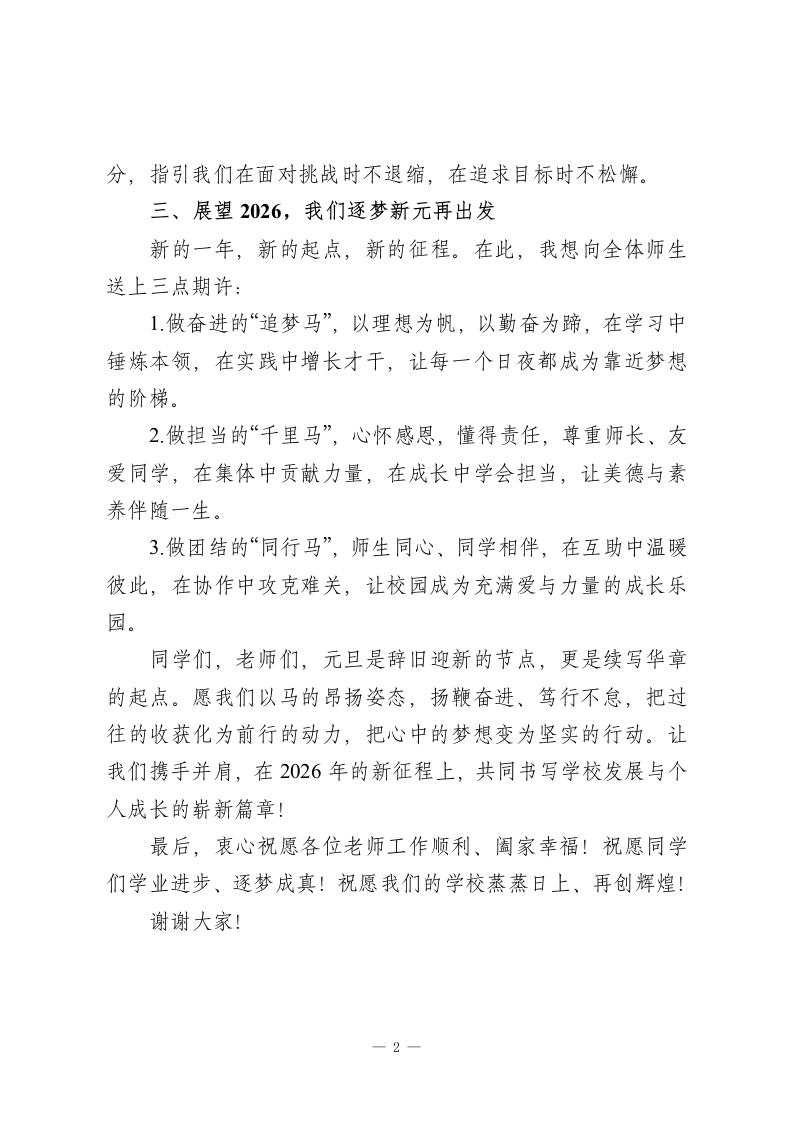 骏马迎春启新程,逐梦笃行向未来2026年元旦德育主任国旗下讲话稿尊敬的各位老师,亲爱的同学们:大家早上好!当五星红旗迎着朝阳冉冉升起,当新年的钟声即将敲响,我们满怀喜悦与憧憬,共同迎来了2026年马年元旦。今天,我们以“骏马迎春,逐梦新元”为主题,在国旗下集结,既是对过往一年的回望,更是对崭新征程的启航。一、回望2025,我们同心筑梦显担当过去的一年,是学校与全体师生共同成长的一年。课堂上,同学们勤学善思、奋勇争先,用知识浇灌梦想;校园里,老师们深耕细研、润物无声,用爱心护航成长。我们见证了同学们在各类活动中绽放风采,在志愿服务中传递温暖,在团结协作中凝聚力量;也见证了学校在教育教学、校园建设等方面的稳步推进,每一份成绩的取得,都离不开师生们的并肩奋斗与不懈坚守。二、致敬马年,我们传承精神勇奋进2026年是充满力量与希望的马年。马,象征着奋进不息的姿态、担当有为的精神、一往无前的勇气。“龙马精神”是中华民族刻在骨子里的坚韧,“马到成功”是我们对梦想的执着追求,“千里马”的典故更告诉我们,唯有坚持与积累,才能绽放光芒。这些与马相关的文化内涵,正是我们成长路上最珍贵的精神养1