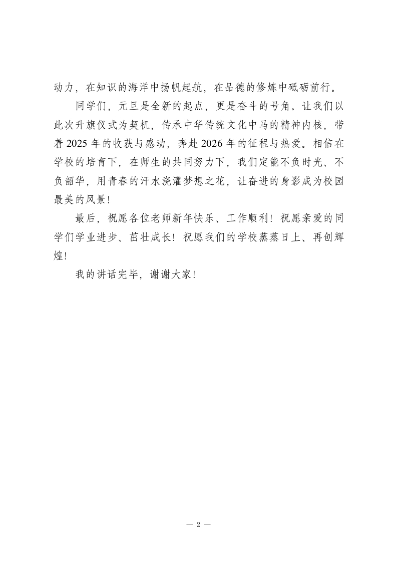 骏马迎春逐梦行,新元启航向未来2026年元旦学生代表国旗下讲话稿尊敬的各位老师,亲爱的同学们:大家早上好!当五星红旗迎着朝阳冉冉升起,当新年的钟声即将敲响,我们满怀憧憬迎来了2026马年元旦。在这辞旧迎新的美好时刻,我有幸作为学生代表站在这里,与大家共同分享成长的喜悦,共赴新岁的邀约。回首2025,我们在校园的沃土上深耕不辍。课堂上,我们求知若渴、积极思辨;运动场上,我们挥洒汗水、奋勇争先;中队活动中,我们分享感悟、凝聚情谊。是老师的悉心教海,如春雨般滋润我们成长;是同学的并肩同行,如暖阳般照亮追梦之路;更是学校搭建的多元平台,让我们在实践中收获本领、在探索中学会担当。这一年的每一份进步,都离不开陪伴与支持,每一次成长,都镌刻着奋进的印记。2026年是充满力量与希望的马年。马,象征着奋进不息、勇往直前的精神,“龙马精神“马到成功”的美好寓意,正是我们少年学子应有的模样。新的一年,我们要以骏马为榜样,怀揣梦想、脚踏实地:在学习上,发扬“一马当先”的进取精神,攻克难关、勤思善学;在品格上,秉持“马不停蹄”的坚持,感恩他人、团结互助;在成长中,拥有“策马扬鞭”的勇气,勇于突破、不负韶华。让我们把新年愿望写进行动,把青春誓言化为1