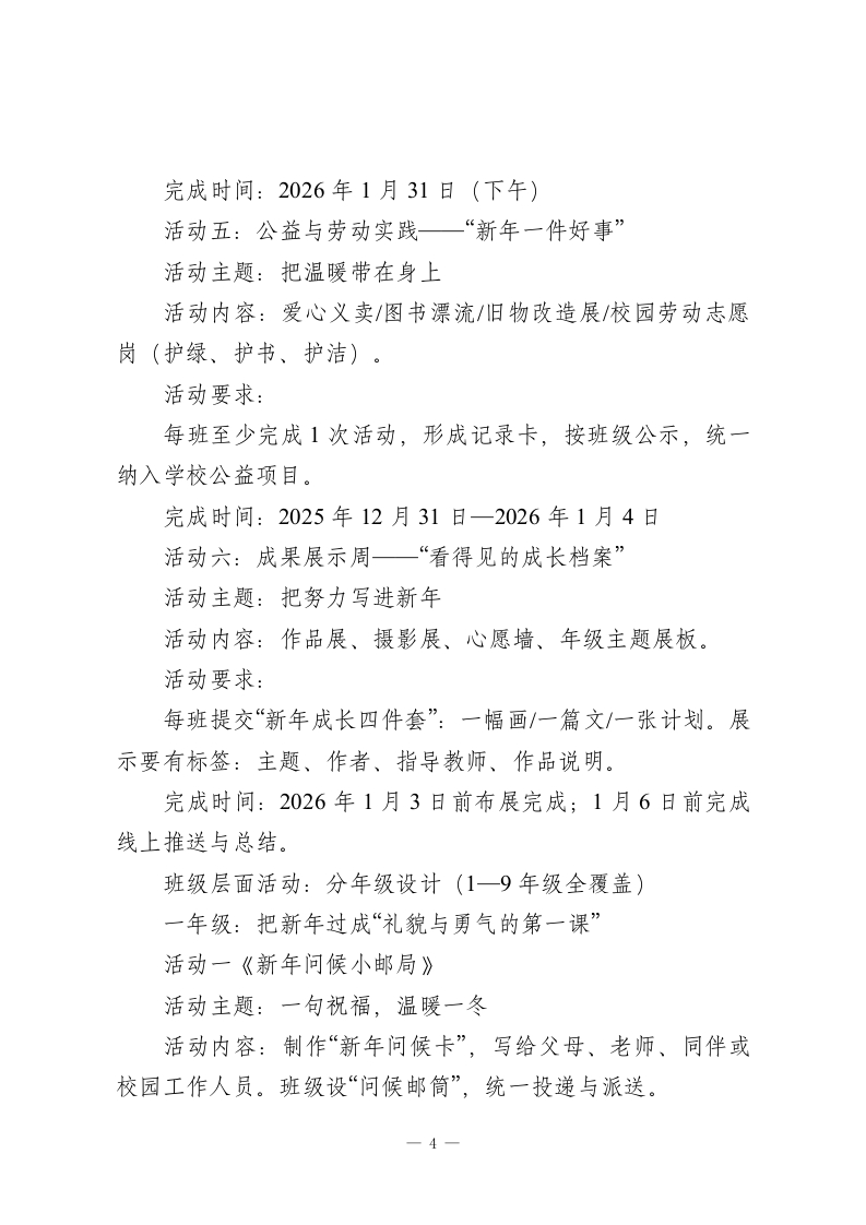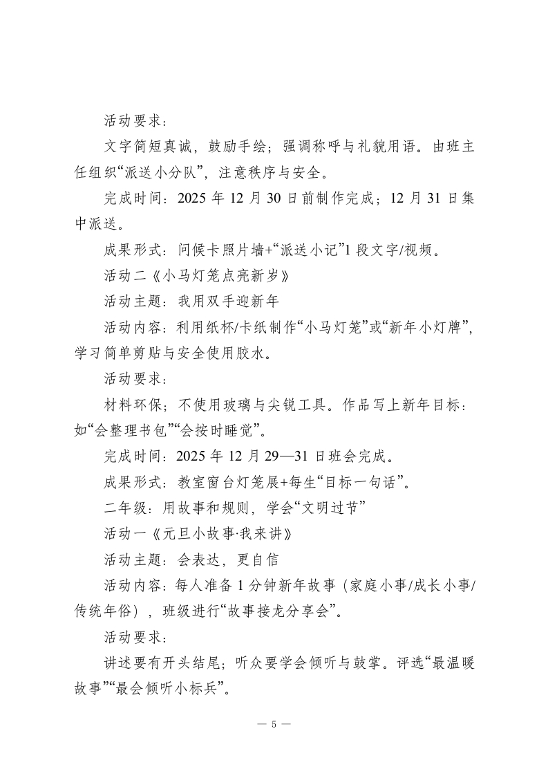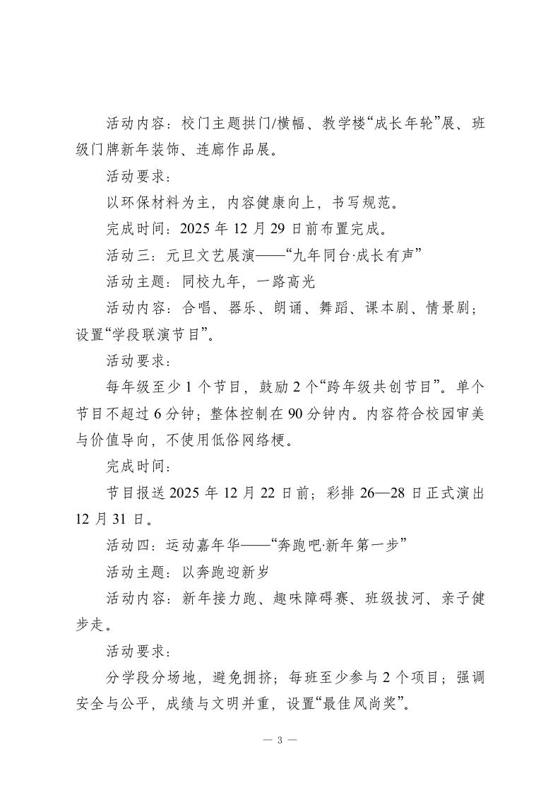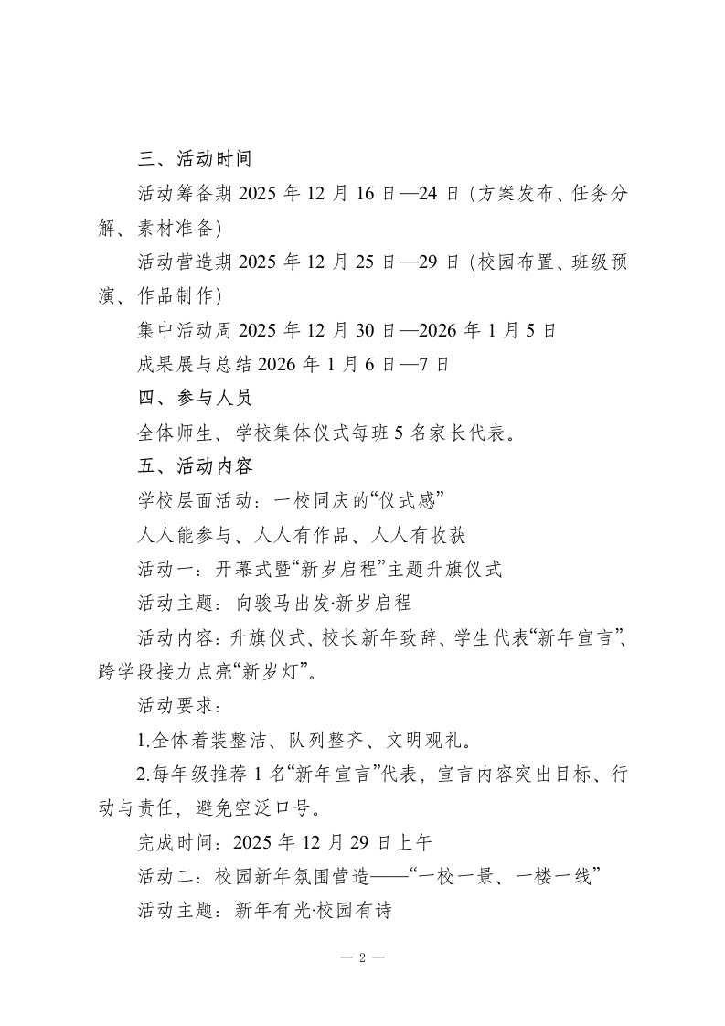 马踏新程·新年有光·少年有为学校2026元旦文化节育人活动方案新年的钟声,是时间的刻度,更是成长的号角。2026马年象征奋进、向上与担当,正契合青少年在成长阶段所需要的精神。我们既要把元旦办得有温度、有仪式,也要办得有目标、有收获。本次元旦主题活动以“向骏马出发·新岁启程”为主线,安排“学校统筹、年级分层、班级落地、成果可见”的活动,将节日庆祝与德育实践、学科融合、劳动教育、安全教育有机融合,推动每一名学生在参与中学会表达、学会合作、学会感恩,在新年的起点迈出更坚定、更自信的第一步。一、活动主题马踏新程·新年有光·少年有为(年级口号:向骏马出发,新岁启程/一路奔跑,不负热爱,共赴新程)二、四维一体活动目标1.文化浸润:了解元旦与传统年俗、礼仪文化,形成节日审美与文明表达。2德育落地:以“自律、责任、感恩、合作”为抓手,构建成长行为目标。3学段融通:突出“同校同乐同成长”,打造跨年级互动与成长仪式。4.学科融合:让活动兼具知识性与探究性,形成作品、展示与表达成果。一1