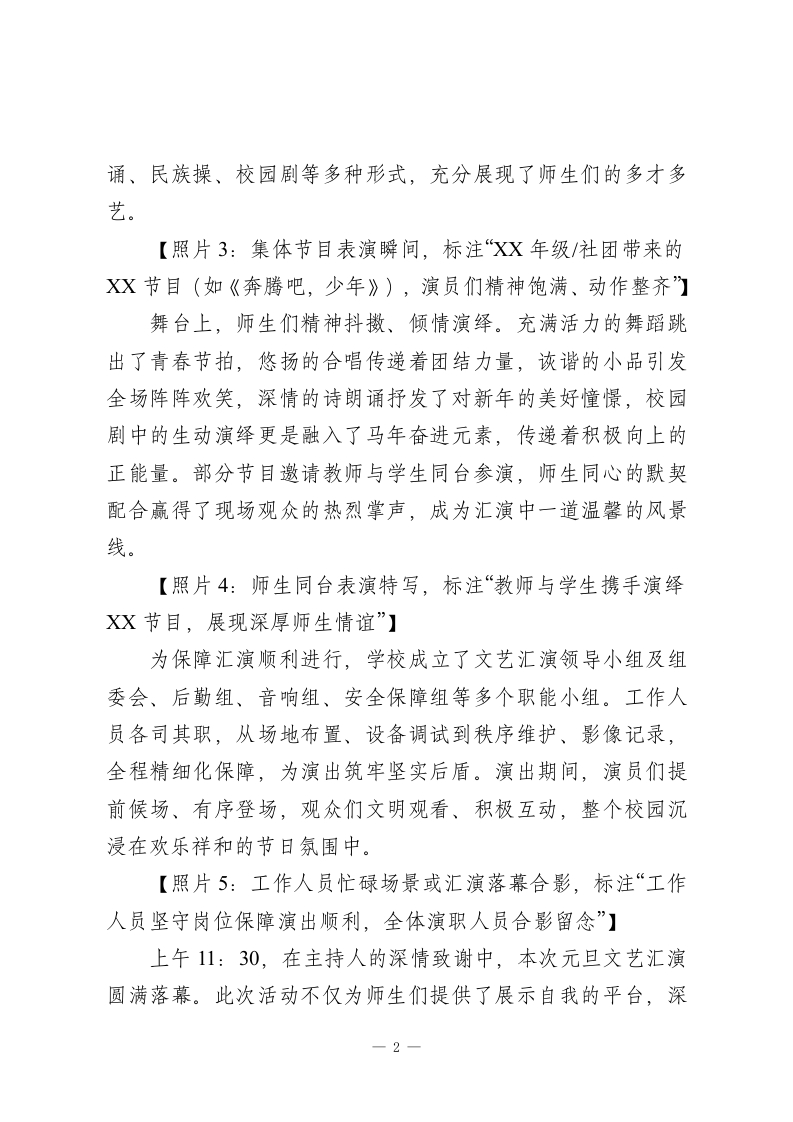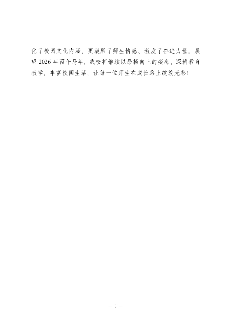 马跃新程启华章,师生同心迎元旦我校2026年元旦文艺汇演圆满落幕岁未寒冬暖意浓,欢歌笑语庆新年。2025年12月31日上午9:00,我校操场内彩旗飘扬、掌声雷动,“马跃新程启华章,师生同心迎元旦”2026年马年元旦文艺汇演在此隆重举行。全体师生欢聚一堂,以多元创意的艺术形式辞旧迎新,展现校园文化活力与师生奋进风采。【照片1:文艺汇演全景图,标注“操场内座无虚席,师生们满怀期待观看演出”】本次汇演以马年文化为底蕴,紧扣“奋进、拼搏、团结”的核心精神,是学校深化校园文化建设、展示课后服务丰硕成果的重要载体。活动自2025年11月启动以来,得到各年级、各延时服务社团的积极响应。经过12月15日前的年级海选、12月20日的节目终审及多轮彩排,一批主题鲜明、形式多样的优质节目脱颖而出,为现场观众带来了一场视听盛宴。【照片2:校长致辞场景,标注“校长XXX发表新年贺词,向全体师生送上殷切祝福”】上午9时许,汇演在主持人热情洋溢的开场语中拉开序幕。校长XXX发表新年贺词,回顾学校年度发展成果,向辛勤耕耘的教职工和奋发向上的学子们致以节日问候,并鼓励全体师生以龙马精神砥砺前行,共同谱写学校高质量发展新篇章。随后,文艺节目按序登场,涵盖舞蹈、合唱、小品、相声、配乐诗朗1