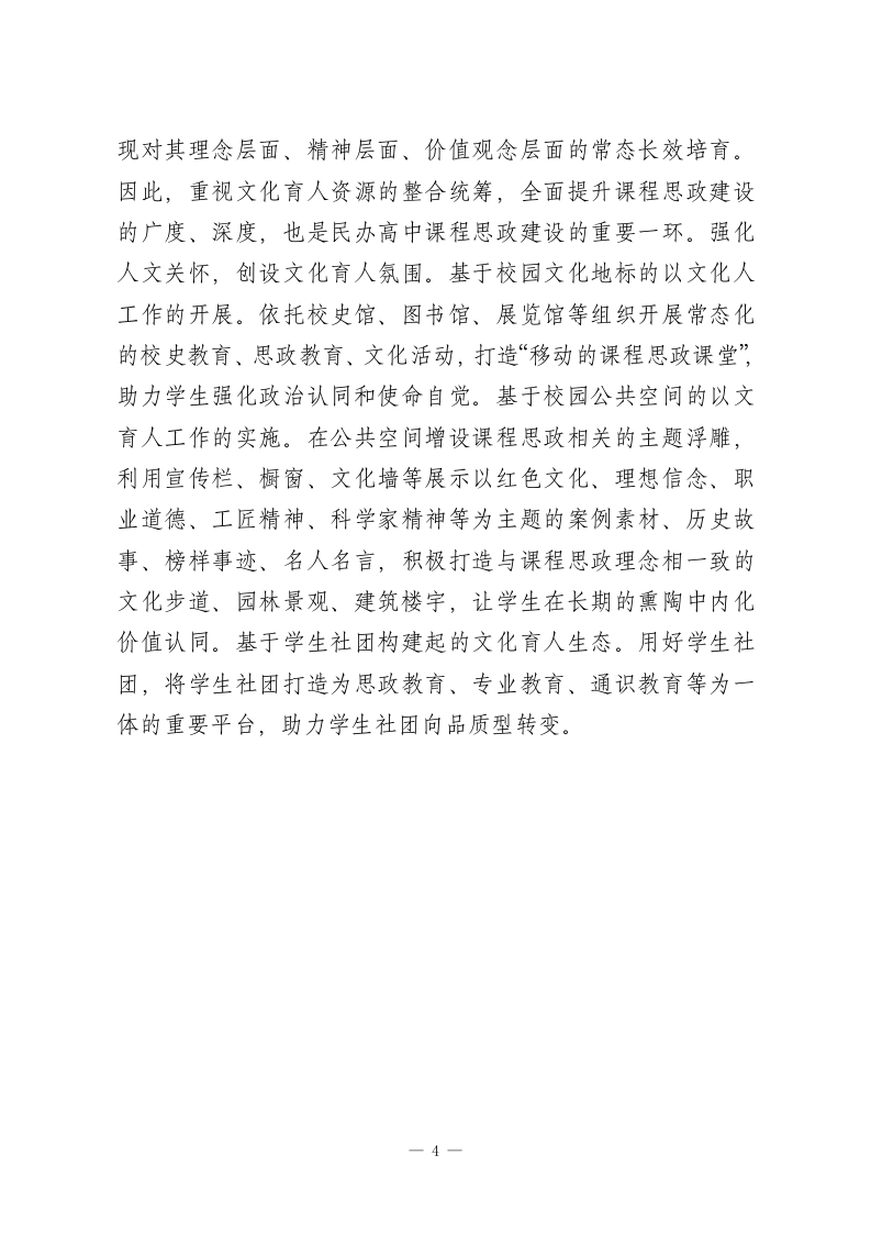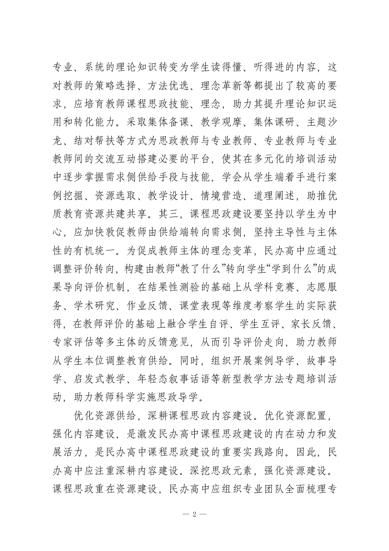 民办高中创新课程思政建设的路径探索推动思政课建设守正创新,贯彻落实课程思政建设要求是民办高中面临的一项时代课题。积极推动课程思政建设,为时代新人的培养提供多维递进的支持体系,构建全过程、全方位学生价值生成的育人新模式,将德育元素深度嵌入专业课程之中,才能为新时期的课程思政建设工作注入强劲动力。推进主体建设,保障课程思政建设高效推进。教师作为落实课程思政建设的关键主力,其理论储备、思想认识、人格魅力、道德品质对课程思政的内涵式发展至关重要。锚定这一关键主体,加强队伍培育,提升教师思政素养,助力其坚守在思政引领、价值导向、人格培育等方面的主体地位是课程思政建设的重要一环。聚焦队伍建设,深耕素养培育。其一,课程思政建设重在价值引导,思政引领力、理论阐述力、话语表达力是教师扎实理论储备的外在表现,应培育教师理论素养、认知结构,助力其修炼“内功”,强化课程思政师资保障。民办高中应面向全体教师组织开展线上线下的理论宣讲、知识培训,构建覆盖教师职业生涯发展周期的理论知识供给体系,助力其涵养理论素养。民办高中还应为教师的自我提升、自我教育提供全方位支持,采取设立专项教育基金、加强正面典型选树等手段鼓励其进行在职学历提升、访学进修。同时,民办高中还应建立健全动态监测体系,加强定期考核,以实现对教师理论素养和知识储备的持续监测,从而促使其养成不断进行自我提升的学习习惯。其二,课程思政建设价值引领的关键是将枯燥、1-