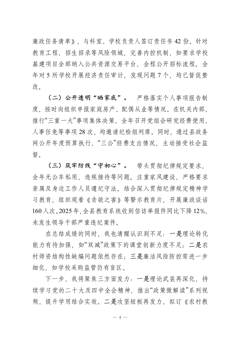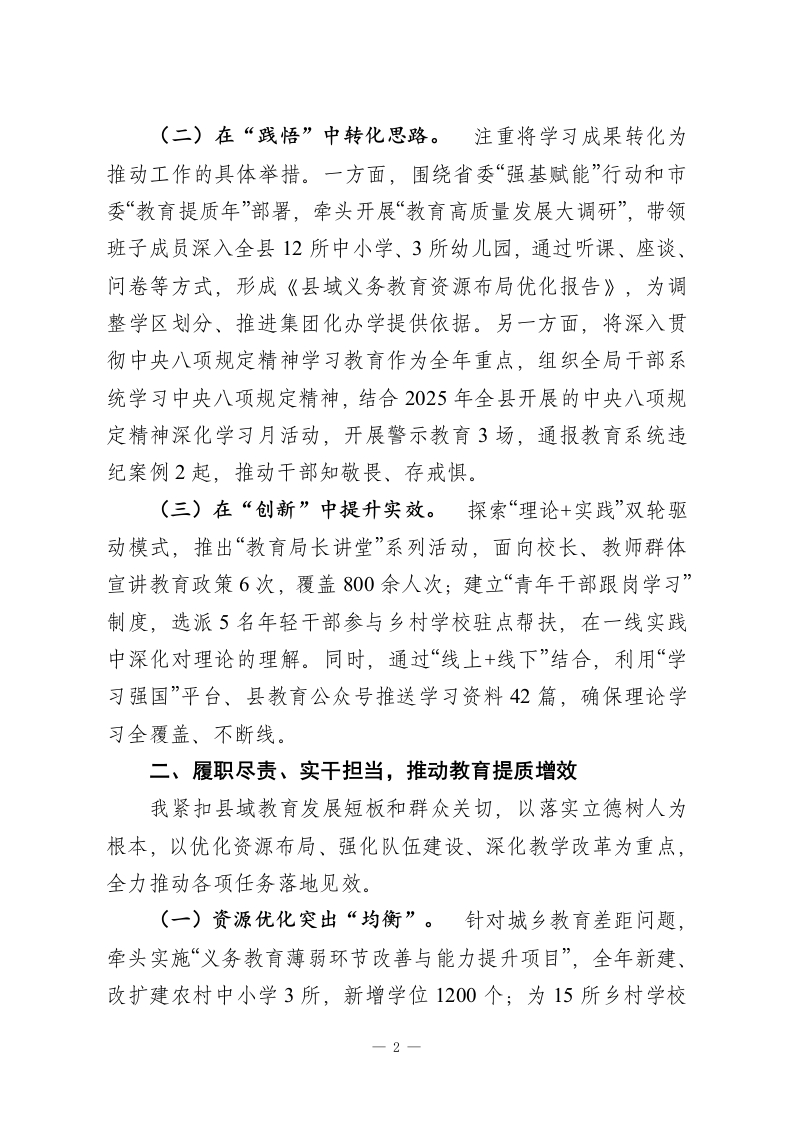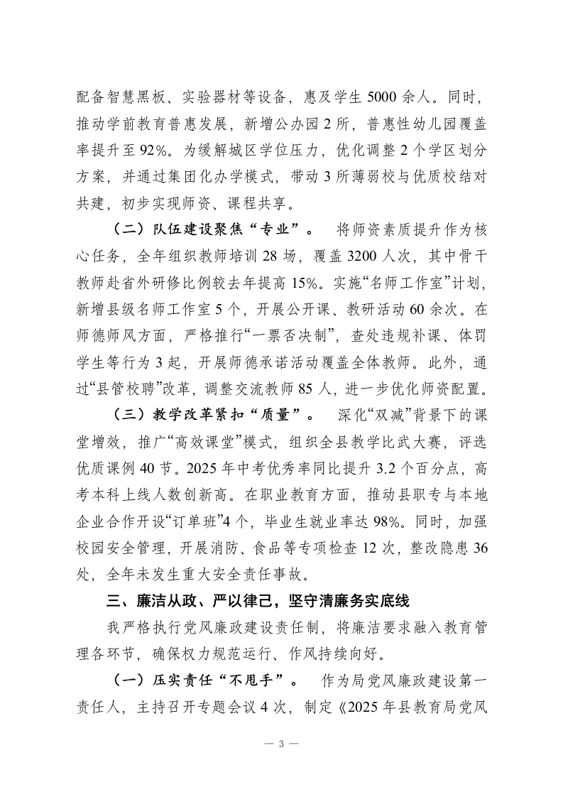 某县教育局局长2025年述职报告根据县委、县政府关于年度考核工作的要求,现将本人2025年履行岗位职责、加强理论学习、落实廉洁自律等情况报告如下。本年度,我坚持以习近平新时代中国特色社会主义思想为指导,深入贯彻党的二十大及二十届三中、四中全会精神,紧紧围绕“办好人民满意的教育”目标,以推动县域教育高质量发展为主线,统筹教育改革、队伍建设、安全稳定等重点工作,努力实现理论学习与教育实践深度融合、廉洁自律与履职尽责同步推进。一、以学铸魂、以知促行,筑牢思想理论根基我始终将理论学习作为提升政治素养、指导教育实践的首要任务,通过系统学习党的创新理论、中央重大部署和教育方针政策,不断增强政治判断力、政治领悟力、政治执行力。(一)在“深学”中把准方向。坚持把学习贯彻习近平新时代中国特色社会主义思想作为全年学习主线,通过局党组中心组学习、专题研讨、个人自学等形式,系统学习党的二十大报告、习近平总书记关于教育的重要论述以及2025年中央经济工作会议中关于“推动义务教育优质均衡”等新要求。全年组织党组理论学习12次,撰写学习笔记5万余字,牵头制定《县教育局2025年理论学习计划》,确保学习内容与中央精神、教育实际紧密结合。例如,针对“双减”政策深化落实,组织科室负责人专题学习教育部《校外培训行政处罚暂行办法》,并结合本县实际修订课后服务实施方案,推动政策落地不走样。—1