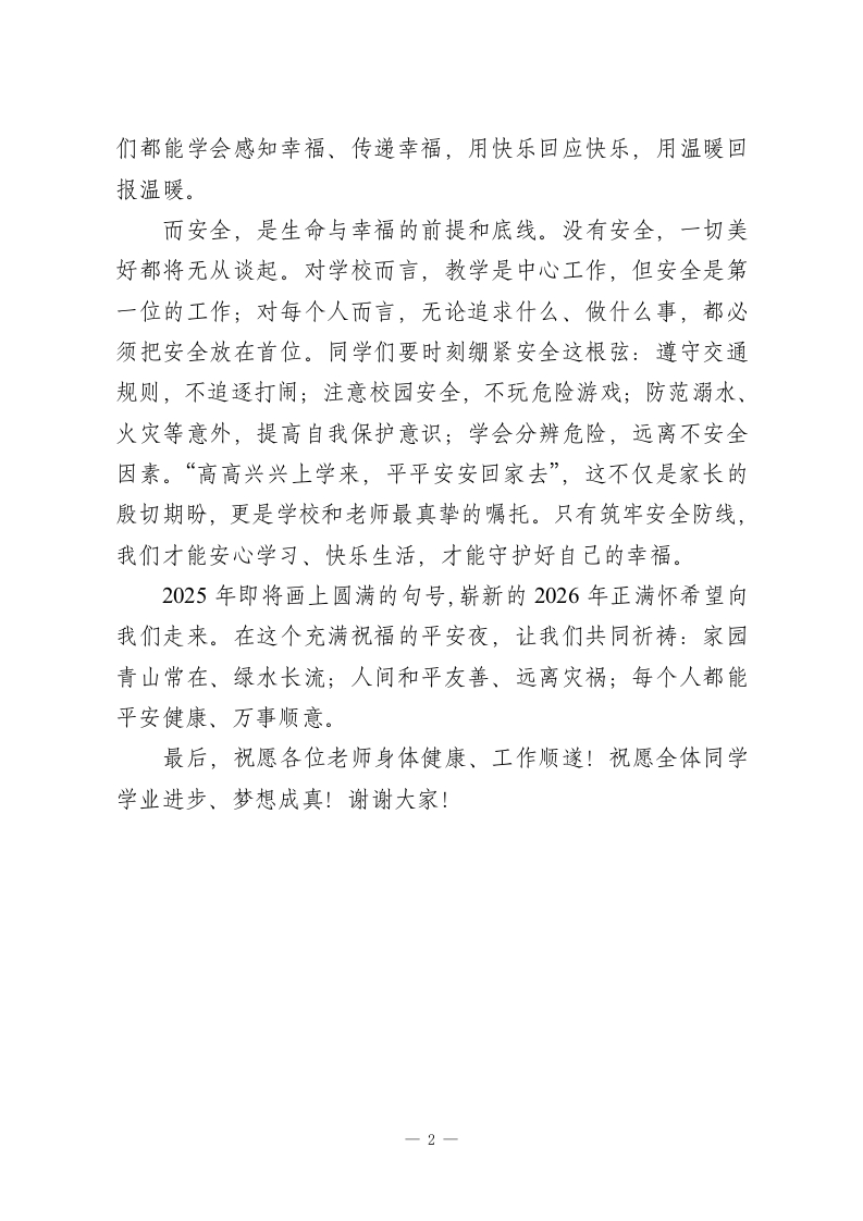 平安夜校长国旗下讲话:珍爱生命,守护幸福,筑牢安全尊敬的各位老师、可爱的同学们:大家好!伴着冬日的暖阳,平安夜的温馨氛围悄然弥漫。这个承载着“平安”美好寓意的节日,早已跨越国界,成为人们传递祝福、寄托期盼的契机。今天,我想借着这份祥和,与大家一同探讨生命、幸福与安全这三个沉甸甸却又温暖的话题。生命是世间最珍贵的馈赠,每个人都仅有一次,既坚韧又脆弱。它能抵御风雨洗礼、承载艰难困苦,却也可能在意外面前不堪一击。我们无法延长生命的长度,但可以用心拓展它的宽度与厚度。同学们正处在人生的黄金学习期,记忆力、求知欲、行动力都处在最佳状态,这正是积累本领、塑造人格的关键阶段。希望大家树立远大理想,珍惜分分秒秒,在博览群书中学知识,在实践历练中强本领,在与人相处中修品德,让生命的每一天都充满意义,让青春的岁月绽放独特光彩。幸福从来都不是遥远的奢望,它就藏在我们身边的点滴日常里。是父母含辛茹苦的养育,是放学回家时热腾腾的饭菜;是风雨中家人的嘘寒问暖,是节假日里能亲切喊出“爸“妈”的温暖;是坐在窗明几净的教室里学习,是老师毫无保留的授业解惑;是快乐时有人分享,是困境时有人分担。幸福不是一个静止的结果,而是一段充满温度的经历,它藏在我们的努力学习中,藏在彼此的真诚相待里,藏在无私的付出与奉献中。愿我1