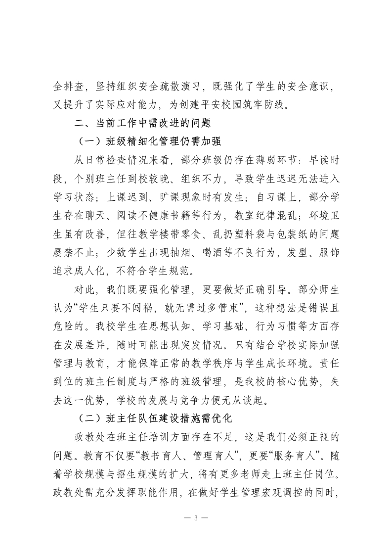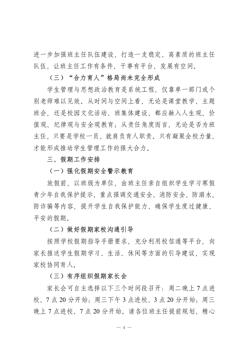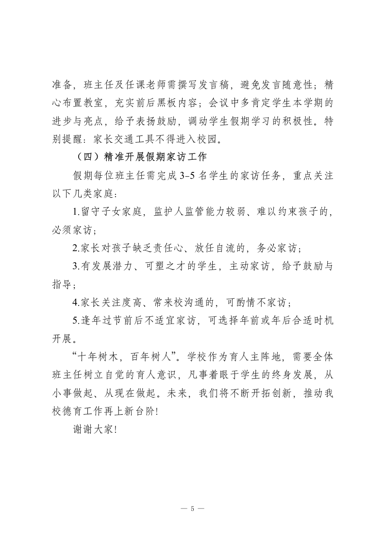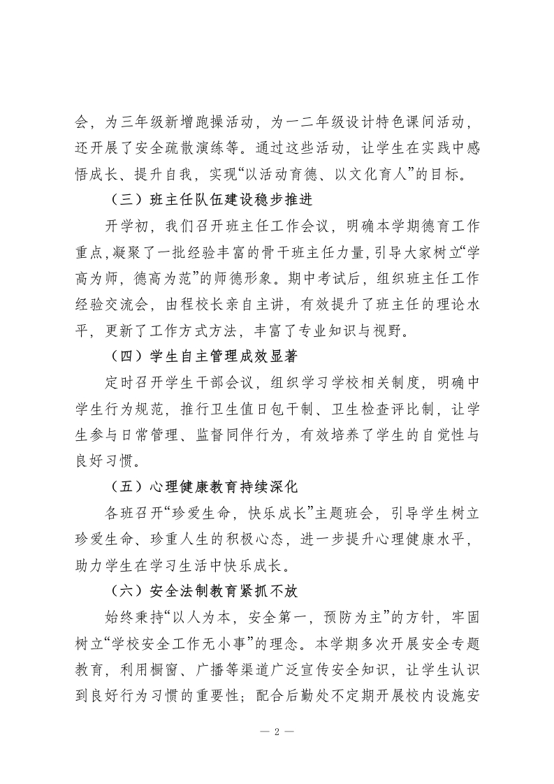 期末班主任会议校长讲话:着眼终身发展,筑牢育人根基尊敬的各位老师:大家下午好!本学期即将落幕,本学期政教处在学校统一部署下,紧紧围绕中心工作,以创建平安校园为动力,以提升学生文明素质为重点,以社会主义核心价值观为指导,坚持以德治校、注重养成教育,以“让学生学会做人”为落脚点,将学生素质可持续发展作为德育核心追求,组织开展了一系列丰富多彩的德育活动,全面提升了学校德育工作水平与学生思想道德素质。下面,我对本学期工作进行总结,并对后续工作提出要求:一、本学期班主任工作简要回顾(一)常规管理扎实落地各班结合学生管理考评细则,将行为规范教育落到实处。各位班主任早来晚归、恪尽职守,主动深入学生中间,加强沟通交流,全面了解学生学习生活状况。大家在承担备课、上课、批改、辅导等教学任务的同时,还投入大量精力开展班级管理,在此,我代表学校向大家的辛勤付出与对政教处工作的大力支持,表示衷心的感谢!(二)主题活动亮点纷呈本学期以主题活动为德育切入点,将道德教育融入活动之中,彰显时代气息。我们组织了系列主题班会、趣味体育运动一1