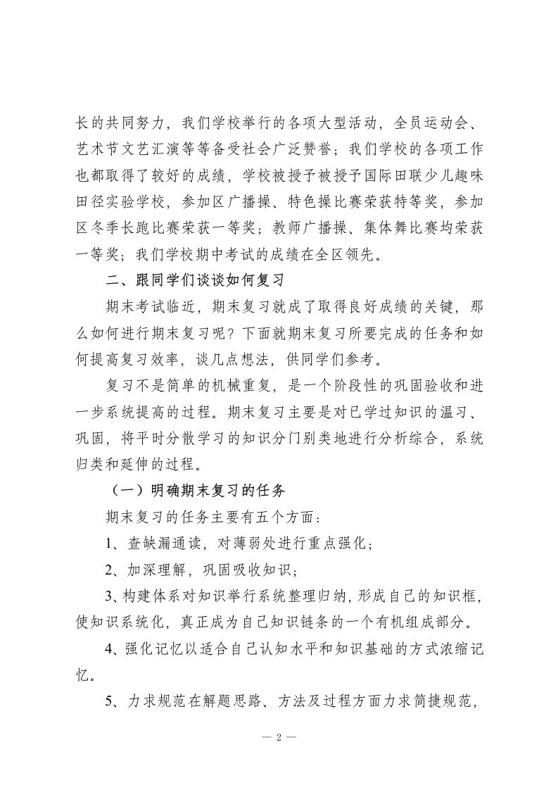 期末复习备考家长会上,校长发言先跟学生谈如何复习,再对家长说怎么做后盾尊敬的各位家长、各位朋友,同学们:大家好!在此,我代表学校,向各位家长的如期到来表示衷心的感谢和诚挚的欢迎。你们的到来,让严寒时节的校园弥漫着温暖,让冰天雪地包裹着的教室流淌着感动。相信,你们的行动是对学校每一位教师辛勤工作的最好褒奖。我今天的讲话主要有三方面的内容:一是向各位家长汇报一下我们学校本学期的重点工作及学校的发展情况;二是与同学们交流一下怎样做好期末复习并在期末考试中取得优秀的成绩;三是与各位家长朋友们交流探讨如何帮助孩子做好期未复习并取得好成绩,怎样做好孩子的后盾。一、学校主要工作和成绩回顾:各位家长朋友们,我们一起走送走了2023,迎来了2024,一起走过了4个多月。在这4个多月了里,我们一起见证了孩子的成长和进步。运动场上,不再是一个娇滴滴的小姑娘、松散散的小伙子,你们勇敢拼搏、奋发向上,团结合作、遵纪守则、为班级争光;艺术节文艺汇演的舞台上,你们载歌载舞,唱响青春;课堂上,你们认真听讲、积极发言、思维活跃、勇争先进。我们在你们身上看到了青春的魅力,听到了生命拔节的声音,感受到了学校生活的快乐。通过我们同学、教师和家1-