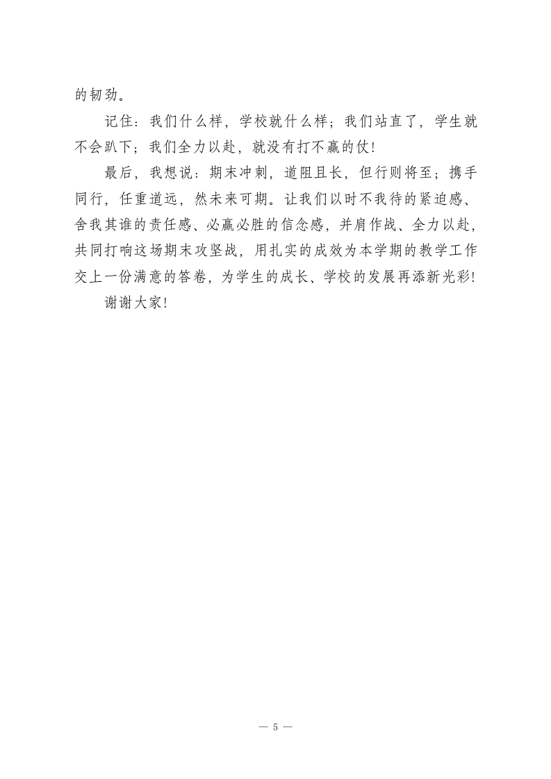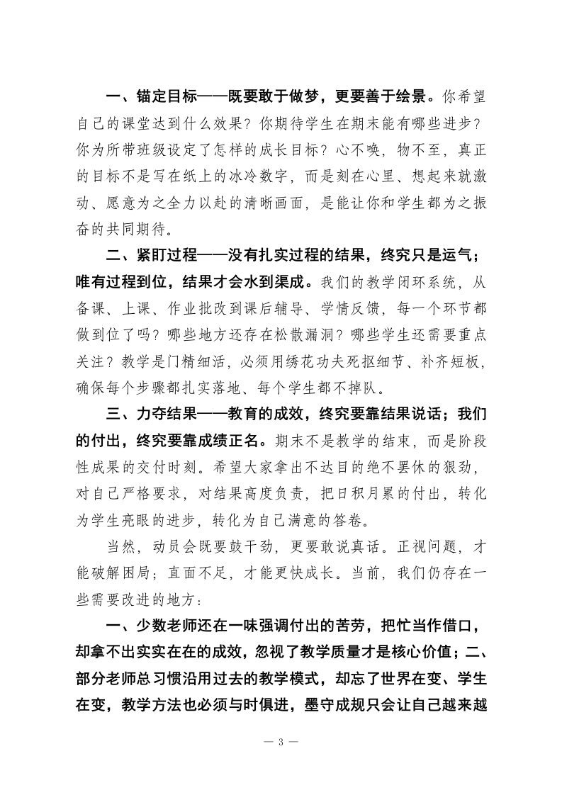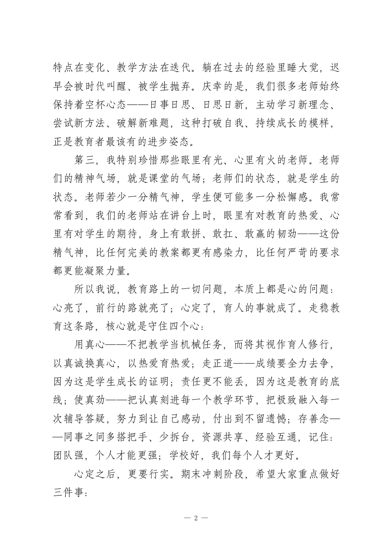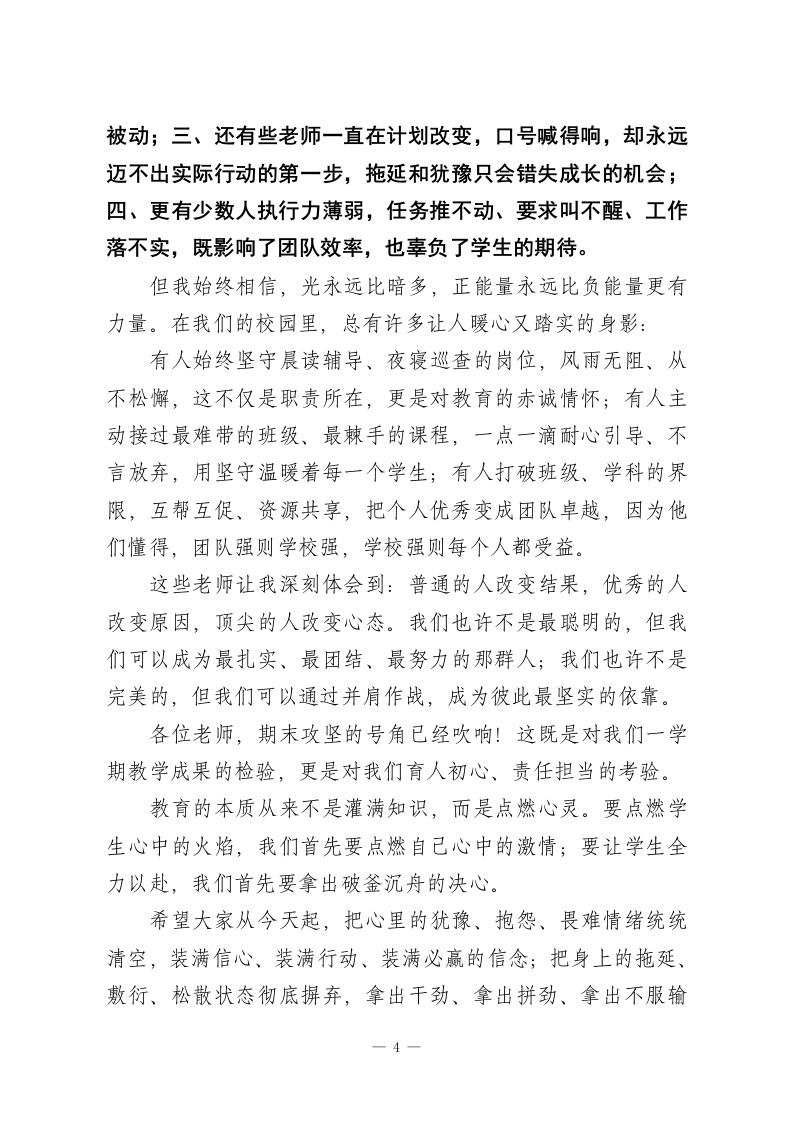 期末教师动员会,校长讲话:心往一处想,劲往一处使各位亲爱的老师们:大家下午好!转眼间,本学期的教学工作已推进至三分之二的关键节点。余下的时光早已不是简单的数字计数,而是检验成效、冲刺攻坚的刺刀时刻一一它能穿透所有表面的忙碌,让真正的耕耘与虚假的应付一目了然。我深知,这一学期以来,每一位老师都在岗位上默默耕耘、辛勤付出:早出晚归的坚守、因材施教的用心、答疑解惑的耐心,大家的辛苦与坚守,学校看在眼里、记在心里!但我更想说,在我们学校,辛苦是底色,创造价值才是亮色。正因为每一位老师都在拼命为学生成长、为学校发展创造价值,我校教师这四个字才更有分量、更有底气。今天,借着这场动员会,我想和大家分享三个特别的感触:第一,我特别佩服那些善用智慧干事、善思善为的老师。真正的努力,从来不是单纯的时间消耗,而是体力、脑力与工作活力的有机融合。我们身边绝大多数老师,不仅肯吃苦、能吃苦,更会钻研、善钻研一一不把低效劳动当作勤奋的幌子,不把重复机械当作负责的证明,而是带着思考备课、带着方法教学、带着智慧育人,这才是教育路上最踏实的耕耘者。第二,我特别尊重那些勇于自我革新、迭代成长的老师。教育行业唯一不变的,就是一直在变:课程标准在更新、学生1