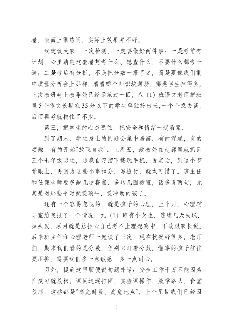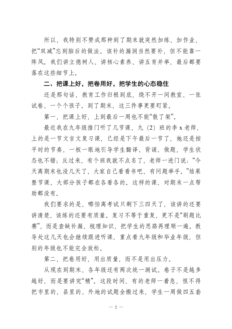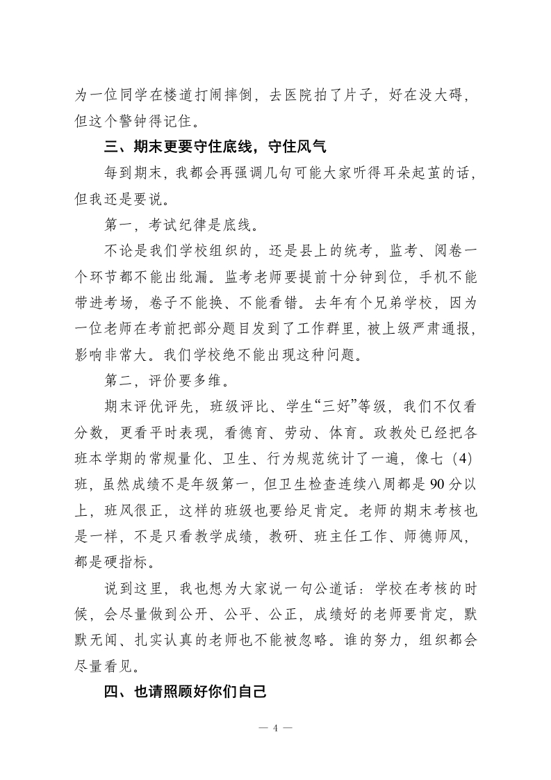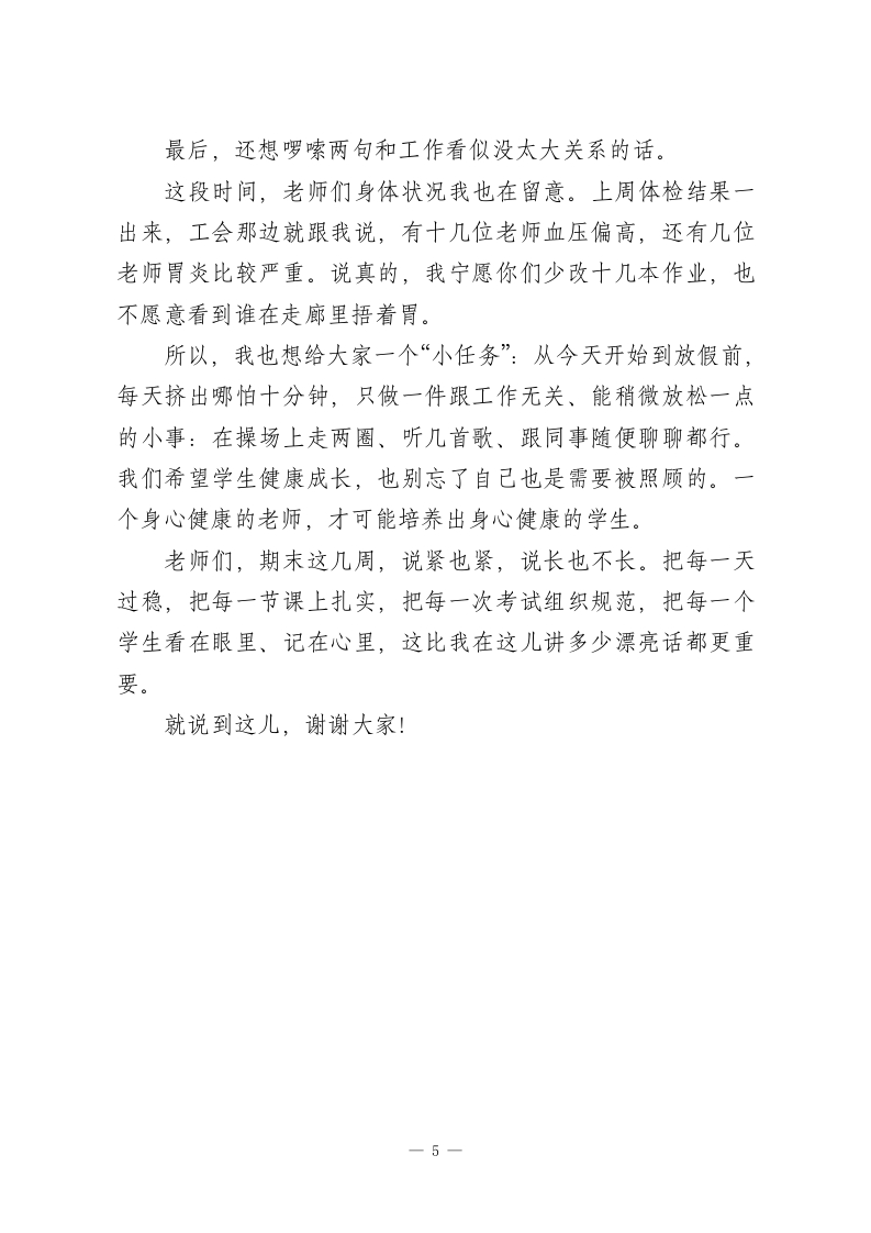 期末教师动员会上,校长讲话:把最后这几周过好,比什么口号都重要!各位老师、同志们:大家下午好!刚才从教导处出来的时候,手里拿着一张期末工作安排表,密密麻麻一整页,看着那张纸,我脑子里冒出来的第一个想法就是:这个学期,终于要收尾了。这段时间,大家都挺累的,早读、晚自习、检查、活动,一个接一个,这我都知道。可越是到了这个时候,越是容易松懈、出状况,所以今天我就想跟大家围绕一个事来聊:怎么把这个学期收好尾?一、期末不是“冲一冲”这么简单,而是检验我们整学期的样子很多人一说期末,就想到两件事:考试和成绩。确实,期末质量,是教育局、家长、社会都盯着看的“硬指标”。这学期期中检测,我们全校语数外三科平均分比上学期提高了差不多3分,八(3)班数学还在全镇排到了第三名,这些成绩,都是大家一点一滴拼出来的,先在这里向大家表示感谢。但我更想提醒一句:期未不只是几张卷子。它其实是一面镜子,照出来的是学生这个学期的学习习惯、行为习惯,是我们教师的课堂质量、教育温度,是一个班级、一个学校的整体风貌。一个平时就按教学常规认真抓的老师,期末不用“临时抱佛脚”;一个总喜欢走捷径、拖拖拉拉的班级,期末再怎么“拼”,也很难一下子翻天覆地。1