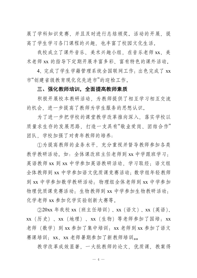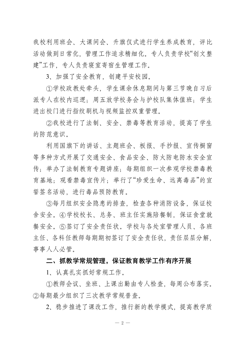 期末教师会议上,校长讲话:大家在各自的岗位上尽心尽力,辛苦中有收获,奉献中有快乐老师们:大家好!20xx年学校的各项教育教学工作,在全体教师的辛勤努力下,已经顺利完成了,我们将迎来马年的新春佳节。一年来,老师们勤于学习,乐于奉献,学校各科室工作人员相互协作,配合默契,大家在各自的岗位上尽心尽力,辛苦中有收获,奉献中有快乐。值此机会,我代表学校校务会,向为学校发展辛勤工作、无私奉献的广大教职员工致以深深的谢意,并通过大家,向一直大力支持学校工作的你们的家人、亲属致以诚挚的问候和最美好的祝愿。祝大家身体健康、万事如意!一年来,我校教职工用高尚的师德情操、无私的奉献精神、崇高的人格魅力和渊博的学识,为学校发展作出了自已的贡献,学校的各项工作都取得了突出的成绩。主要表现在以下几个方面:一、以德育为首,狠抓养成教育,提升育人工作水平1、我校积极完善了班主任考核机制,落实了班级量化评比。每周按量化制度评分站队,评出周文明班级,分月再累计评出月文明班级,每周、每月进行了总结、表彰。2、本年度以学生养成教育、“创文整建”活动开展为契机,