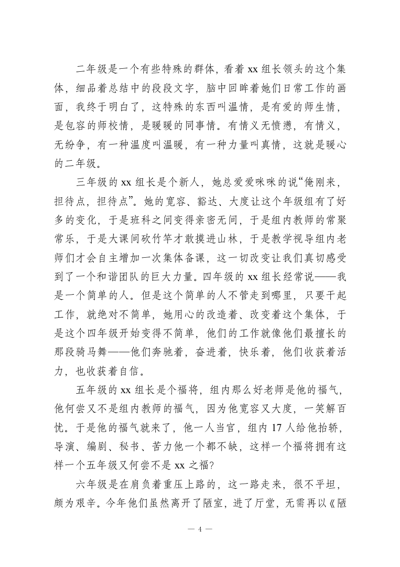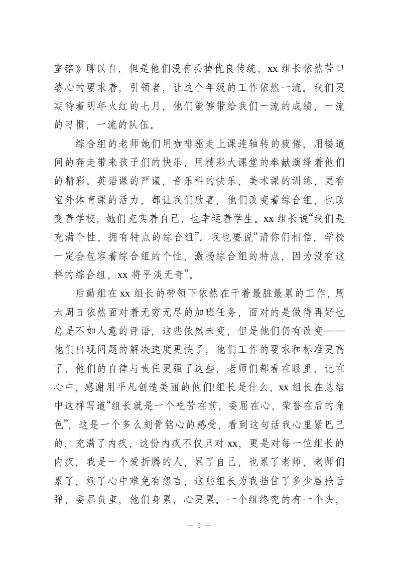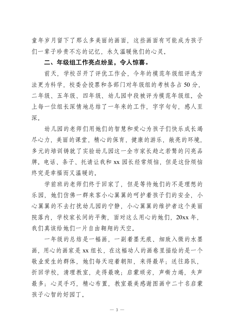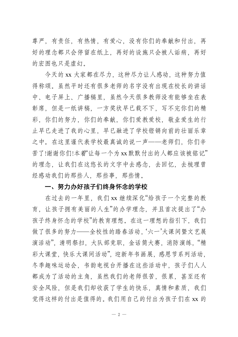 期末教师会议上,校长讲话:让每一个为学校默默付出的人都应该被铭记各位老师:你们好!在这里代表学校对过去一年里为Xx的发展,为孩子的成长默默付出的老师们致以最衷心的感谢和最诚挚的问候!过去的一年对XX小学来说的不平凡的。在这个打造XX名校的关键节点上,全体Xx人志存高远,克难奋进,夺取了一个又一个的胜利,创造了一个又一个的奇迹,迎来了一批又一批参观客人,赢得了一个又一个的荣誉一“XX省十大书香校园“XX省教师读书评比先进学校“XX省书画教育先进学校"XX省经典诵读先进学校”一串串金色的印记让我们迈向XX名校的脚步坚实而又执著;Xx市小学语文优质课赛,xx市小学数学优质课赛连拿两个第一名为Xx教育增光添彩也让我们聚焦课堂终结硕果;“精彩大课堂,快乐大课间,成长大舞台“三大”活动让校园幸福之花朵朵绽放;十二月份Xx市“三园”创建暨德育工作现场会在我校举行时那震撼每一位代表心灵的场面为我们的20xx完美作结。今天我们终于可以放下手中的劳作,撒开心中的牵挂,停下奔波的脚步,细数这一年来我们共同走过的日子。过去的一年,是xx经历了搬迁,建设之后难得的安静之年,风平浪静的背后实则是波澜壮阔,我们不断地在自己梦想大道上奔驰,奋斗,追求。波澜壮阔依托的是广大教师默默地奉献,辛勤的劳作,也许你们抱怨过,失落过,急躁过,但是你们有-1