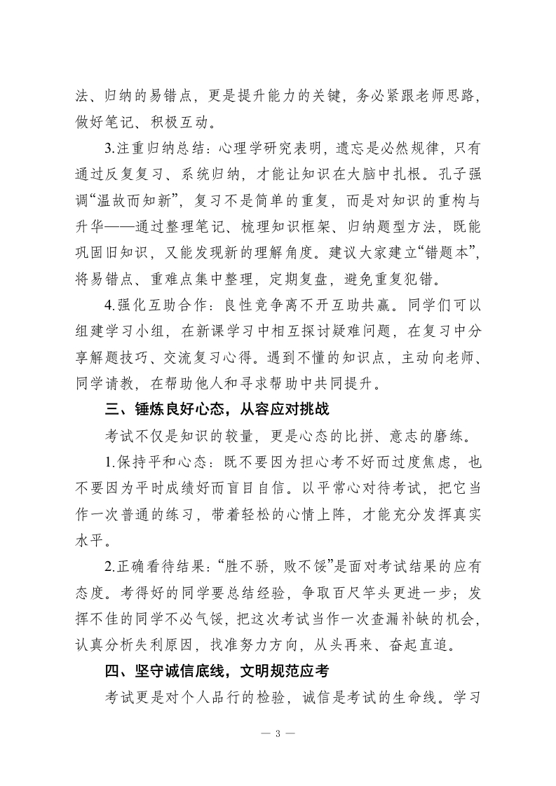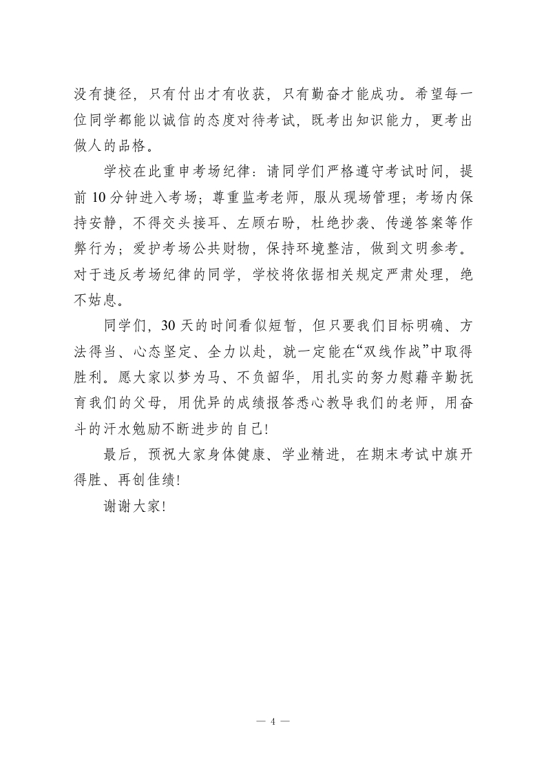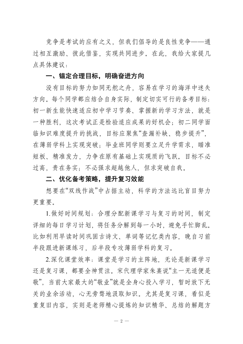 秋季第一学期期末备考动员校长讲话:新课复习双线并行,全力以赴迎战期末老师们、同学们:大家早上好!隆冬时节,寒意渐浓,本学期的学习之旅已临近终点,期末考试也即将如期而至。根据区教育局教研室统一安排,本学期期未考试定于2026年1月20日、21日举行。掐指一算,扣除双休日和元旦假期,我们在校的有效学习时间仅剩30天。更需要注意的是,据教务处统计,初一、初二年级部分学科仍未完成新课教学。这意味着未来的30天,大家将面临“双线作战”的挑战一一既要紧跟任课教师的节奏扎实学好新课,又要抽挤时间系统复习先前所学内容,学习任务紧张而艰巨。考试作为教学评价的重要载体,对老师而言,是全面掌握学生知识掌握情况、精准研判教学效果的重要依据,能为后续优化教学方法、调整教学策略、完善教学措施提供客观支撑:对同学们来说,它不仅是对一学期学习成果的全面盘点,更是一次自我审视、自我提升的契机。通过考试,大家可以清晰发现自己在知识储备、学习方法、学科平衡等方面的问题,及时获取矫正方向,为后续学习精准发力。更重要的是,在复习迎考的过程中,大家能进一步反思学习行为、打磨学习习惯、探索适合自己的高效学习路径。希望每一位同学都能高度重视这次考试,以扎实稳健的心态全力以赴,考出真实水平、展现最佳状态。
