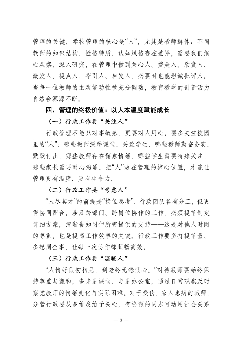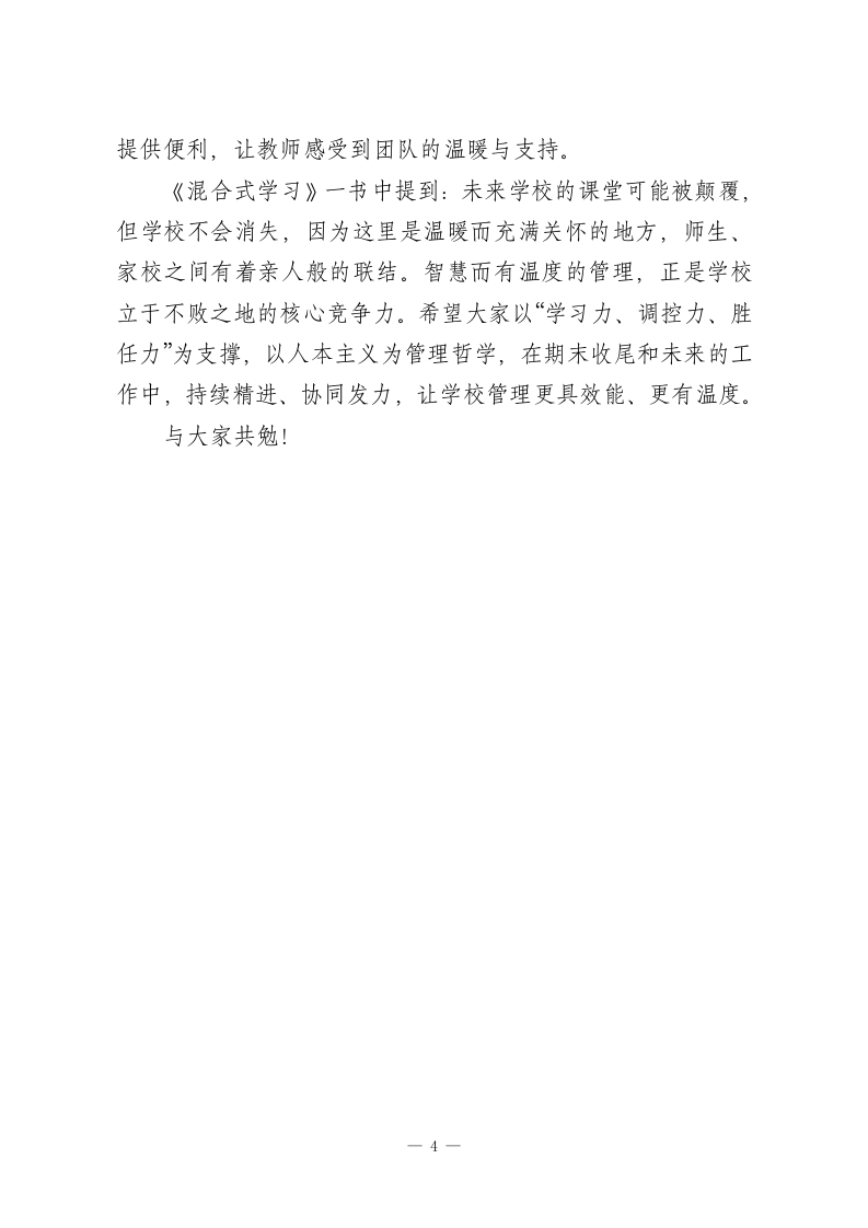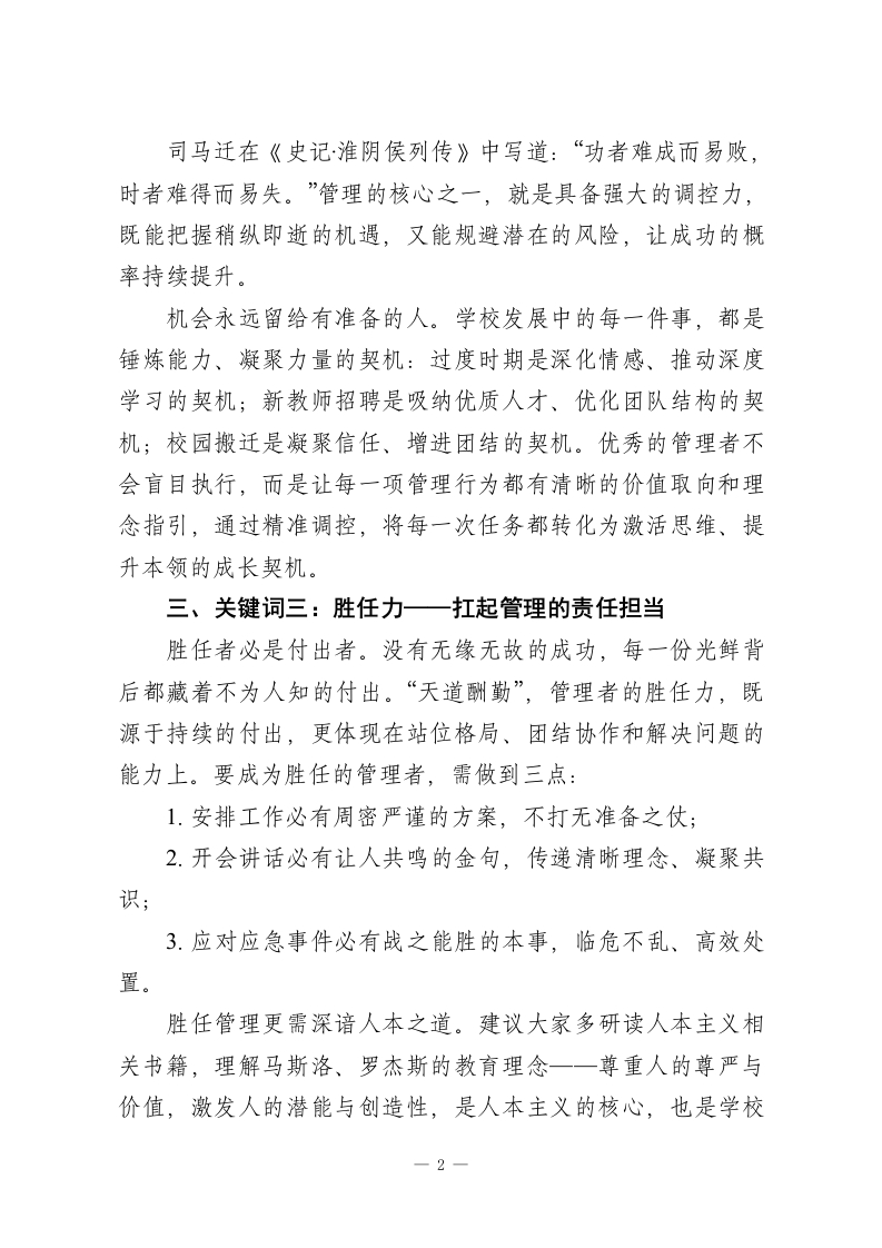 秋季第一学期期末行政班子会校长讲话:以三维能力强管理,以人本温度筑根基各位行政干部:《吕氏春秋》《淮南子》中皆言:“胜非其难也,持之者其难也。”学校管理中,一时的突破易达成,长久的坚守与精进却极具挑战。荣誉、地位等外在标签或许难以强求,但我们能主动掌控的,是让自己成为更优秀的管理者。作为学校管理的核心力量,大家肩负着统筹协调、引领发展的重任,更需在责任与担当中锤炼本领。今天,我想围绕“如何成为更优秀的管理者”分享三个核心关键词:一、关键词一:学习力一筑牢管理的认知根基“古人学问无遗力,少壮功夫老始成。”一个人的格局、视野、能力与素养,皆源于持续不断的学习。终身学习是管理者保持竞争力的“最佳保养品”,我们必须珍惜每一次成长机会:向书本学理论,向同伴学经验,向同行学方法,向专家学智慧,向实践学本领,更要向失败学教训。学习的内容可以覆盖管理全场景:从迎检流程的优化、听课评课的精准,到与教师沟通的艺术、紧要事务的处置;从助力教师专业成长,到关注特需儿童发展,都是值得深耕的领域。尤其要放下“管理者”的身段,主动向一线教师学习一一参与教研活动时的真诚探讨,日常相处中的经验请教,都能让我们收获鲜活的实践智慧,让管理更接地气、更具实效」二、关键词二:调控力一把握管理的关键契机-1