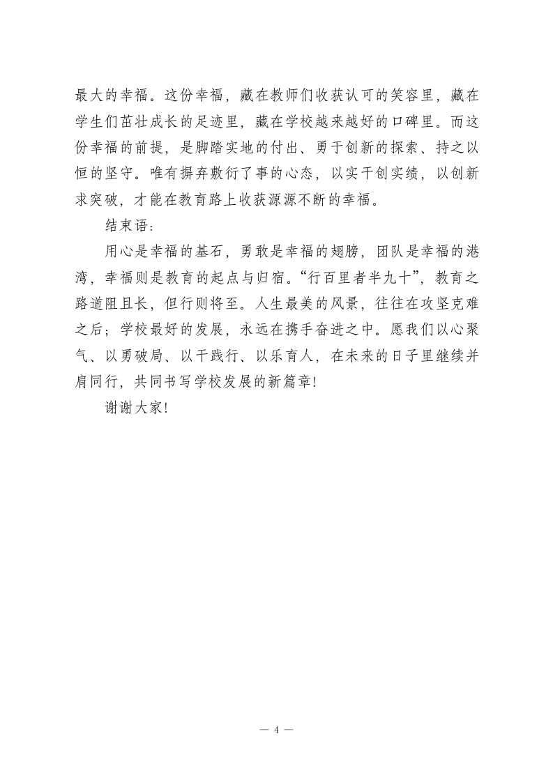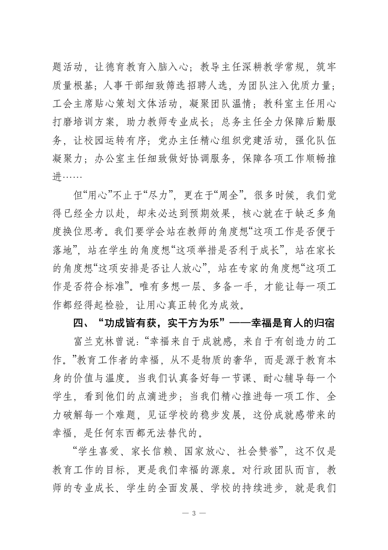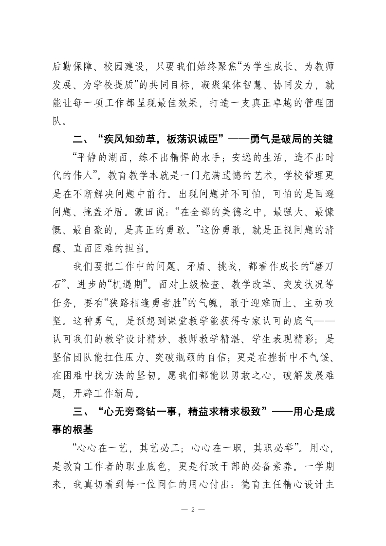 秋季第一学期期末行政班子会校长讲话:以心聚气,以勇破局,以干践行,以乐育人各位行政干部:李白在《独坐敬亭山》中写道“相看两不厌,只有敬亭山”,描绘了人与景的相知相守。而当我们用心经营一支团队、真诚对待每一位同仁,彼此之间何止“相看两不厌”,更有“志同道合、不负相遇”的珍惜与笃定。作为校长,能与大家并肩投身教育事业,是我的荣幸与缘分。感谢大家一学期来的鼎力支持与无私奉献。在本学期最后一次行政会上,我想分享四句心里话,与大家共勉前行:一、“众心齐,泰山移;孤力单,万事难”—团队是前行的底气“千人同心,则得千人之力万人异心,则无一人之用”,古训早已点明团队的核心价值。我们的行政团队之所以能高效推进各项工作,关键就在于这份心往一处想、劲往一处使的凝聚力。学校的发展从不是某个人的“独角戏”,而是全体同仁的“合唱曲”。如今的我们,早已不是孤立的个体,身上都刻着团队的烙印,一言一行都关乎学校的形象与发展。团队精神,藏在彼此的磨合与提醒中,显在目标一致的坚守中。我们要始终牢记,背后有同事的支持、有师生的期待,更要主动为团队争取荣耀。无论是教学管理、德育活动,还是