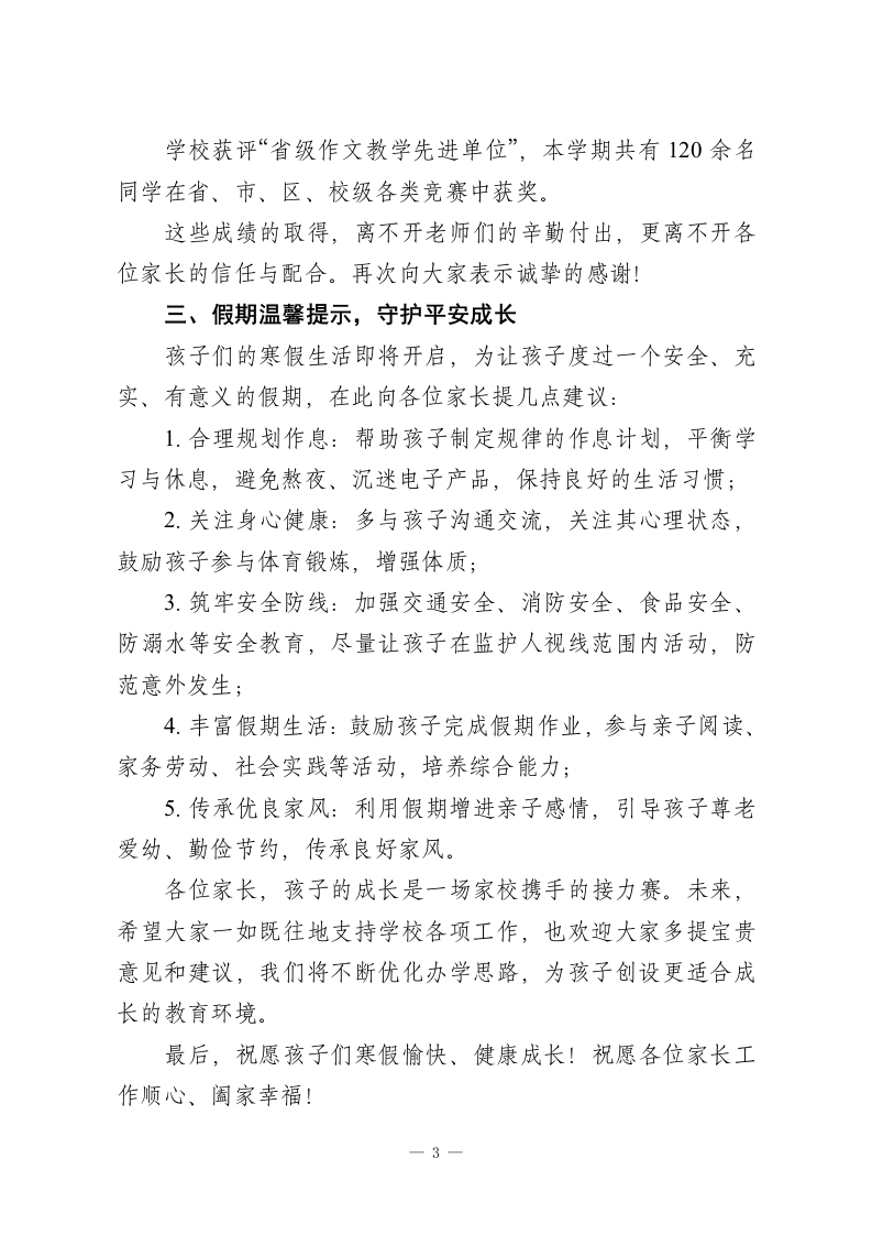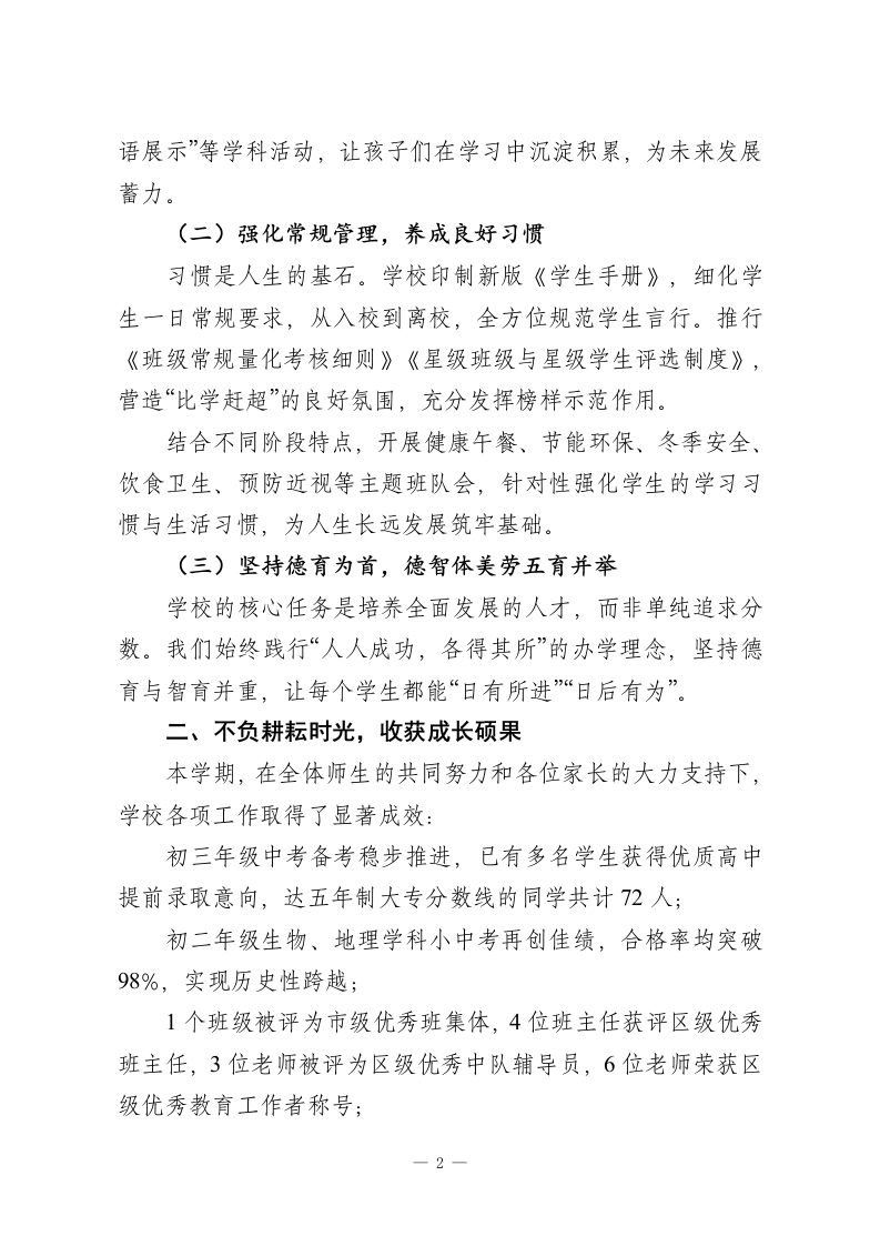 秋季第一学期期末家长会校长讲话:凝心聚力育新苗,家校携手共成长尊敬的各位家长:大家好!首先,我代表学校全体师生,向在百忙之中莅临本次家长会的各位表示最热烈的欢迎和最衷心的感谢!你们的到来,是对学校工作的莫大支持,更是对孩子成长的深切关爱。今天,我将从学校工作开展、学期成绩回顾、假期生活建议三个方面,与各位家长作详细交流,共话孩子的成长与未来。一、深耕育人实践,筑牢成长根基我校创建于19xx年,历经数十年沉淀,形成了以德育为首、全面发展的办学特色,孕育了丰富的校园文化内涵。“一届超过一届,一代胜过一代,一天好过一天”是我们不变的追求;“坚强”是校园文化的核心底色;“让优秀的更优秀,普通的变优秀,一个不能少”是我们的育人方向。围绕这一目标,本学期我们重点开展了三项工作:(一)厚植校园文化,培育全面发展的“礼仪少年”校园文化是学校的灵魂。本学期,我们延续“理想、挫折、感恩、爱心”四大主题教育,引导学生志存高远、直面困难、懂得感恩、胸怀大爱,促进德、智、体、美、劳全面发展。我们组织了“爱心义卖“校园才艺节“经典诵读展演”等大型活动,激发学生的理想追求与艺术潜能;开展“校园绿地认养“文明交通劝导”“社区环保行动”等校内外实践活动,培养学生的社会责任感;举办“经典书目进校园”“区级作文大赛”“市级英语口1
