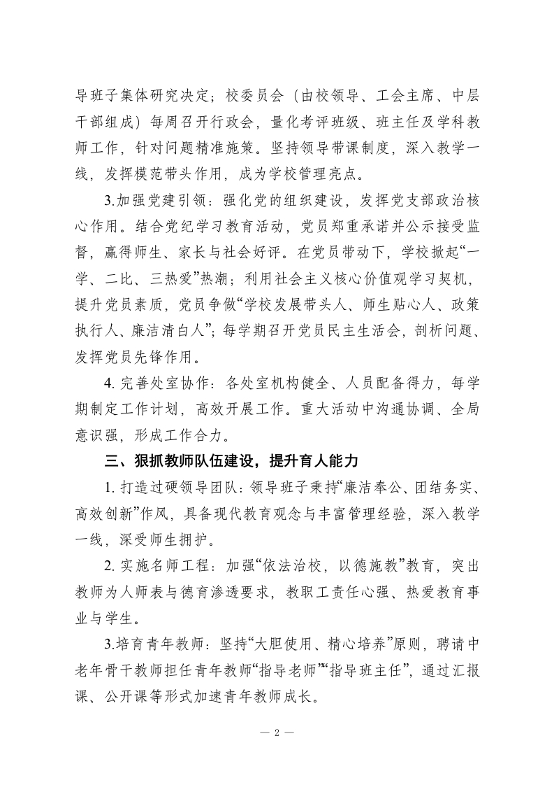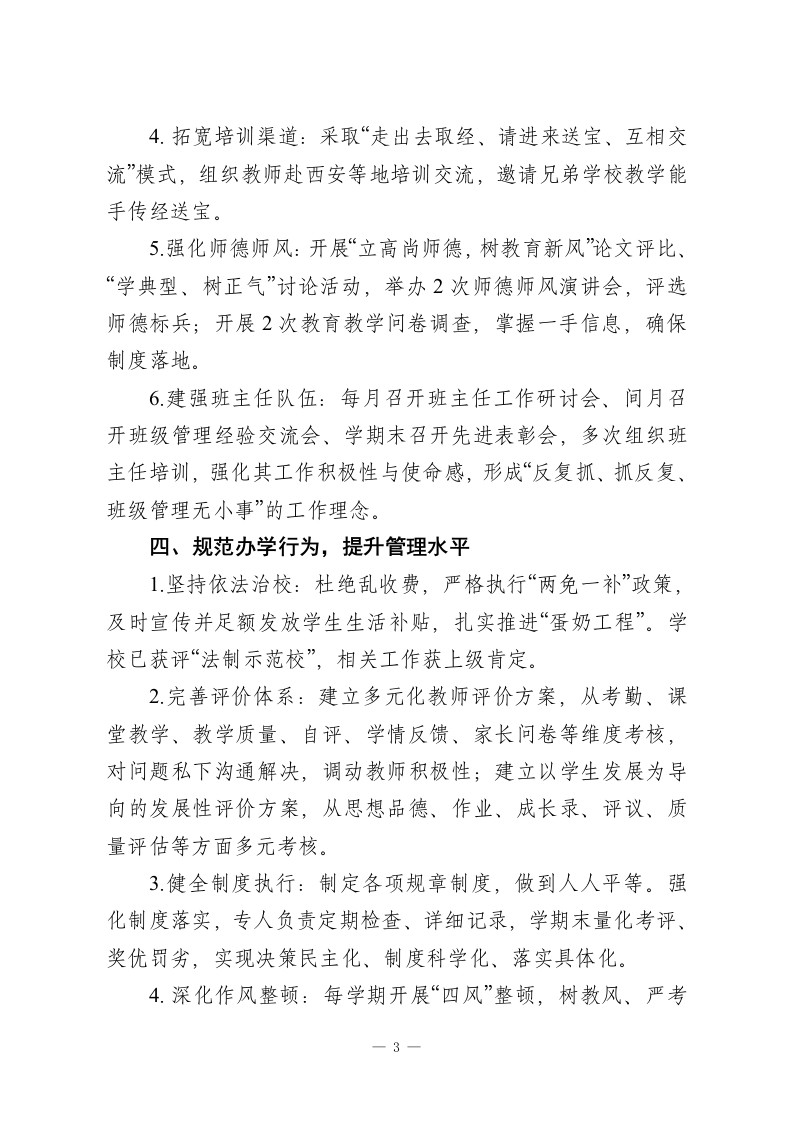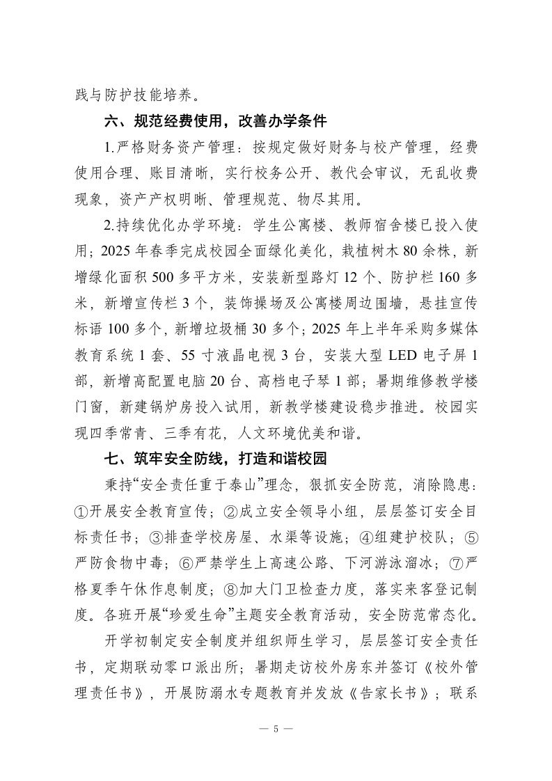 秋季学期督导评估暨校长履职考核自评汇报尊敬的各位领导、同仁:我校在各级教育行政部门的领导下,坚持社会主义核心价值观,深入贯彻国家中长期教育改革和发展规划纲要,全面落实党的教育方针,以德育为龙头、教学质量为核心、师生素质提升为目标、丰富教育活动为载体,全力践行素质教育,各项工作取得显著成效。对照新一轮督导评估标准,我校认真开展自查自评,现将具体情况汇报如下:一、坚守办学方向,落实育人根本学校全面贯彻党的教育方针,将立德树人作为根本任务,把素质教育贯穿教育教学全过程,依法执教、促进教育公平,关爱每一位学生成长。本学期,我校辍学率严格控制在2%以内,针对学生数量变化实际,持续推进消除大班额工作,各项措施落地见效。结合学校发展现状,建立健全科学的教师与学生评价制度,突出全面发展导向,杜绝单一评价倾向。二、强化领导班子建设,夯实管理根基1.健全管理机制:实行校长负责制,领导机构完善。校长具备良好道德修养,热爱教育事业,尊重教职工,带头学习教育法律法规与政策,履职尽责、实干兴校、廉洁自律、作风民主、改革创新。2.优化班子效能:领导班子年龄结构合理、活力充沛,充分发挥集体领导作用。重大事项广泛征求群众意见后,经校领1