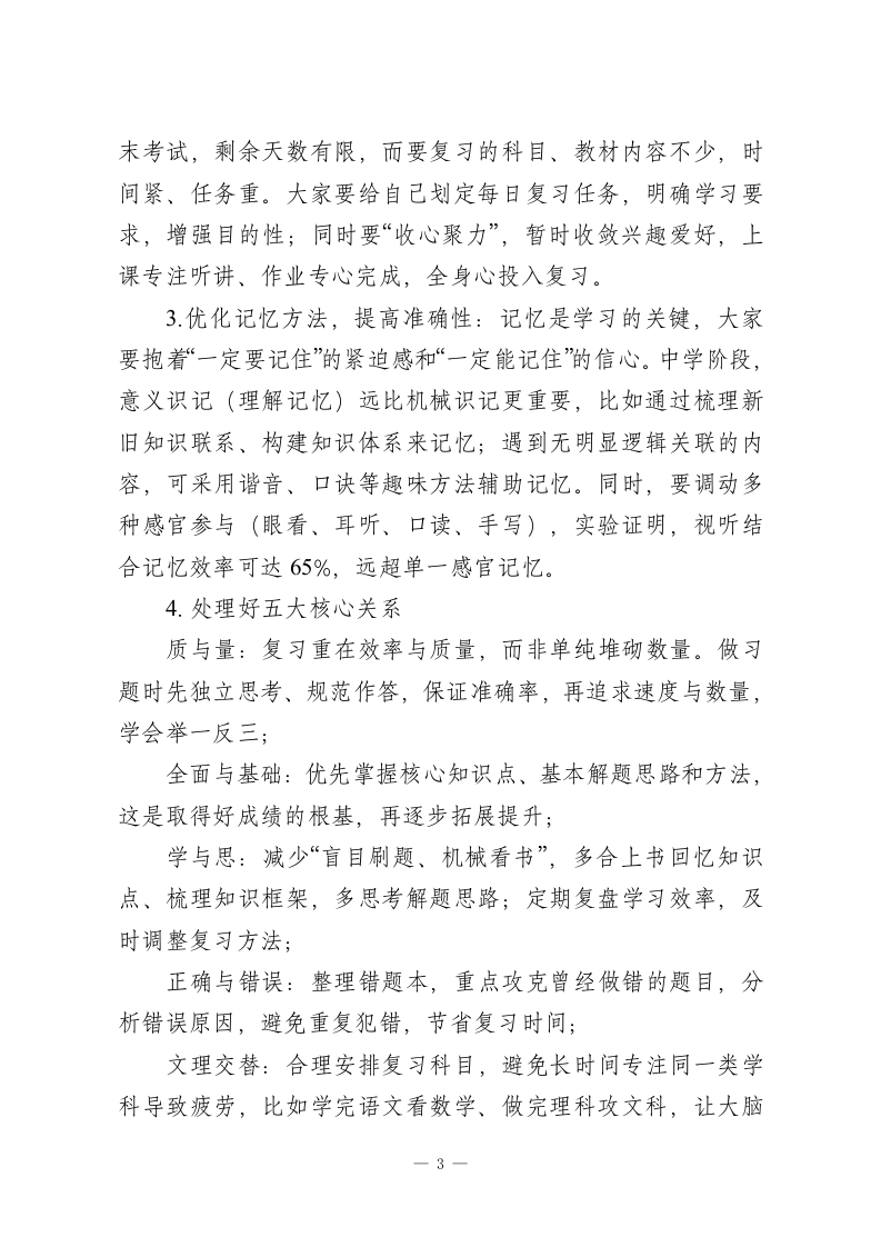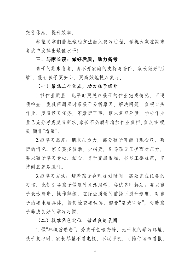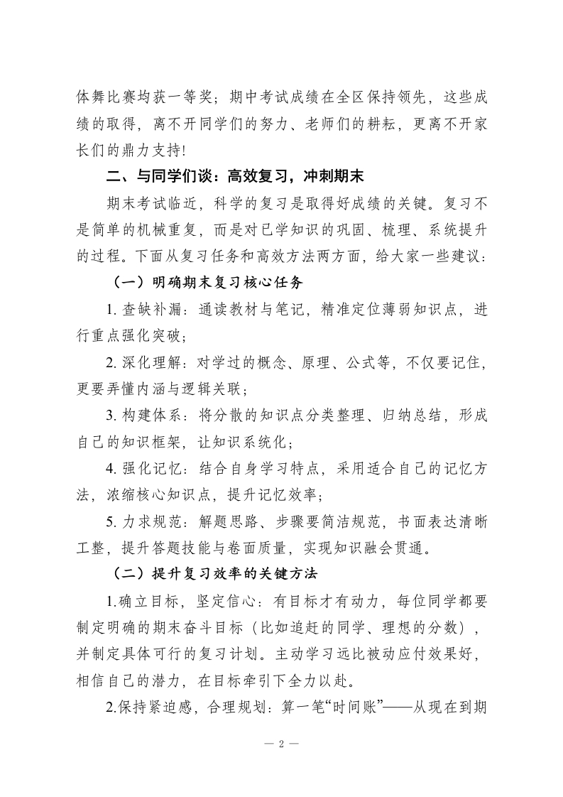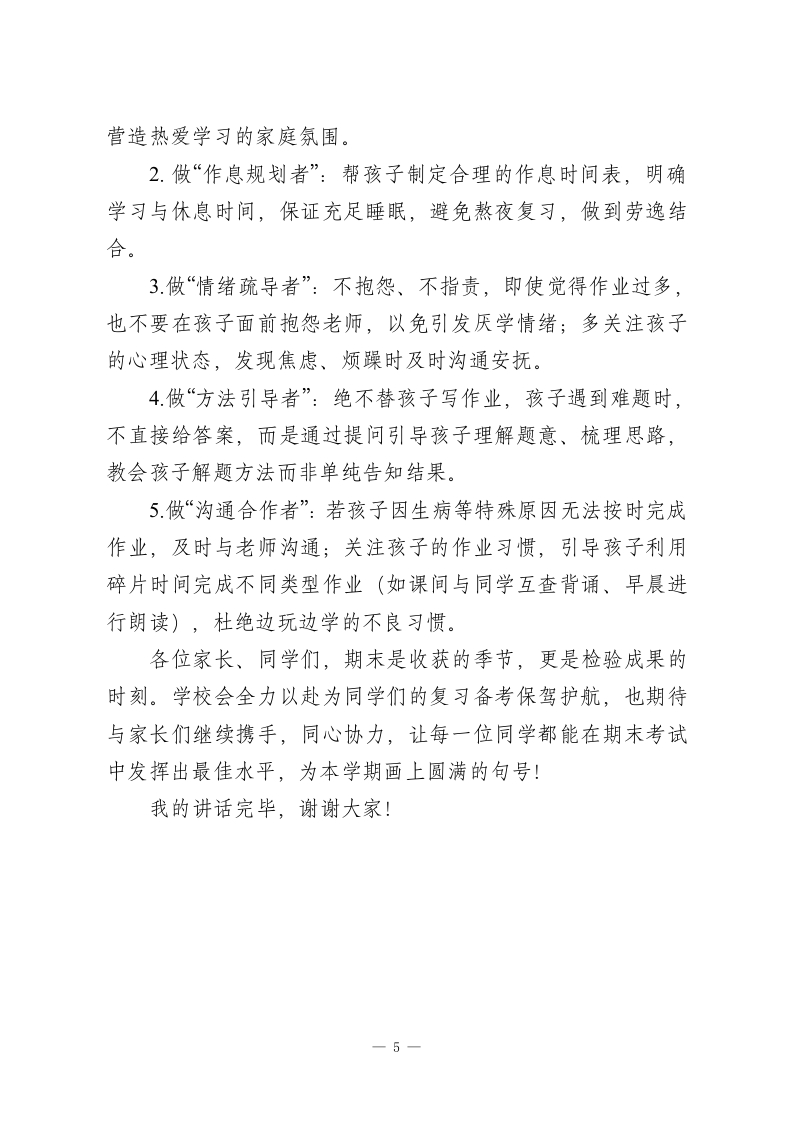 秋季学期期末复习备考家长会校长发言:凝心备考促成长,家校携手筑佳绩尊敬的各位家长、各位朋友,同学们:大家好!首先,我代表学校,向各位家长的如期赴约表示衷心的感谢和诚挚的欢迎!你们的到来,让初冬的校园暖意融融,这份对孩子教育的重视与支持,是对学校工作最有力的肯定,也是对每一位教师辛勤付出的最好褒奖。今天我将围绕三个方面与大家交流:一是简要回顾本学期学校的重点工作与发展成效;二是与同学们探讨如何高效开展期末复习,力争优异成绩;三是与家长朋友们分享如何做好孩子的后盾,助力孩子顺利备考。一、本学期学校工作与成效回顾各位家长、同学们,本学期已近尾声,四个多月的时光里,我们一同见证了孩子们的成长与蜕变。运动场上,曾经略显稚嫩的少年们,如今勇敢拼搏、团结协作,为班级争光添彩;艺术节的舞台上,大家载歌载舞、绽放才华,唱响青春旋律;课堂上,同学们专注听讲、积极发言、思维活跃,展现出蓬勃的求知欲。在全校师生的共同努力下,学校各项工作成效显著:全员运动会、艺术节文艺汇演等活动广受社会赞誉;学校成功获评国际田联少儿趣味田径实验学校,在区广播操、特色操比赛中斩获特等奖,区冬季长跑比赛中荣获一等奖,教师广播操、集1