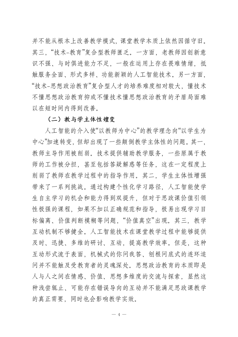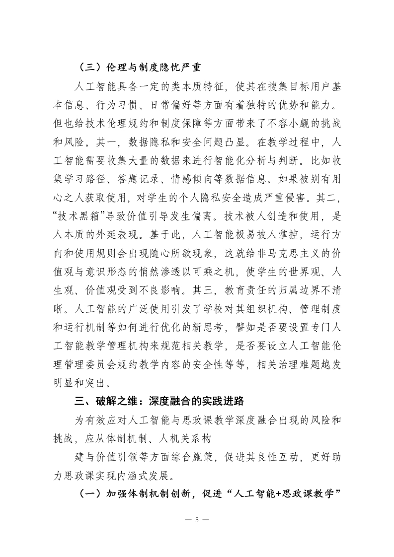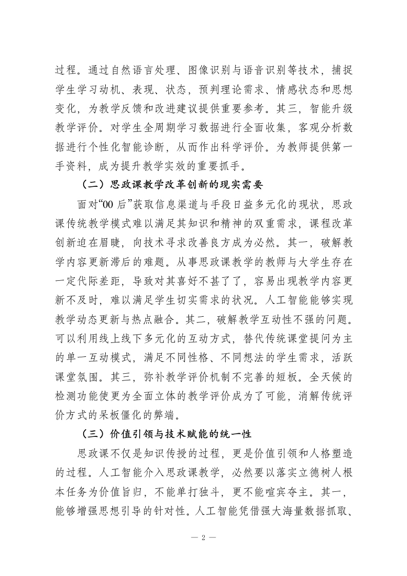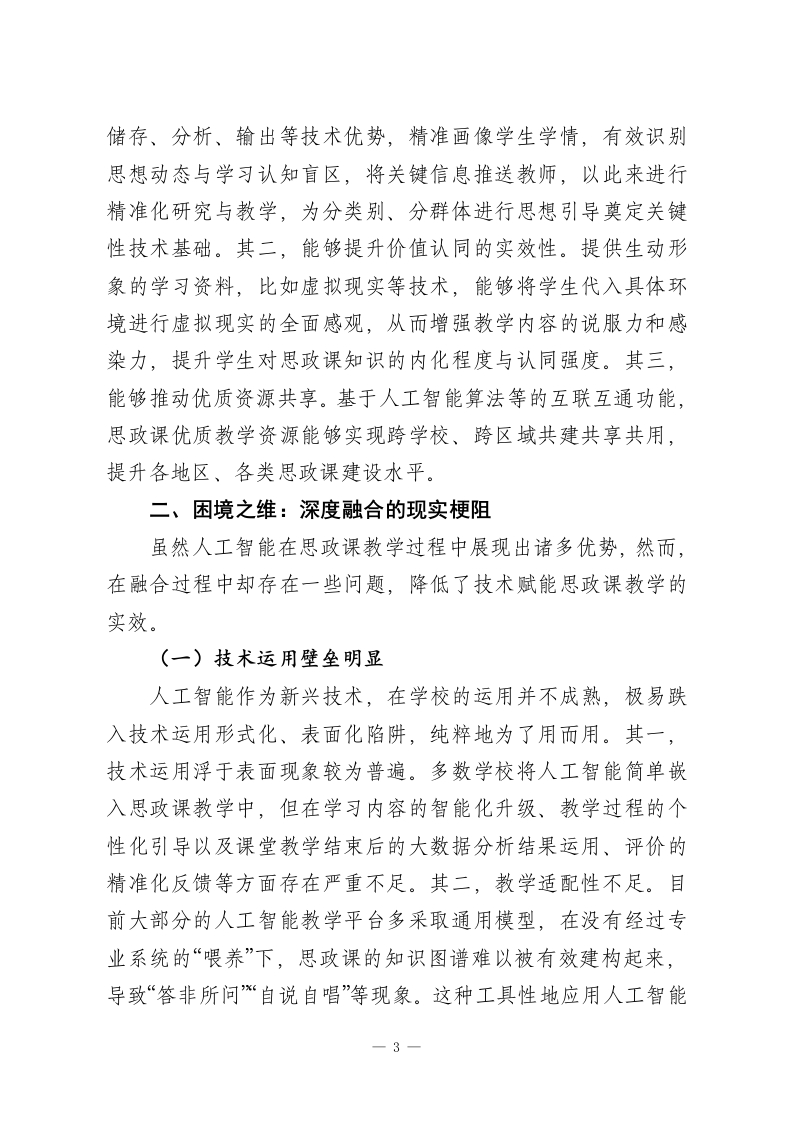 人工智能与思政课教学深度融合的三维审思习近平总书记指出:“中国高度重视人工智能对教育的深刻影响,积极推动人工智能和教育深度融合,促进教育变革创新。”人工智能作为新一轮科技革命核心驱动力,正深刻塑形高等教育生态格局。思想政治理论课(以下简称“思政课”)是思想政治教育的重要渠道,担负落实立德树人根本任务的重大使命。将人工智能与思政课深度融合,不仅是解决技术与教育之间融合张力问题的再探讨,更是增强思政课铸魂育人作用的必然要求。一、逻辑之维:深度融合的内在动因信息技术与各式教育形态在融合过程中,“两张皮”现象阻断“技术-教育”链条构建成为普遍问题。实质上,两者融合并不是简单堆砌相加,而是内在动因使然。技术赋能、教育变革与价值引领三重逻辑是促成深度融合的关键。(一)人工智能技术的教育适配性人工智能以其强大的信息处理能力、智能识别算法、海量数据分析与自适应学习能力,在思政课教学中已不再呈现辅助的单一向度,而以全程参与为特征。其一,构建个性化学习路径。按照用户协同推荐、相关内容推送、关联联动原则,利用海量数据浏览痕迹抓取与智能算法推荐,其对学生学习行为、喜好以及需求进行精准画像,并精准推送满足个性化需求的视频、文本等各类资源,有助于因材施教。其二,动态优化教学1