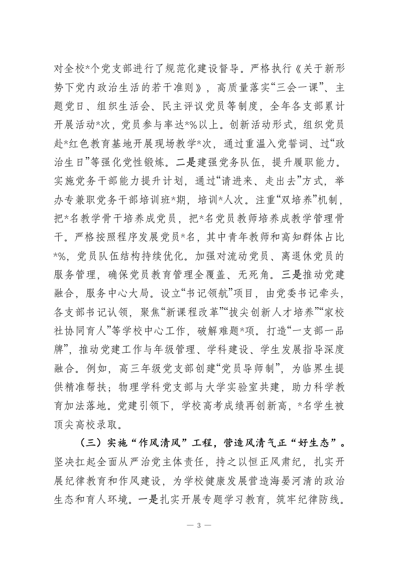 市第一高级中学党委书记2025年度抓基层党建工作报告一年来,我始终坚持以习近平新时代中国特色社会主义思想为指导,深入学习贯彻党的二十大和二十届历次全会精神,紧紧围绕新时代党的建设总要求,严格履行管党治党政治责任,以高质量党建引领学校各项事业高质量发展。根据市委教育工委的统一部署,现将本人2025年度履行抓基层党建工作第一责任人职责情况报告如下。一、2025年度主要工作与成效过去的一年,是学校承前启后、开拓进取的关键一年。我们以党的政治建设为统领,将学习党的创新理论作为首要任务,全面贯彻党的教育方针,确保学校始终成为坚持党的领导的坚强阵地。(一)实施“政治铸魂”工程,把稳办学治校“方向盘”。始终将党的政治建设摆在首位,教育引导全校师生深刻领悟“两个确立”的决定性意义,增强“四个意识”、坚定“四个自信”、做到“两个维护”,确保党的路线方针政策在学校不折不扣贯彻落实。一是深化理论武装,筑牢思想根基。我们严格落实“第一议题”制度,将学习贯彻习近平新时代中国特色社会主义思想、党的二十届四中全会精神及习近平总书记最新重要讲话精神,作为党委会、理论学习中心组、支部“三会一课”的必修内容。全年组织党委理论学习中心组专题学习共*次,举办读书班、专题研讨*场,领导班子成员深入支部、年级讲党课*次。我们重点1