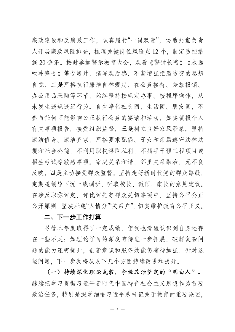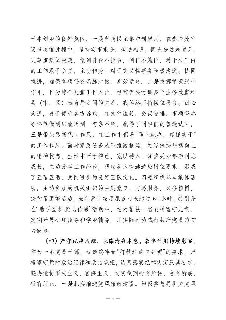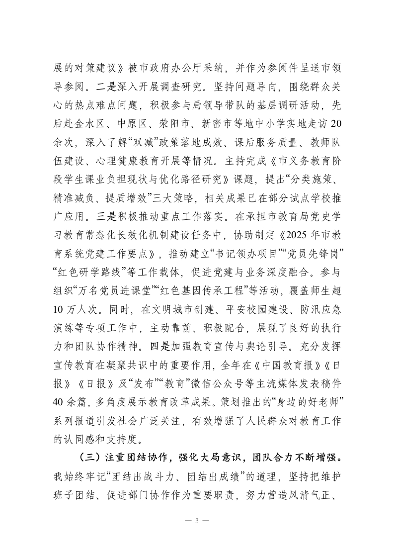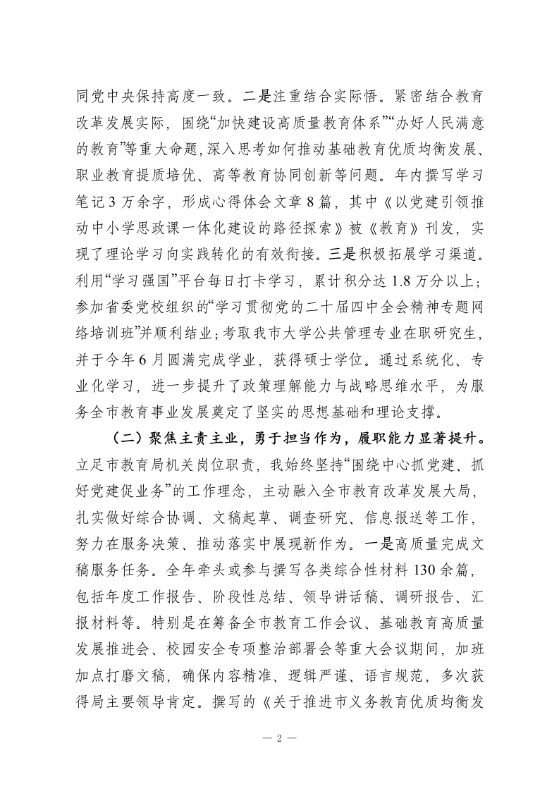 市教育局党员干部2025年个人工作总结今年以来,我始终坚持以习近平新时代中国特色社会主义思想为指导,全面贯彻党的XX大和二十届二中、三中、四中全会精神,深入学习贯彻习近平总书记关于教育的重要论述和视察重要讲话指示精神,紧紧围绕市委市政府决策部署和市教育局中心工作,立足岗位职责,坚定理想信念,强化责任担当,坚持学思用贯通、知信行统一,在政治建设、业务提升、团结协作、廉洁自律等方面持续发力,较好地完成了各项工作任务,切实发挥了党员干部的先锋模范作用。一、主要工作情况(一)强化理论武装,筑牢思想根基,政治品格更加过硬。作为一名教育系统的党员干部,我深刻认识到:教育是国之大计、党之大计,必须始终坚持党对教育工作的全面领导,把讲政治贯穿于履职尽责全过程。为此,我始终把政治理论学习作为首要任务,自觉加强思想政治建设,不断提升政治判断力、政治领悟力、政治执行力。一是坚持系统深入学。通过参加局党组理论学习中心组集体学习、“三会一课”、专题研讨班和个人自学等多种形式,全面系统学习《习近平谈治国理政》第五卷、党的二十届四中全会公报原文以及《中国共产党章程》《中国共产党组织工作条例》等党内法规。重点研读了习近平总书记在全国教育大会、学校思想政治理论课教师座谈会上的重要讲话精神,深刻领会“两个确立”的决定性意义,增强“四个意识”坚定“四个自信”、做到“两个维护”,在思想上政治上行动上始终1