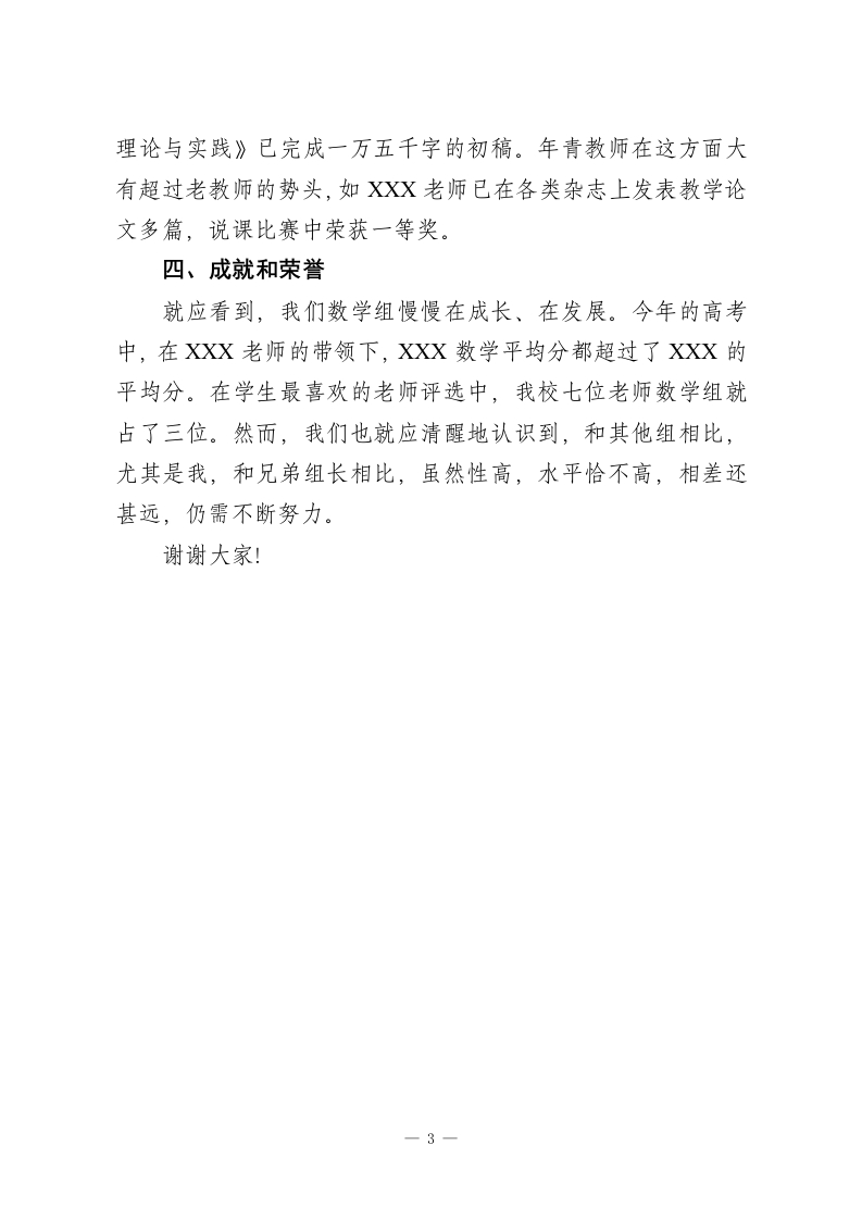 数学教研组长个人述职报告一年半前,我怀着诚惶诚恐、忐忑不安的情绪理解了数学教研组长一职,担心不能胜任,始终觉得自己肩上的担子不轻、压力很重,因此我加倍努力,真心诚意为数学组的每位老师服务,求真务实完成学校布置的各项任务。下面我主要汇报四个方面的工作。一、关于教研组的建设在教研活动中,我们多次研究讨论并渐渐构成了以下三方面的共识:(1)群体意识:大家团结一致,心往一处想,劲往一处使,努力改变数学组的形象。如果我们是薄弱组,那么你水平再高也只是薄弱组的一员,反之,整体实力的提高,相应你也能得到认可。(2)服务认识:师德建设的的尺度首要体此刻教师对教学事情的投入程度及事情中表现出来的程度和效果,因此要求我们应全心全意为学生服务。做老师是辛苦的,做数学老师更苦,赋予的职责也更大。作为数学教师就决定了你就应做一个事情上是严谨的、扎实的,人格上是真实的、正直的人,否则你不配做一个数学人。(3)教研意识:校本教研和组内教研已越来越受大家的重视。尤其是在新课程、新大纲这样的新形势下,一个不重视教研的老师必将被淘汰。针对我们一个大组的实际状况,加强备课组的建设和教研更为重要。
