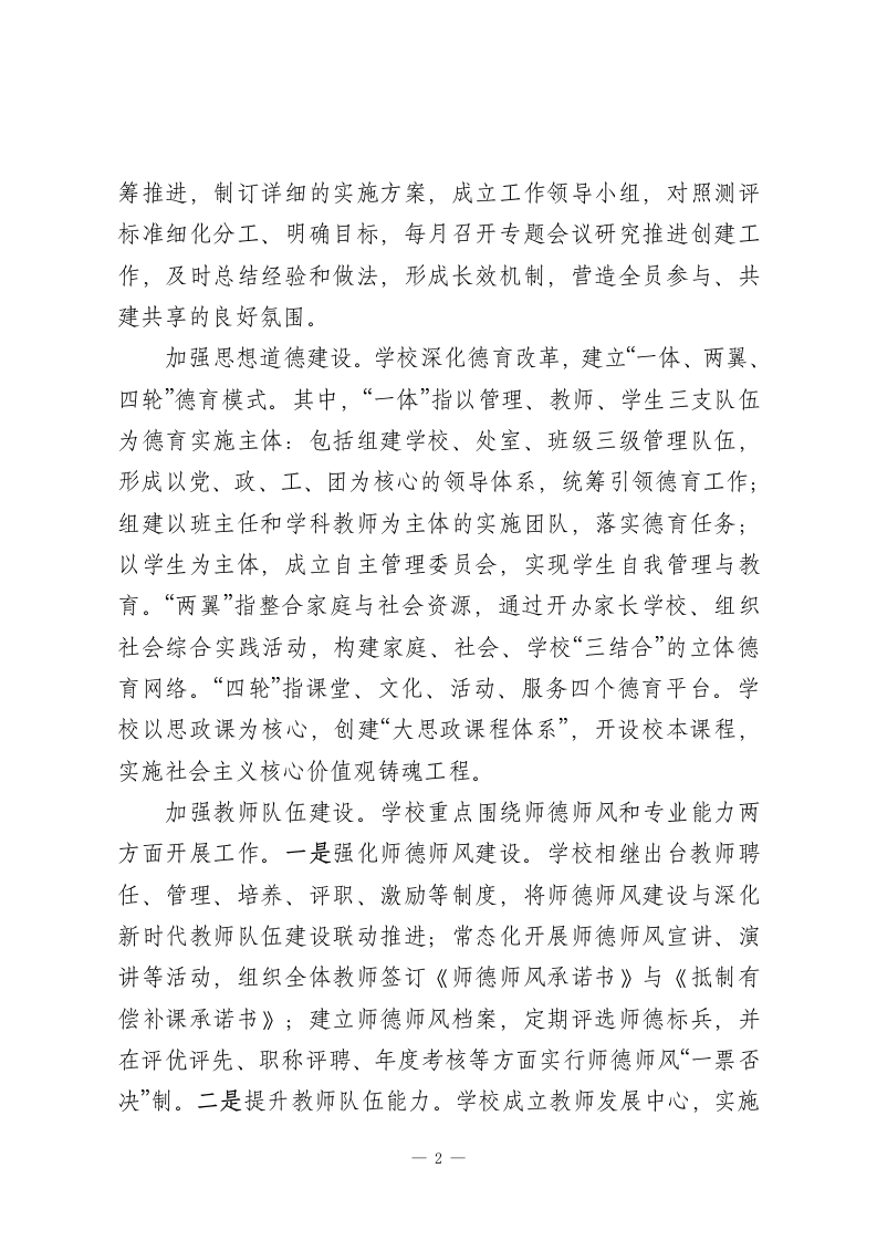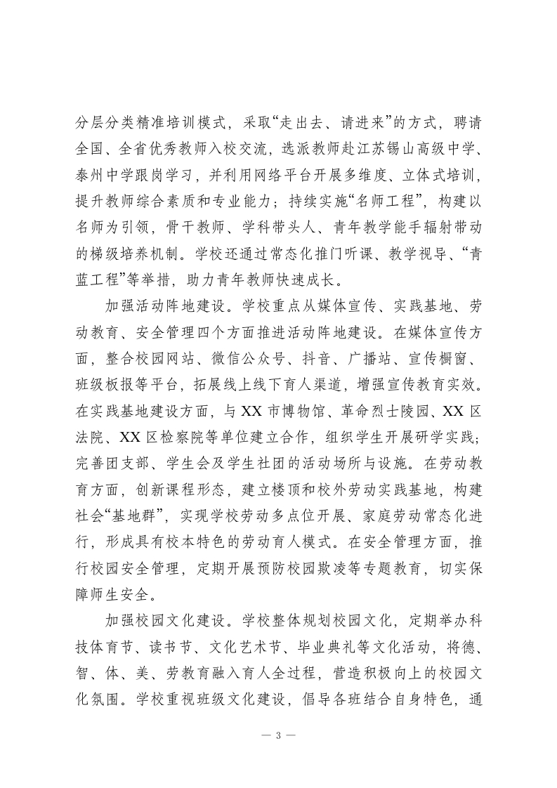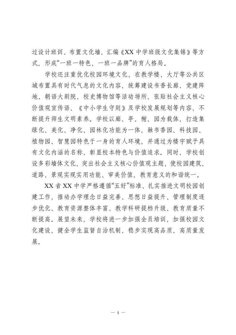 推进文明校园创建会议上校长讲话:创建文明校园,树立质量标杆XX省XX中学全面贯彻党的教育方针,在XX区委、区政府及XX市文明办、市(区)教育部门的指导和支持下,扎实推进文明校园创建。学校以“领导班子建设好、思想道德教育好教师队伍好、活动阵地好、校园文化好”的“五好”标准为引领,通过创新管理模式、深化德育改革、强化师资建设、拓展活动阵地、优化育人环境等举措,全面提升办学品质,促进师生共同成长。加强领导班子建设。一是坚持党建引领,聚力铸魂育人。学校全面加强党对教育工作的领导,认真落实中小学校党组织领导的校长负责制,通过集中学习、跟岗培训、轮值管理等方式淬炼干部“内功”,积极打造“能谋、能干、能思、能说、能研”和“学习型、实干型、研究型、创新型、专家型”的“五能五型”专业管理团队,切实增强其凝聚力和战斗力。学校持续推进党建与教育教学深度融合,严格落实党建工作责任制和“三会一课”等制度,完善学校管理制度和科学民主决策机制,健全集体议事规则和决策程序,严格执行“三重一大”制度,坚持依法执教。学校创新主题党日和党史学习教育的内容与形式,抓好理论学习中心组学习,深化“第一议题”制度,充分发挥党组织的战斗堡垒作用和党员的先锋模范作用。二是凝聚创建合力,营造良好氛围。学校高度重视文明校园创建工作,周密部署、统1