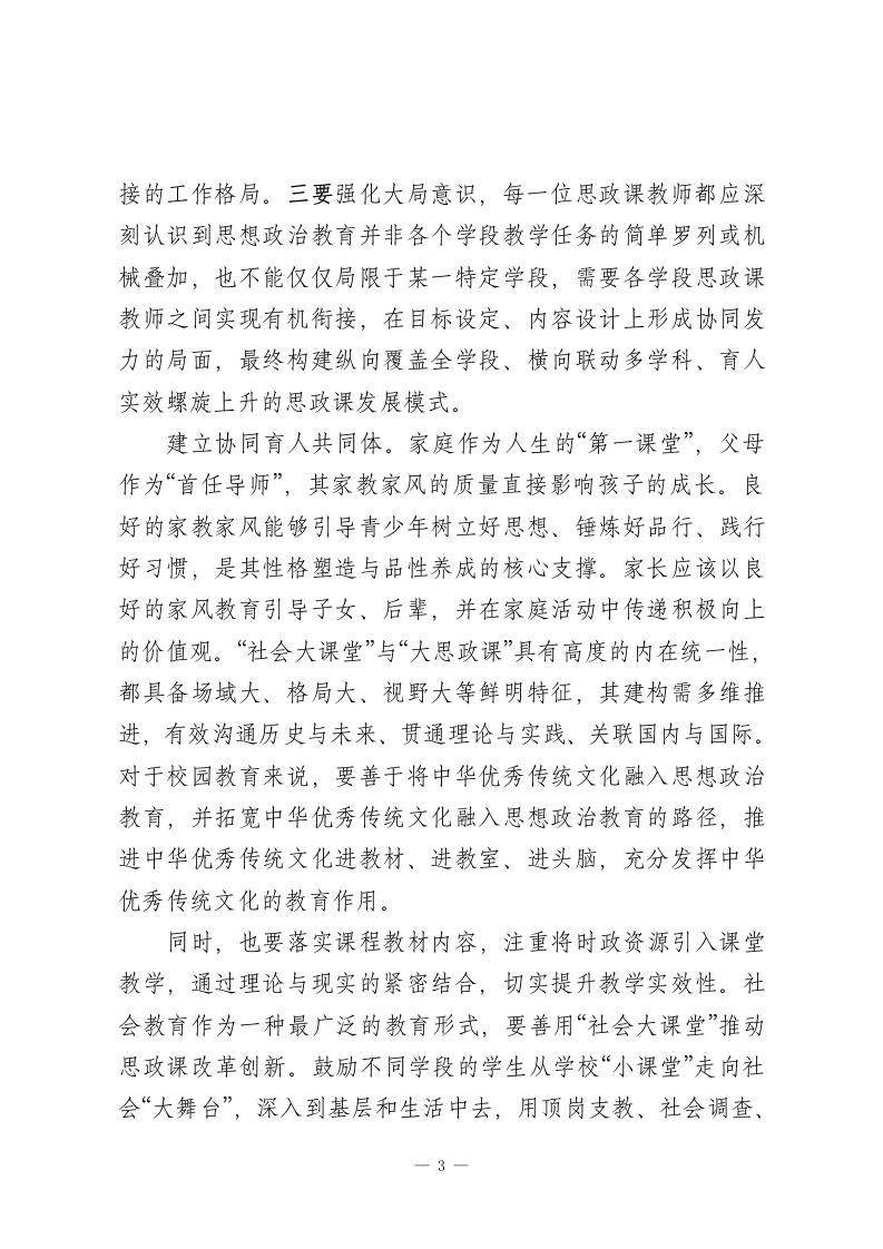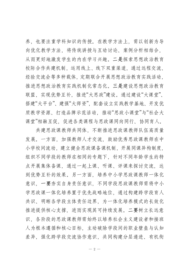 推进中小学思政课一体化共同体建设的实践路径党的二十大报告提出:“用社会主义核心价值观铸魂育人,完善思想政治工作体系,推进中小学思想政治教育一体化建设。”为“推进中小学思政课一体化建设”的再一次提炼与创新提供了根本遵循,在实践中应不断深化对思想政治教育规律和学生成长规律的认识。一、推进中小学思政课一体化共同体建设的必要性中小学思政课一体化共同体建设在紧扣立德树人根本任务的同时,统筹其他学科教育,形成一个系统、完整、科学的教育体系,从而使学生的个性得到充分发展。中小学思政课一体化共同体建设不是将小学、中学、高中等各阶段教育主体或是思政课、其他学科、实践活动等单一功能进行简单拼凑叠加,而是各构成主体紧密协作,最终形成全员、全程、全方位的育人合力。在推进中小学思政课一体化共同体建设方面,需持续深化改革创新,不断增强思政课的针对性与吸引力。二、推进中小学思政课一体化共同体建设的实践路径探索中小学思政课一体化机制,不断加强体制机制建设。一是制定实施覆盖所有思政课的区域性行动方案,应涵盖思政课的设置、教学内容及教学方法等多个方面。在思政课的设置上,针对各学段、各年级、各专业学生的实际需求设置与之相匹配的课程。在教学内容上,既要注重学生思想道德素质的培1