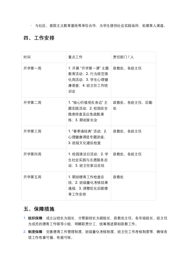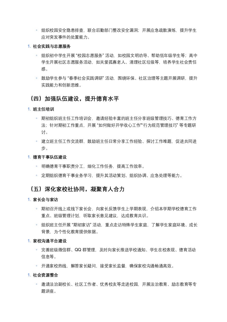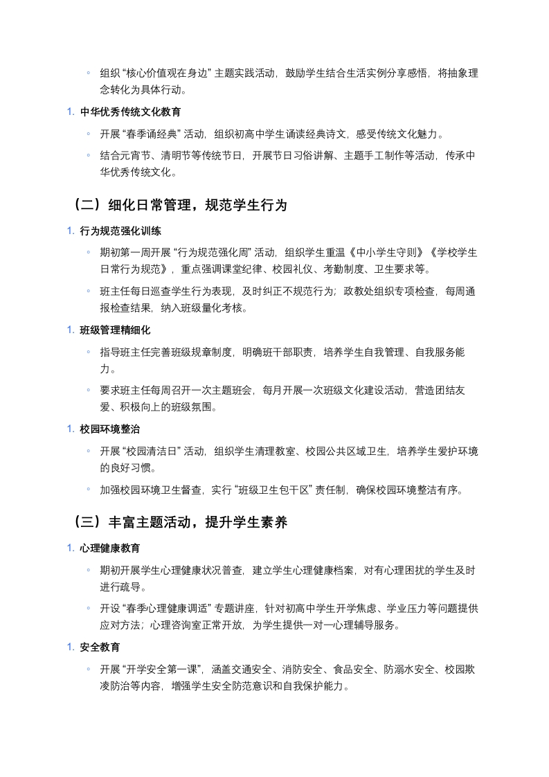 完全中学2026年春季学期政教工作计划一、指导思想本学期初政教工作以“立德树人”为根本任务,紧扣《中小学德育工作指南》要求,结合完全中学初高中学生身心发展规律,聚焦思想引领、习惯养成、素养提升三大核心目标,以常态化德育管理为基础,以主题教育活动为载体,以家校社协同为支撑,构建“全员、全程、全方位”育人体系,为学生全面发展和学校高质量发展筑牢思想道德根基。二、工作目标1.思想引领目标:强化学生理想信念教育,培育和践行社会主义核心价值观,引导初高中学生树立正确的世界观、人生观、价值观,增强爱国情怀与社会责任感2.行为规范目标:细化学生日常行为管理,巩固养成教育成果,初中学段重点规范礼仪、纪律、卫生习惯,高中学段重点强化自律、责任、公德意识,实现学生行为规范达标率98%以上。3.活动育人目标:打造特色主题教育活动,丰富学生精神文化生活,提升学生综合素养,确保期初各项活动有序开展、成效显著。4.协同育人目标:健全家校社协同育人机制,搭建有效沟通平台,提升家长育人能力,凝聚育人合力,家长满意度达90%以上。5.队伍建设目标:加强班主任、德育干事队伍培训,提升德育工作者专业能力与管理水平,打造一支责任心强、业务精湛的德育骨干队伍。三、重点工作内容及实施措施(一)强化思想道德教育,筑牢精神根基1.开展“开学第一课”主题教育活动。初高中分学段设计课程内容:初中学段以“收心归位·逐梦新学期”为主题,引导学生快速调整状态,明确学习目标;高中学段以“青春担当·强国有我”为主题,结合时政热点,激发学生爱国热情与责任意识。。形式多样:采用“线上+线下”结合模式,线下开展主题班会、专题讲座,线上推送优秀教育视频、案例分享,确保教育覆盖全体学生。1.社会主义核心价值观常态化教育。利用校园广播、宣传栏、黑板报等阵地,定期宣传核心价值观内涵,营造浓厚氛围。