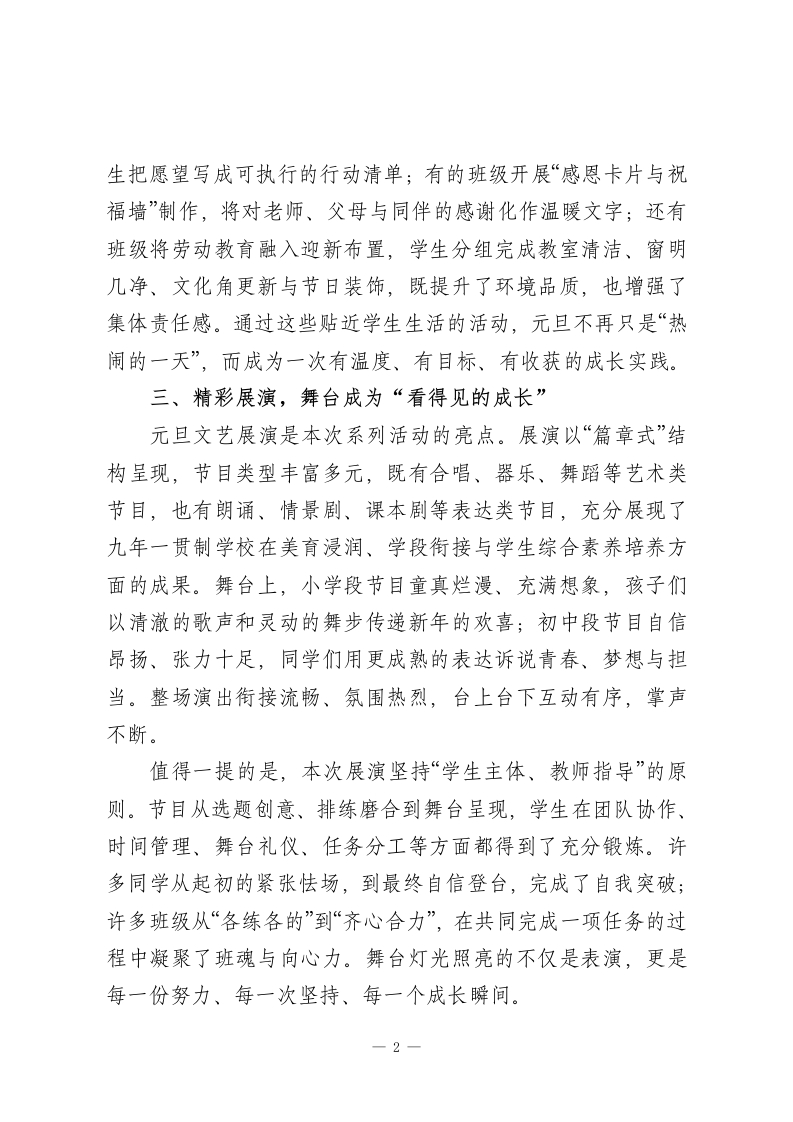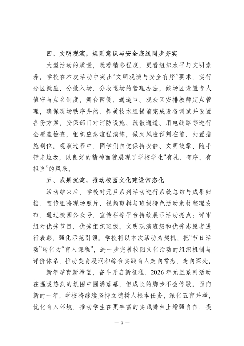 喜迎2026,灯火迎新岁,舞台见成长学校元旦系列活动通讯稿为营造欢乐祥和、文明向上的节日氛围,集中展示学校育人成果与学生精神风貌,近日学校以“灯火迎新岁,舞台见成长”为主线,统筹开展2026年元旦系列活动。学校坚持“以美育人、以文化人、全员参与、节俭务实”的原则,将元旦庆祝与德育实践、劳动教育、学科融合、文明素养提升有机结合,通过“学校统筹一年级推进一班级落实一成果展示”的闭环管理,让学生在参与中获得成长。一、统筹部署,确保活动有序推进活动启动以来,学校提前制定实施方案,成立领导小组与工作专班,围绕节目征集、排练组织、舞美技术、安全保障、后勤服务、宣传报道等环节细化责任分工,明确时间节点与质量标准。各年级在学校统筹下开展节目遴选与过程管理,做到“班班有参与、人人有角色”。德育处牵头统筹节目编排与流程设计,艺体组教师开展专业指导,安保与总务部门强化场地、用电、通道等隐患排查与应急预案演练,为活动安全顺利开展提供坚实保障。二、班级创编,校园处处洋溢迎新气息元旦前夕,学校以班级为基本单元开展迎新主题活动,各班围绕“新岁愿望、文明校园、感恩成长、我为班级添光彩”等主题设计特色环节:有的班级组织“新年目标制定会”,引导学1
