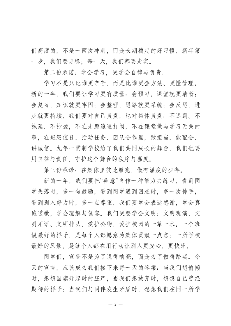 向骏马出发,把新年的第一步走稳走实2026年元旦学生宣言稿尊敬的老师们、亲爱的同学们:大家好!在这庄严的国旗下,我们迎来了崭新的2026年。首先,我想代表全体同学向老师们致以真诚的感谢:感谢你们用一次次耐心讲解、一次次温暖提醒、一次次默默守护,陪我们走过四季更替;也向同学们送上新年的祝福:愿我们在新的一年里,心里有光,脚下有路,眼里有梦,手上有行动。2026是马年。马,象征奔跑、坚韧与担当。对我们来说,“马年精神”不仅是热闹的年味,更是一种面向未来的姿态:遇到难题不退缩,面对目标不犹豫,身处集体不旁观。站在新年的起点,我想把今天的发言当作一次郑重的宣言:从此刻起,我们不只许愿,更要兑现;不只期待,更要行动;不只说“我想变好”,更要用每天的努力把自己一步步推向更好。今天,我想向全体同学发出三份“新年承诺”,也请大家在心里与我一起回应:我们愿意,我们做到。第一份承诺:把目标落在每天,把成长写进习惯。新的一年,我们不再用“差不多“等一等”来安慰自己。我们要学会把大目标拆成小行动:早晨提前十分钟进教室,书包收拾得井井有条;上课专注听讲,敢于举手发言,不让疑问过夜;作业按时完成,字写工整,错题当天订正;每天坚持阅读和运动,让身体更强壮、让精神更饱满。我们要明白,真正决定我-1