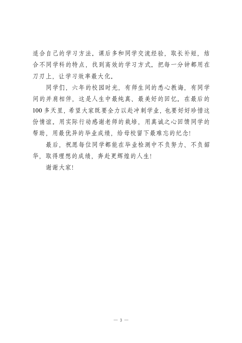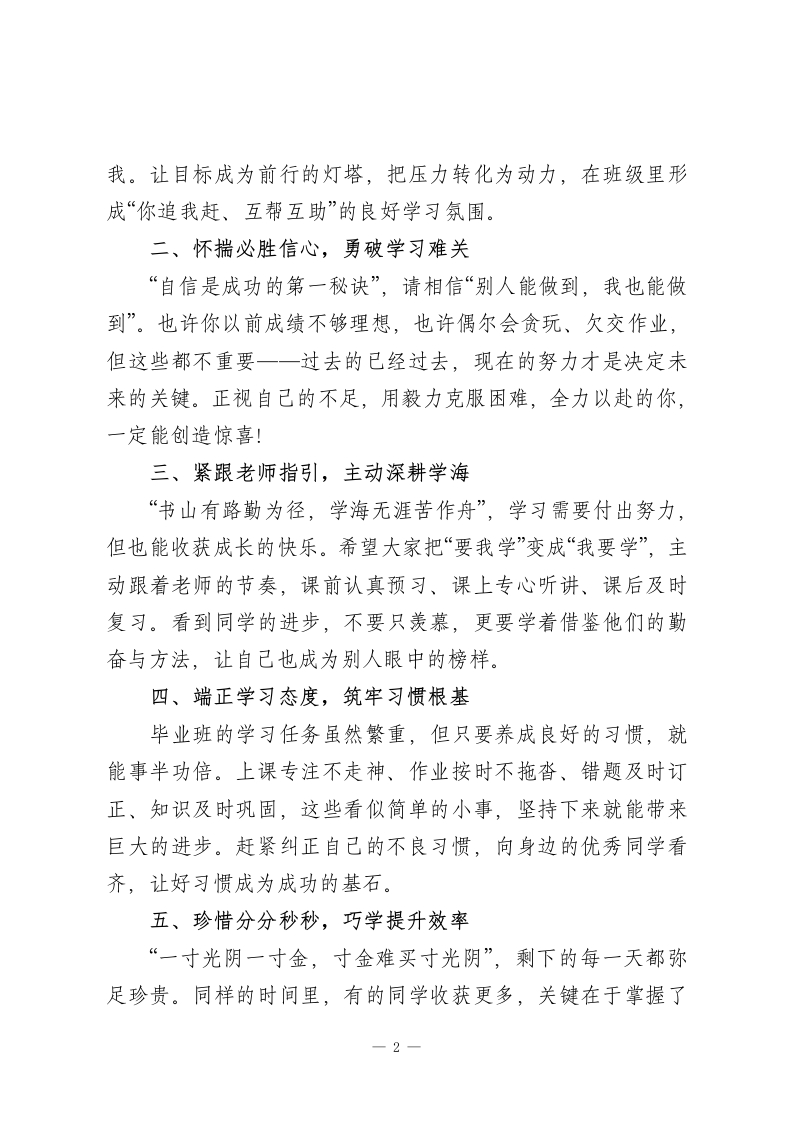 小学毕业班动员大会校长讲话:珍惜时间,逐梦前行尊敬的老师们、亲爱的同学们:大家好!今天,我们六年级全体师生齐聚一堂,召开这场特殊的动员大会。再过短短100多天,同学们就要告别小学时光,迈向中学的崭新旅程。这100多天,是对六年小学学习的最后盘点,更是决定毕业检测成绩的关键冲刺期。我们XX小学是一所承载着光荣与梦想的学校,作为全县的示范校、窗口校,多年来斩获了全国、自治区、市、县各级各类荣誉。更值得骄傲的是,我校小学毕业检测总积分一直稳居全县第一,遥遥领先于其他学校。这份成绩,是历届师生共同奋斗的结晶,是每一届毕业班同学为母校挣下的荣光。如今,这份传承荣誉、树立榜样的重任,正式交到了你们手上!今年的毕业检测由XX市统一组织,我们的竞争对手不仅是县内各校,更是全市的同龄人。我相信,你们有信心、有决心,把“全县第一”的荣誉稳稳传承,更要让全市都看到XX小学学子的风采!在最后的冲刺阶段,我希望每位同学都能做到这五点:一、立下明确目标,点燃奋进动力结合自己的实际情况,制定一个“跳一跳够得着”的目标。不要满足于现状,更不要原地踏步,要敢于挑战自我、超越自-1