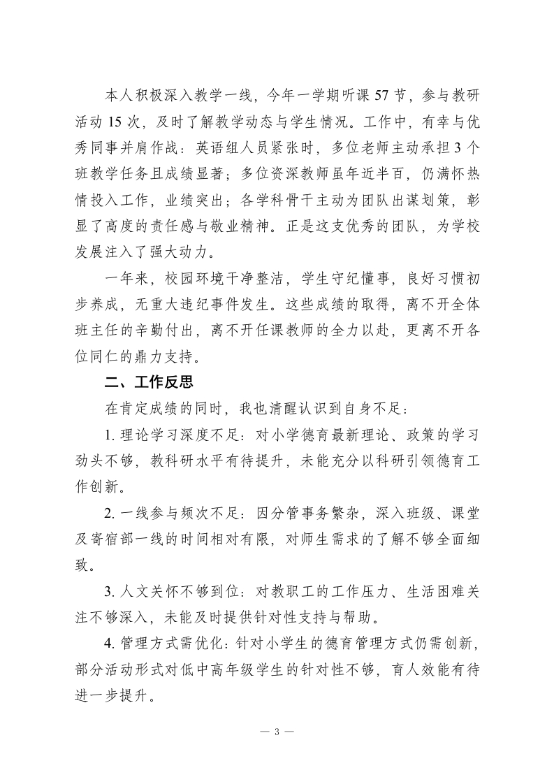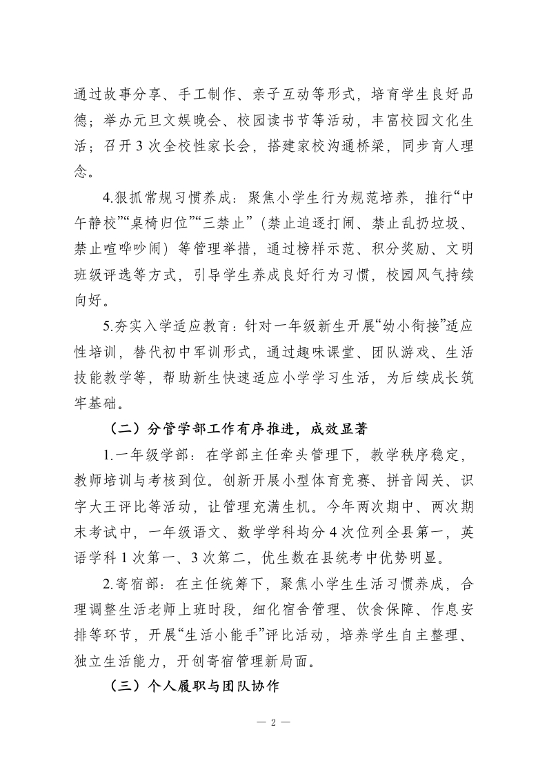 小学德育副校长2025述职报告尊敬的各位领导、各位同仁:大家好!今年,我协助校长分管学校德育工作、一年级学部及寄宿部工作。在县局领导、校领导的关心指导和全体同事的支持帮助下,我立足小学阶段学生成长特点,扎实推进各项分管工作,在实践中积累经验,在创新中提升效能,较好地完成了年度工作目标。现将履职情况从工作汇报与工作反思两方面作如下述职,请各位评议。一、工作汇报(一)德育工作提质增效,筑牢育人根基一年来,在政教处主任牵头、副主任协助下,德育工作高效推进,亮点纷呈:1.强化班主任队伍建设:定期召开班主任经验交流会4次、工作例会12次,通过案例分享、技能培训、师徒结对等形式,提升班主任班级管理能力与德育专业素养。2.打造学校品牌荣誉:成功迎接各类验收评估,一年内斩获三项省级荣誉,先后被评为“省绿色学校“省先进体育学校“省文明单位”,彰显学校育人成效。3.丰富活动育人载体:结合小学生年龄特点,开展系列特色活动一一举办校第三届艺术节、第六届体育运动会,常态化推进“阳光体育活动”,让学生在运动中强健体魄;迎接县“四个一”验收并获一等奖,开展“感恩教育“红色启蒙”等主题活动,1