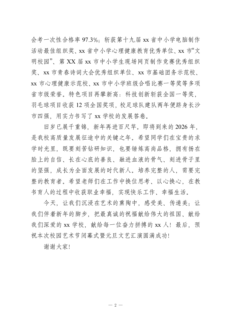 校园艺术节闭幕式暨2026元旦文艺汇演校长致辞:艺彩绽芳华,逐梦启新程尊敬的各位领导、各位家长,亲爱的老师们、同学们:大家下午好!金蛇辞旧岁,瑞雪迎新春。在这辞旧迎新的美好时刻,我们欢聚一堂,隆重举行Xx学校第X届“艺彩Xx,舞动青春”校园艺术节闭幕式暨2026年元旦文艺汇演。我谨代表学校行政,向全校师生员工、各位家长,以及观看晚会直播的社会各界人士,致以最亲切的问候和新年的美好祝福!向长期关心、支持学校发展的各级领导与各界朋友,表达最诚挚的感谢和崇高的敬意!艺术是心灵的栖息地,是陶治情操、滋养精神的沃土。一位著名教育家曾说:“教育如果没有美,没有艺术,那是不可思议的。”本届校园艺术节精彩纷呈、亮点纷呈:“xx梦之声”校园歌手大赛唱响青春旋律,趣味盎然的游艺活动传递欢乐能量,翰墨飞扬的书画摄影展展现创作才华,每一项活动都彰显着Xx学子阳光向上、朝气蓬勃的精神面貌。今天的文艺汇演,既是对第三届校园艺术节的圆满总结,更是对2025年的深情回望,对2026年的美好憧憬。生活需要仪式感,这份相聚与展演,正是给岁月添上温情、给憧憬加上份量的珍贵时刻。岁月不居,天道酬勤。2025年,每一位Xx人都在自己的岗位上奋力拼搏、砥砺前行。我们挥洒汗水、付出辛劳,也收获了沉甸甸的成果:学校学业水平考试一次性合格率100%,生地1