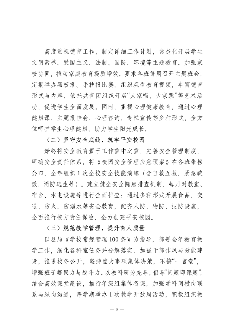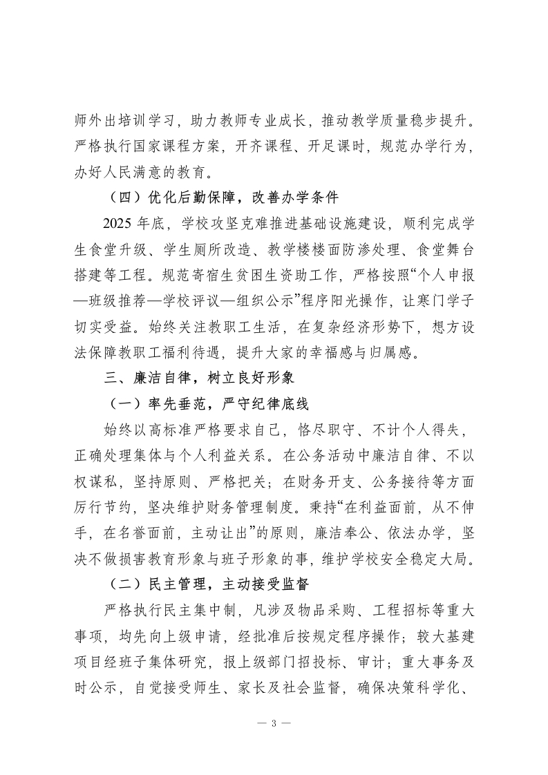 校长2025述职述廉报告:廉洁履职守初心,务实笃行育桃李尊敬的各位领导、同志们:2025年,我与全体师生同心同德、真抓实干、同甘共苦,推动学校教育教学及各项工作稳步推进、成效显著。现将本人全年履职情况及廉洁自律表现简要报告如下,请各位评议。一、勤学善思,筑牢履职根基(一)强化理论武装,坚定政治方向深入开展作风建设相关活动,牵头推进“一校五园”(平安、书香、生态、信息、健康校园)创建工作。按照县委和局党委要求,组织党员教师深入学习党的二十大精神及习近平新时代中国特色社会主义思想,深刻领会核心要义,以科学理论统领学校工作全局。完成干部在线学习任务,通过系统学习政治理论与法律法规,坚定理想信念,增强责任感与使命感,提升依法办学、依规管理的能力。(二)深耕业务学习,提升管理水平注重借鉴名校先进经验,更新教育观念与管理方法。在校内完善班主任选聘体系,推行“年级组一备课组纵横管理”模式,坚持开门办学、规范办学行为;优化教师考核与奖惩制度,充分调动教职工工作积极性,让学校管理更趋完善、更具人性化。二、务实担当,推动学校高质量发展(一)创新德育模式,培育时代新人一1