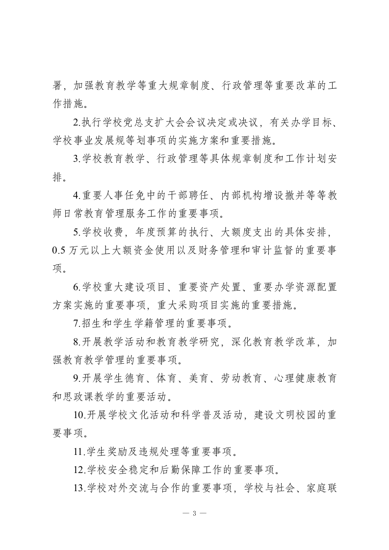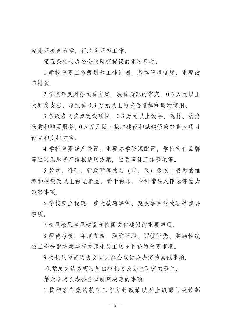 校长办公会议(校务会议)议事规则一办事流程一、总则第一条为切实加强党的领导,坚持党委领导下的校长负责制,不断提高依法治校、科学决策、民主管理的能力和水平,促进学校行政管理工作的制度化、规范化,更好地提高工作效率,根据《中国共产党章程》、中央办公厅《关于建立中小学校党支部领导的校长负责制的意见(试行)》《义务教育法》以及省委办公厅《关于建立中小学校党支部领导的校长负责制的实施方案》等法规文件,制定本规则。第二条落实党组织领导的校长负责制。校长在学校党支部领导下,依法依规行使职权,按照学校党支部有关决议,全面负责学校的教育教学和行政管理等工作。第三条校长办公会议是学校行政议事决策机构,坚持全面贯彻党的教育方针,坚持社会主义办学方向,落实立德树人根本任务,紧密围绕学校改革发展稳定,科学决策、民主决策、依法决策,全面推进学校教育教学、行政管理等工作,组织落实党支部有关决议、研究和处理学校行政工作中重要事项的工作会议。二、议事决策范围第四条校长办公会议主要研究提出拟由学校党支部讨论决定的重要事项方案,具体部署落实党支部决议的有关措施,研1