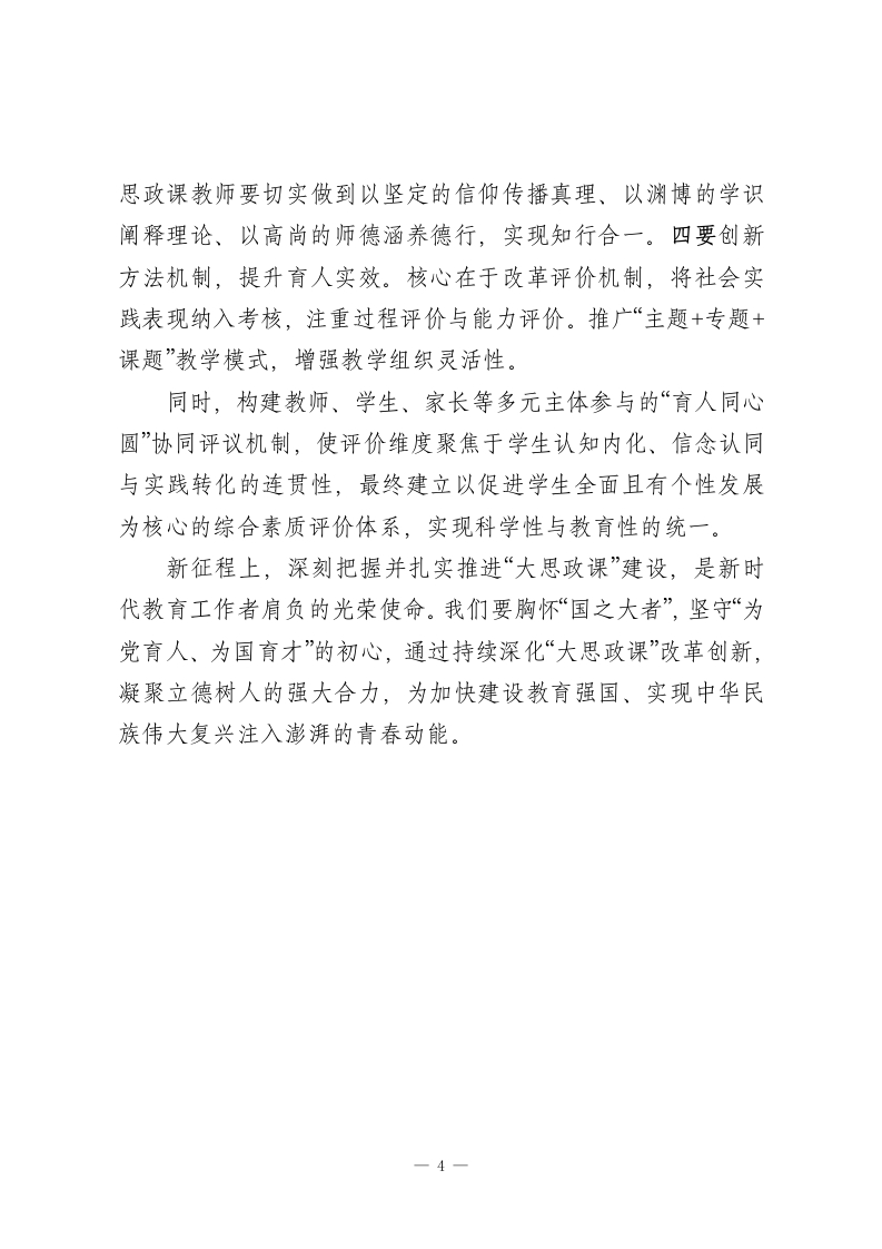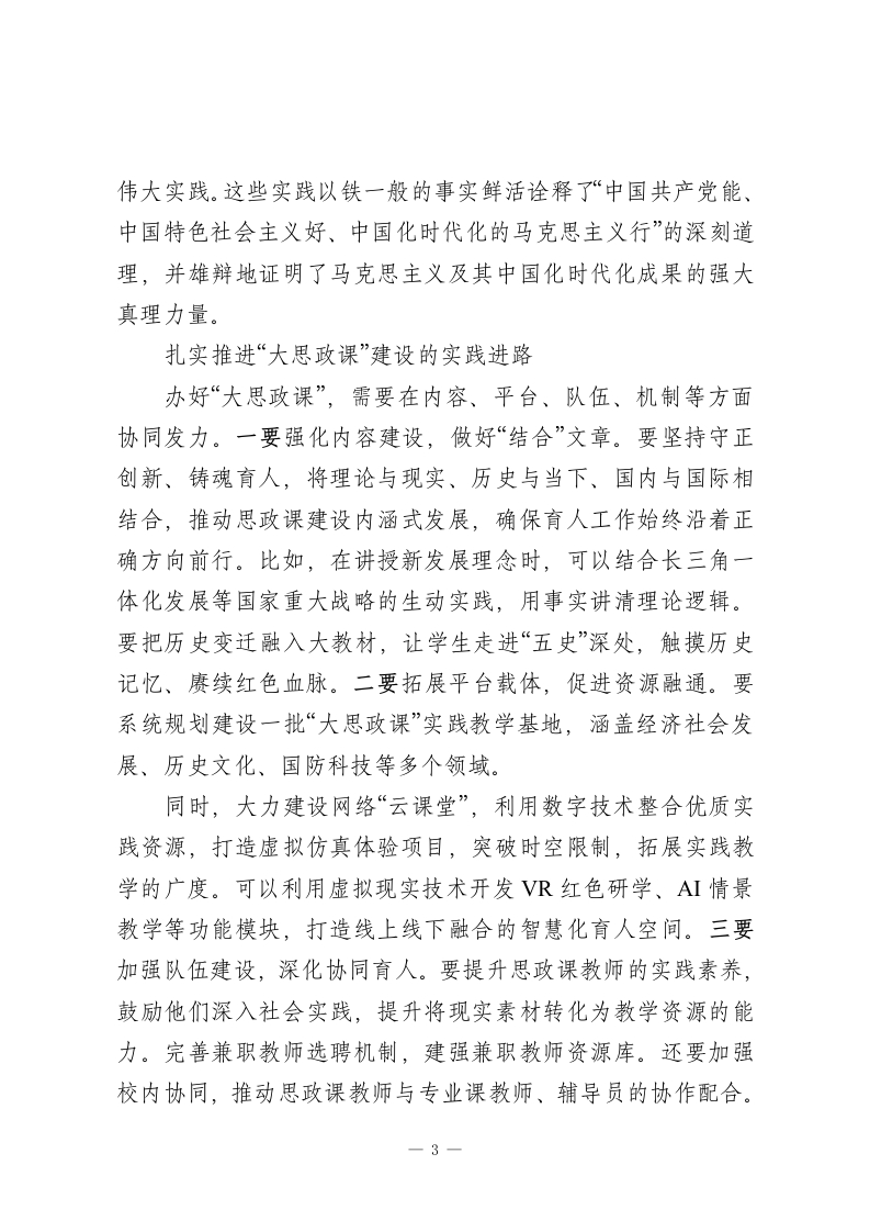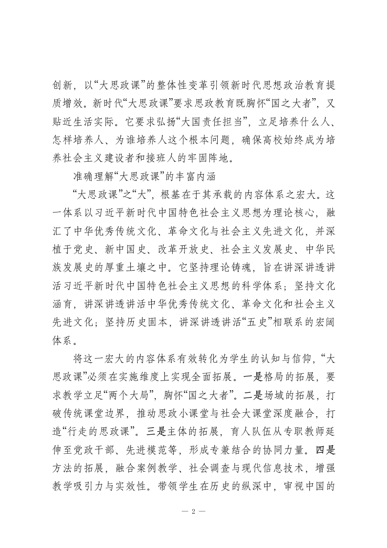 校长讲话:办好新时代“大思政课”,战略意义、丰富内涵与实践进路“大思政课”的实践深化,源于对育人规律、时代特征和学生特点的深刻把握,是培养担当民族复兴大任时代新人的战略举措。新征程上,需要我们立足“两个大局”,深刻把握其战略意义、内在逻辑与实践进路。深刻把握“大思政课”的战略意义“大思政课”的提出具有深刻的战略考量和时代必然性。其一,这是应对“两个大局”交织激荡的必然要求。当前,世界百年大变局加速演进与中华民族伟大复兴战略全局深度互动。青年学生价值观塑造面临复杂环境,迫切需要打破传统课堂边界,通过理论与实践的结合,引导学生在现实比较中增强辨别力、坚定理想信念。其二,这是遵循“三全育人”规律的具体体现。思想政治工作不能脱离实际,通过“大思政课”建设,融汇校内校外资源,实现育人主体的全员参与、过程的全域覆盖、要素的全面整合,推动思政理论教学与社会实践体验有机联动,最终形成协同育人的倍增效应。其三,这是适应青年认知特点的创新之举。当代青年思维活跃、注重体验,“大思政课”通过组织学生深入社会基层、实践一线,让学生在亲身体验中实现从认知到认同的转化。面对教育领域内外部环境的深刻变革,必须破立并举,推进系统性1