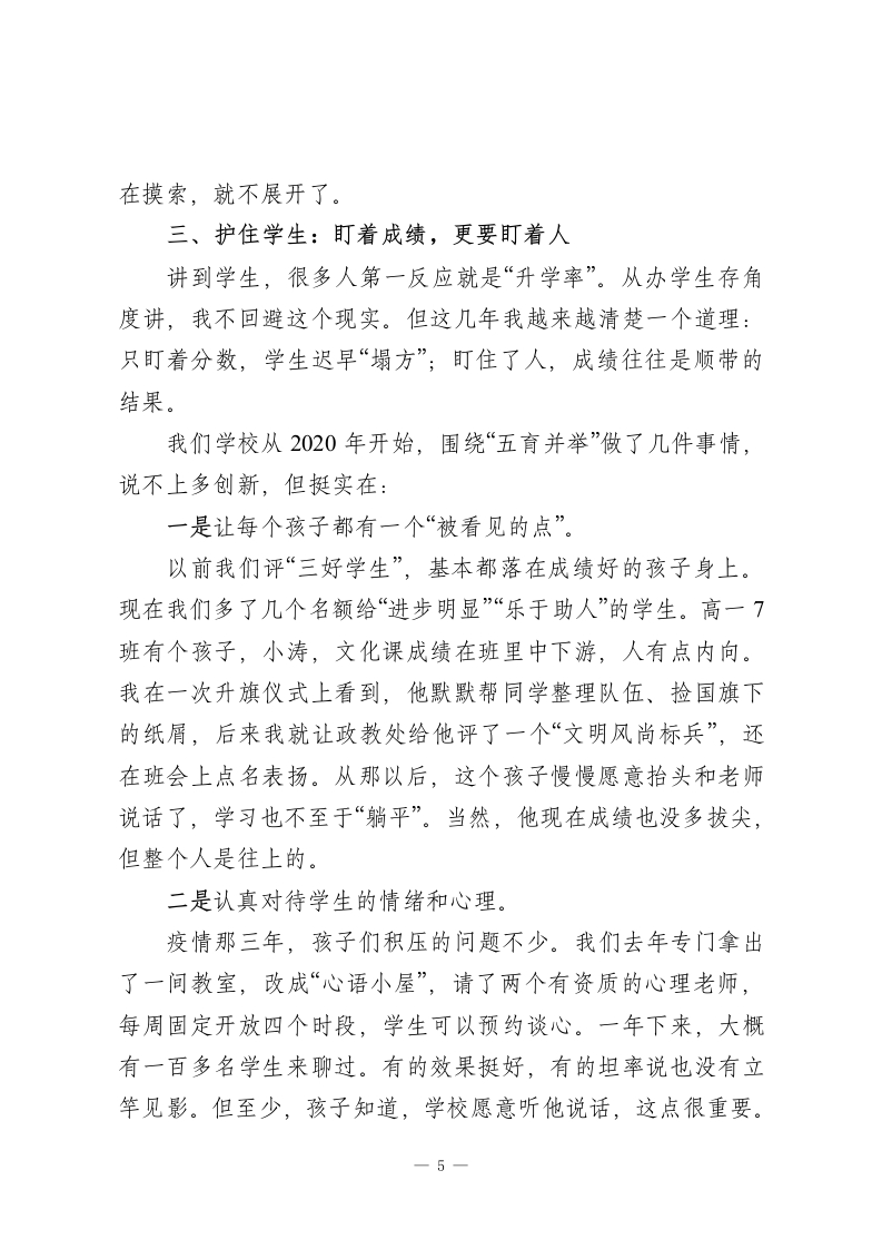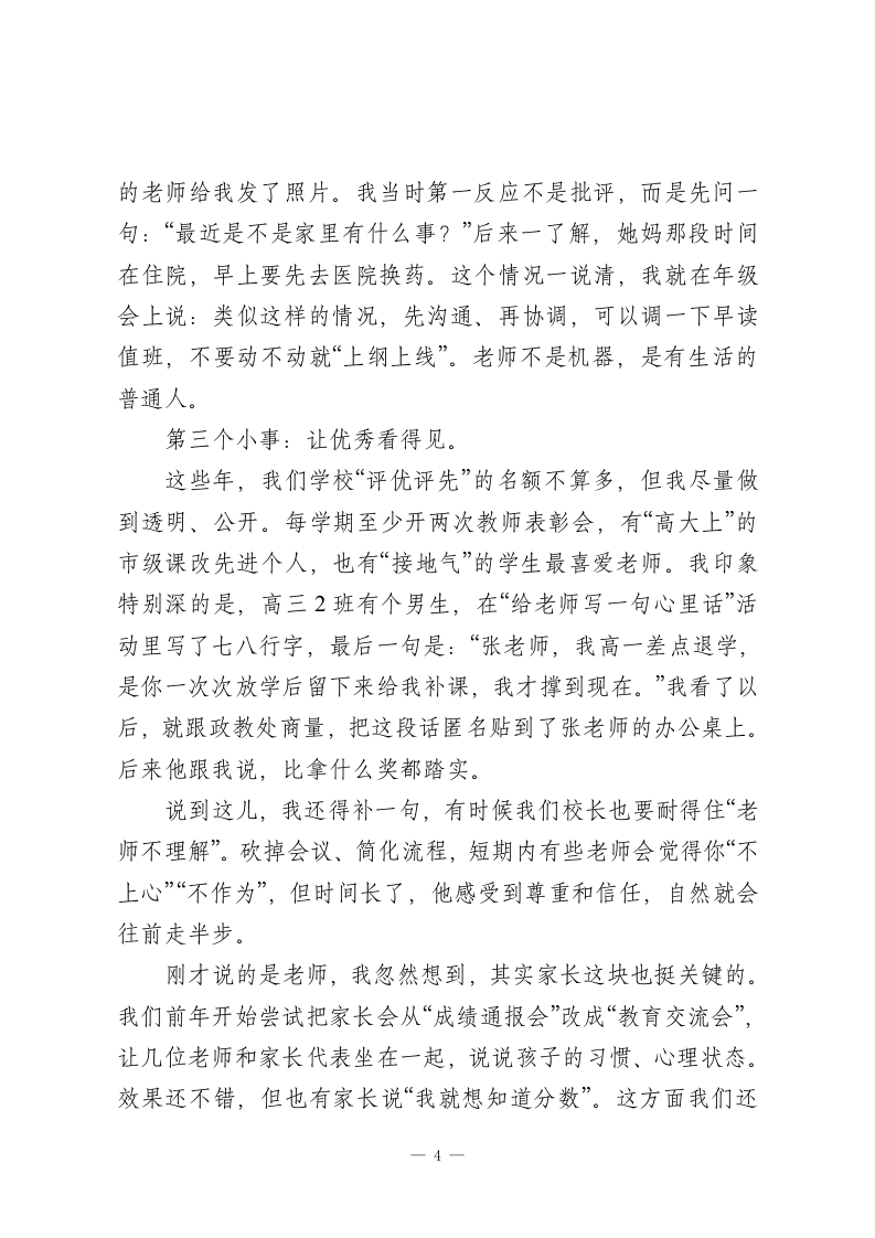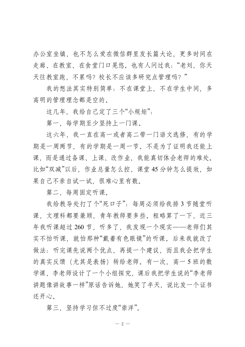 校长经验交流会上发言:当校长这些年,我就琢磨明白了三件“小事”!各位同仁、各位校长:大家上午好!今天来参加这个经验交流会,主办方提前跟我说,“老刘,你得好好准备一下,把你们学校这几年怎么起色的,好好讲讲模式、讲讲经验”。老实讲,我一开始还有点犯难一因为在我们学校,我自己总跟老师们说的一句话是:别整太复杂,咱就把简单的事做好。我们学校是个普通县城高中,31个教学班,在校学生差不多1600人,专任教师78名。2019年我接任校长的时候,高考本科上线人数是186人,去年是243人,今年的预估也还不错;但我更看重的几个数据是:近三年,教师队伍稳定率在95%以上,学生严重违纪人数明显下降,德育处的黄本子,现在半个月也写不满一页了。这几年,我越来越有一个朴素的感觉:校长这个岗位,说大可以很大,说小,其实就三件事一一把自己先站稳,把老师托住,把孩子护好。换个通俗点的说法:提升好自己、服务好教师、呵护好学生。下面我就不讲什么高大上的词,就从这三件“小事”聊一聊,算是交个作业。一、先把自己站稳:校长不能“离地”有老师开玩笑说,我这个校长有点“不上道”一一不怎么在1