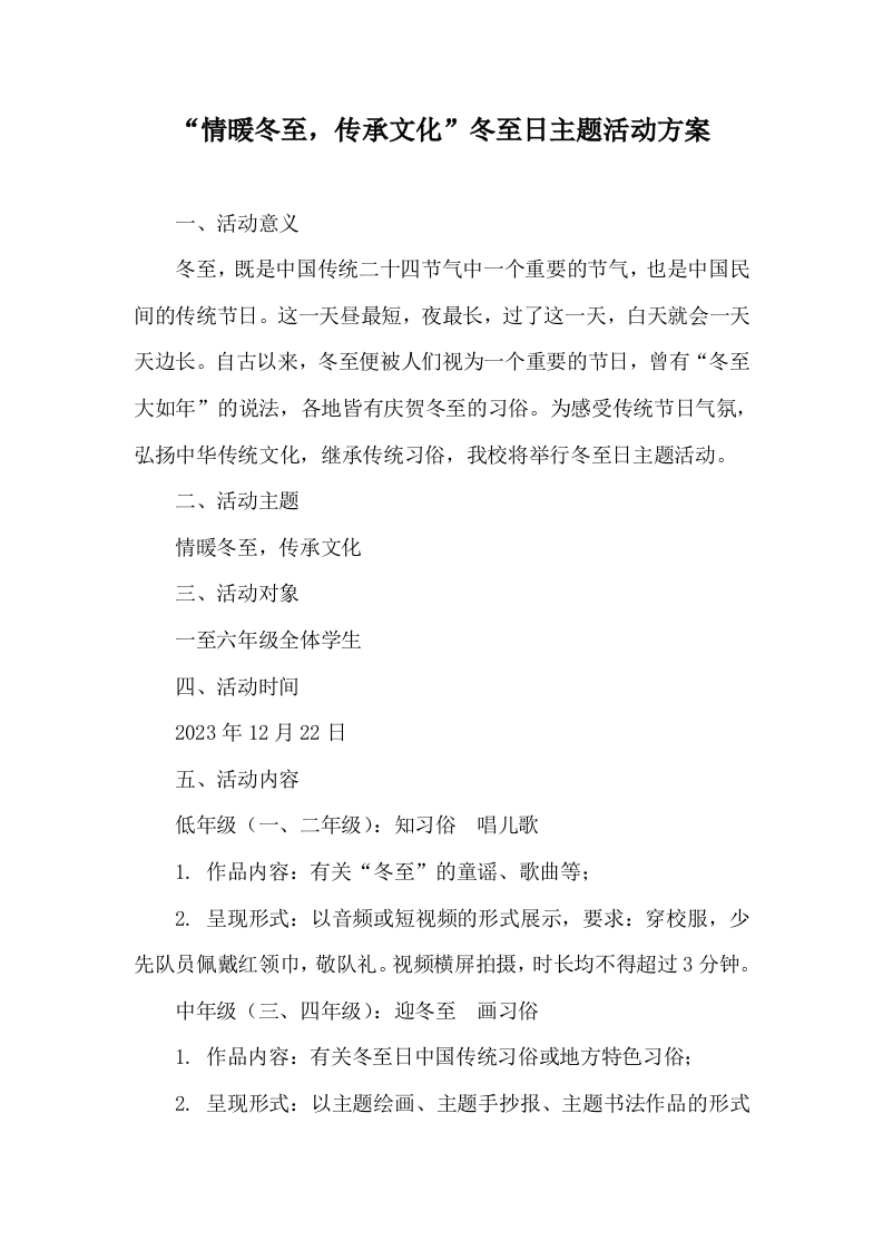 “情暖冬至,传承文化”冬至日主题活动方案一、活动意义冬至,既是中国传统二十四节气中一个重要的节气,也是中国民间的传统节日。这一天昼最短,夜最长,过了这一天,白天就会一天天边长。自古以来,冬至便被人们视为一个重要的节日,曾有“冬至大如年”的说法,各地皆有庆贺冬至的习俗。为感受传统节日气氛,弘扬中华传统文化,继承传统习俗,我校将举行冬至日主题活动。二、活动主题情暖冬至,传承文化三、活动对象一至六年级全体学生四、活动时间2023年12月22日五、活动内容低年级(一、二年级):知习俗唱儿歌1.作品内容:有关“冬至”的童谣、歌曲等:2.呈现形式:以音频或短视频的形式展示,要求:穿校服,少先队员佩戴红领巾,敬队礼。视频横屏拍摄,时长均不得超过3分钟。中年级(三、四年级):迎冬至画习俗1.作品内容:有关冬至日中国传统习俗或地方特色习俗:2.呈现形式:以主题绘画、主题手抄报、主题书法作品的形式