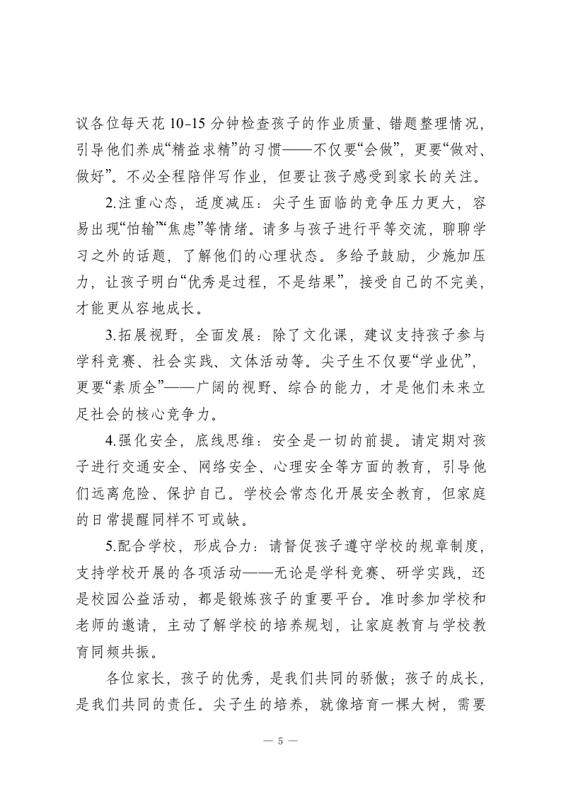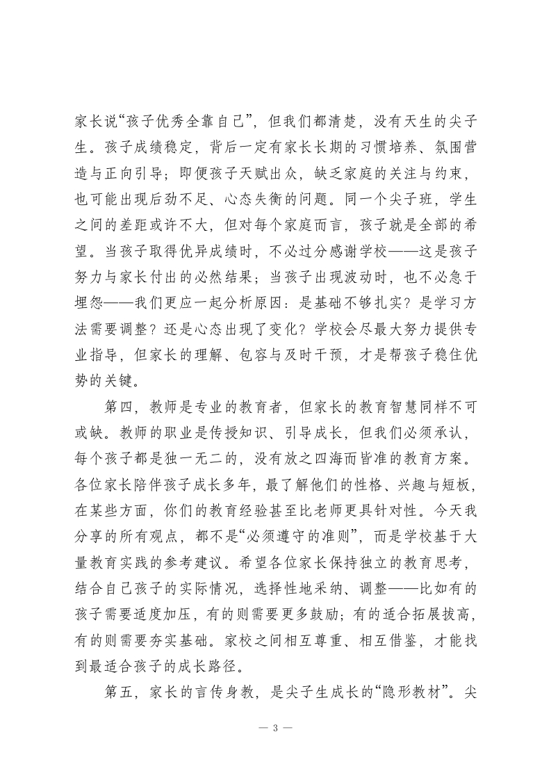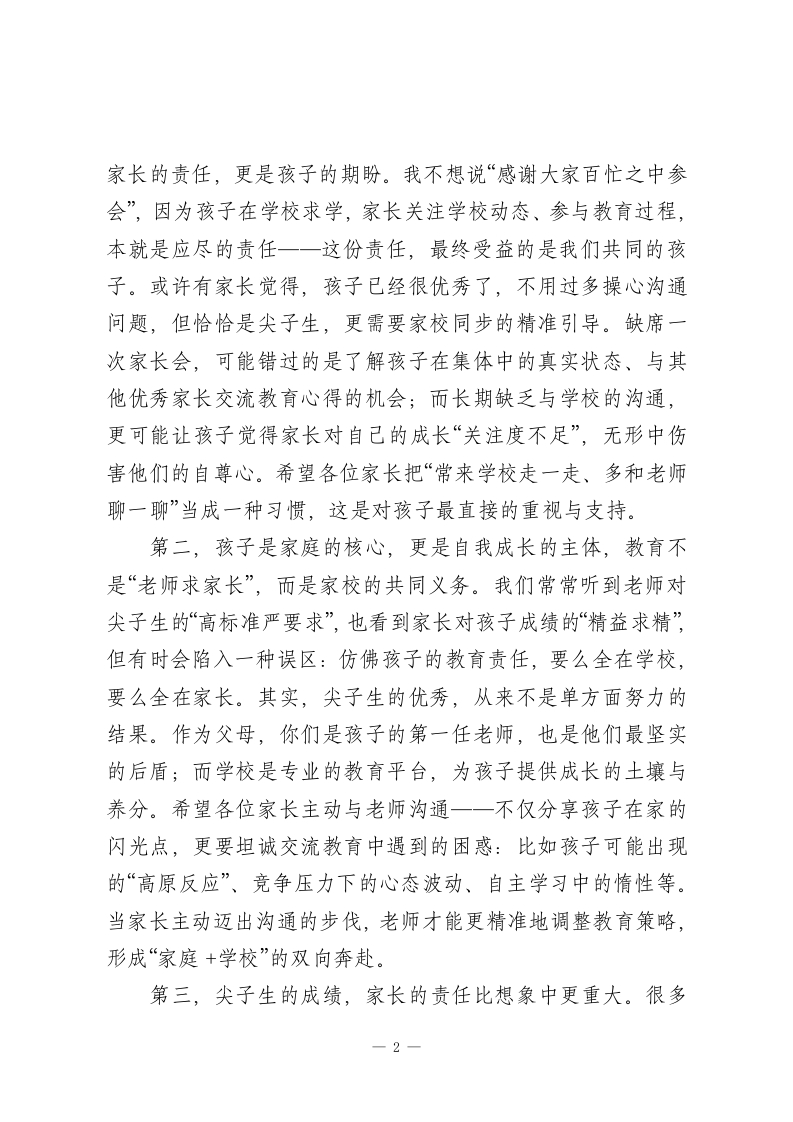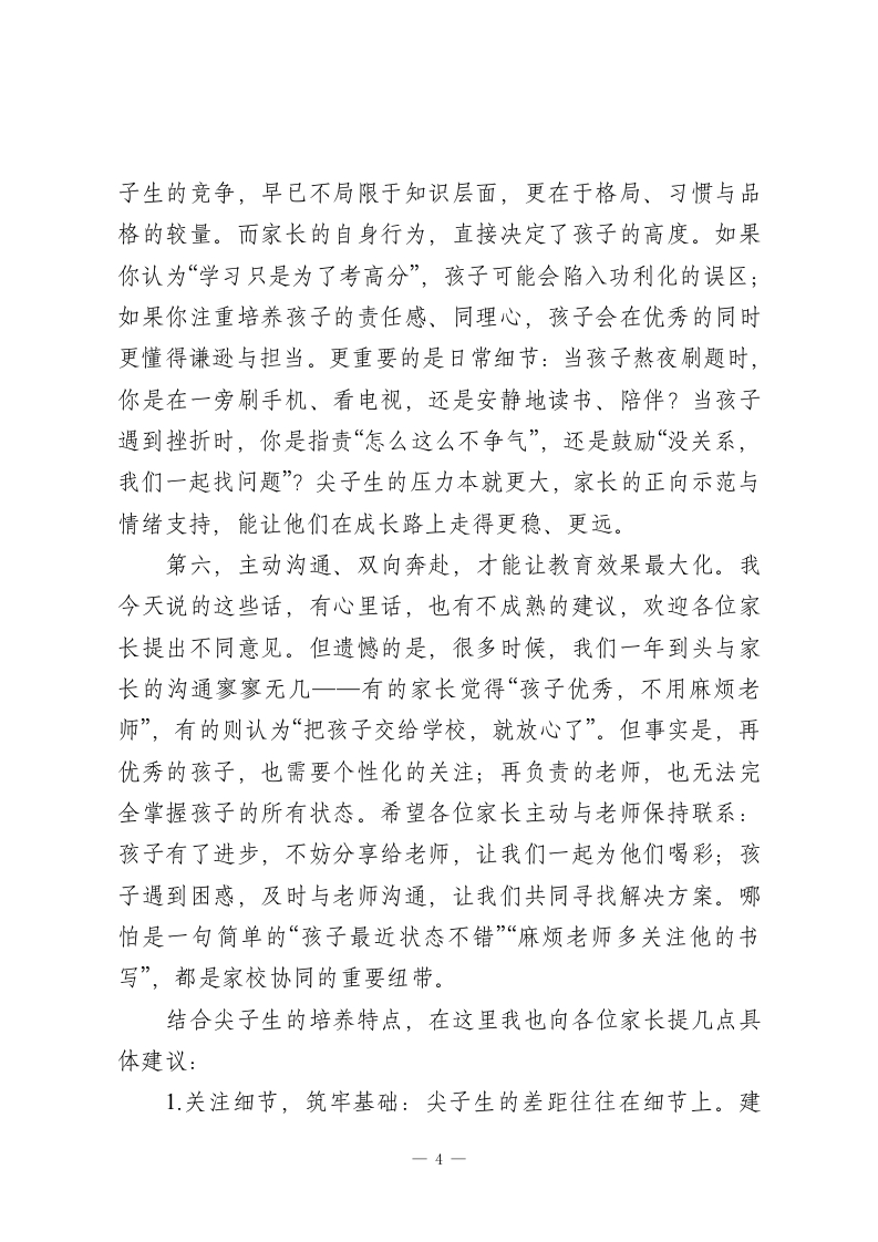 校长在尖子生家长会上的讲话:跳出“唯分数”陷阱,共育有格局、有后劲的尖子生尊敬的各位家长:下午好!首先,我代表学校全体师生,向在百忙之中莅临本次家长会的各位表示诚挚的欢迎与衷心的感谢!今天,我们因一群优秀的孩子相聚于此一一他们是学校的骄傲,更是各位家庭的荣光。此刻坐在这里,我们怀揣着共同的期许:不仅要让这些尖子生保持优势,更要助力他们全面发展、勇攀高峰。召开本次家长会,核心目的就是搭建家校沟通的坚实桥梁,让各位深入了解学校对尖子生的培养规划,也让学校倾听家长们的教育智慧,形成教育合力,为孩子们的未来筑牢根基。当下,教育已成为社会关注的焦点,而尖子生的成长更是牵动着每一个家庭的心。我们深知,能培养出如此优秀的孩子,各位家长必然在教育上倾注了大量心血,也积累了宝贵经验。但与此同时,尖子生的教育也面临着独特的挑战:如何避免“重成绩轻素养”的误区?如何引导孩子突破瓶颈、实现更高层次的成长?如何让优秀成为一种习惯,而非负担?今天,我想结合学校的教育实践与各位家长的责任,分享几点心里话,与大家共勉:第一,家校共育是尖子生成长的“双引擎”,而来校沟通是-1-