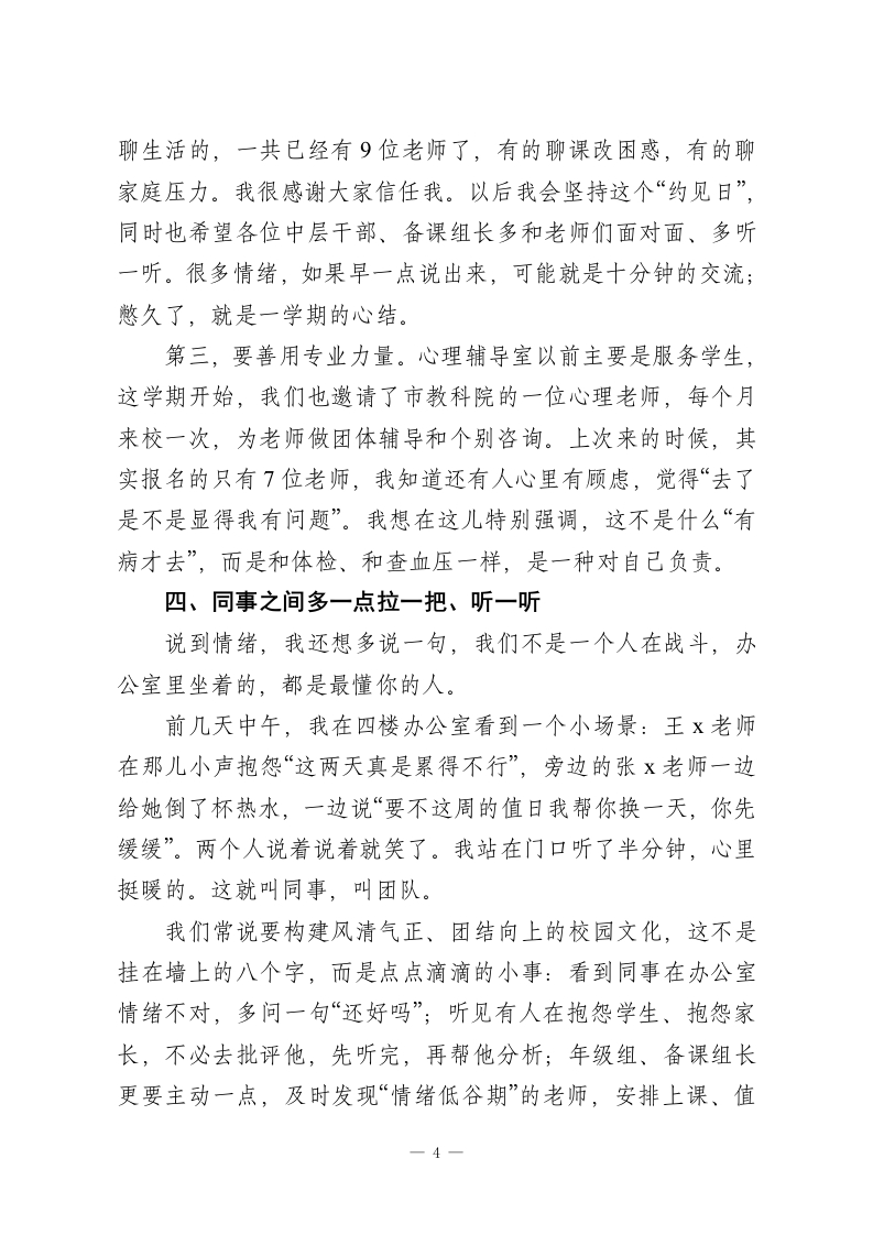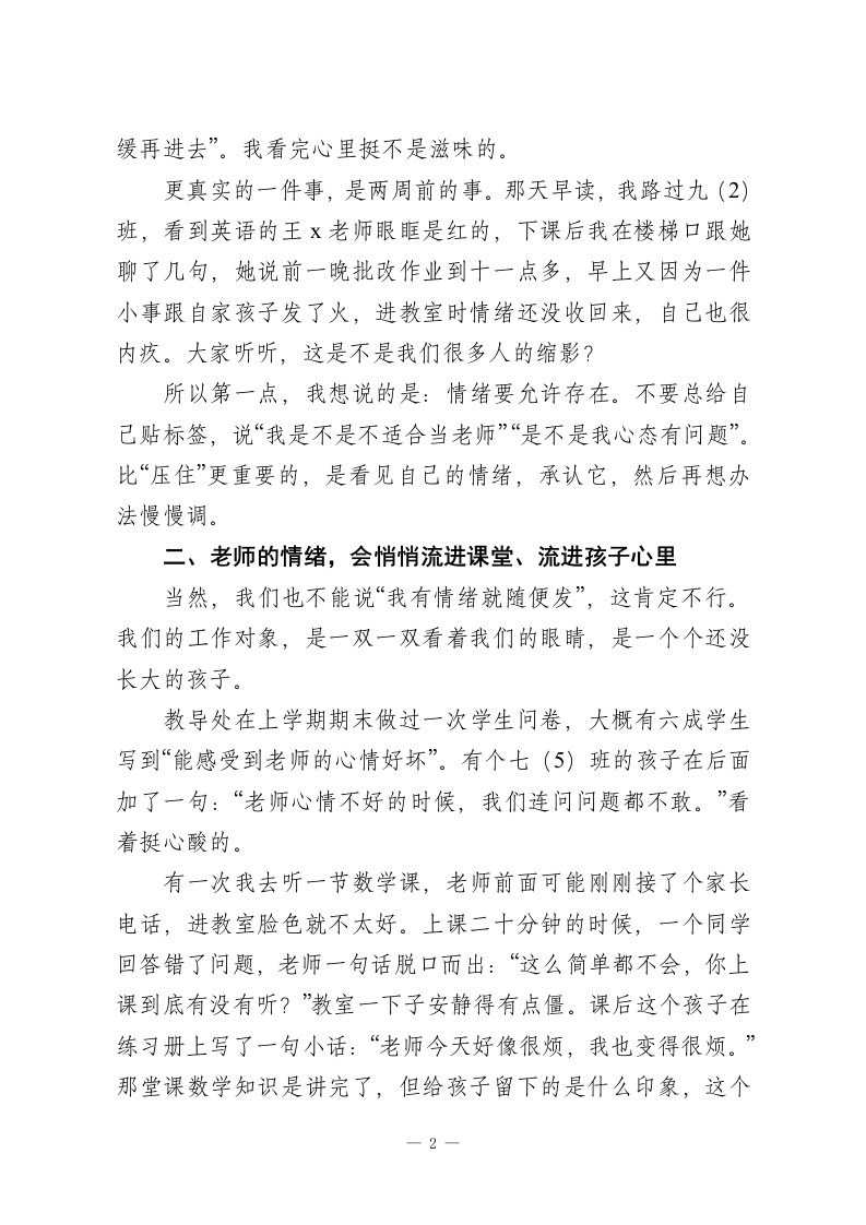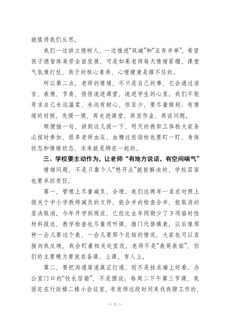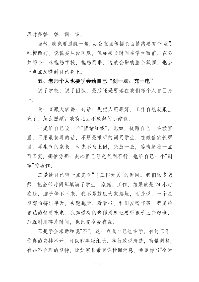 校长在全体教师会上讲话:先照顾好自己,才能更好地照亮学生!各位老师:下午好!今天这个会,本来教导处安排的是教学常规检查反馈,我临时和几位副校长商量了一下,把顺序调了调。原因很简单,这段时间,我在走廊上、在办公室里,看到了太多老师疲惫的背影、听到了不少叹气声,我觉得,再讲数据、讲质量之前,我们得先聊一聊“人”,聊一聊我们自己的情绪、自己的状态。说实话,我们这个行业,压力大是出了名的。教导处统计了一下,上学期全校老师病、事假加起来有三十多天,其中一半以上都集中在期末前后那两个星期;平均每位老师一周课时在18到20节之间,班主任更多,有的能到22节。早晨七点多,我在七(3)班门口看到语文老师抱着一摞作业边走边看,中午十二点半,三楼办公室还有老师在对着电脑做课件。这样的节奏,情绪要是一点波动都没有,那才不正常。一、情绪不是“毛病”,先承认,才能谈调整先把话说清楚:有负面情绪,不是你不专业,更不是你不负责任,而是你是一个有血有肉的普通人。上个月,教科室做了一个匿名小调查,一共回收了四十多份问卷,大概有七成老师在“最近三个月最大的困扰”那一栏里写了“长期疲惫”“睡眠不好”“心累”这些词。有位老师写得很直接,说“有时候走进教室之前,真想在走廊上多站两分钟,缓一1