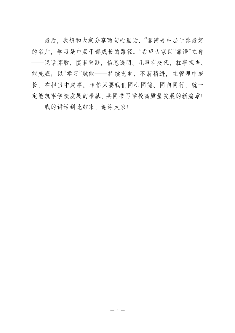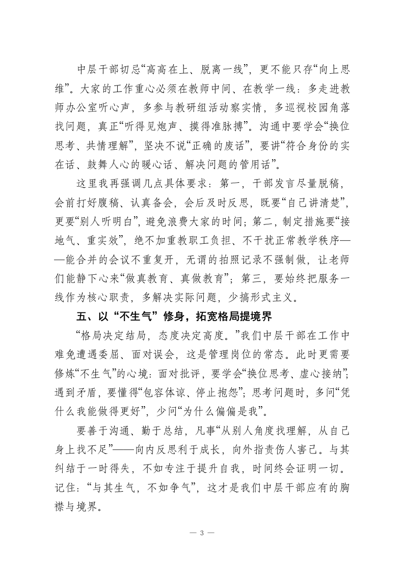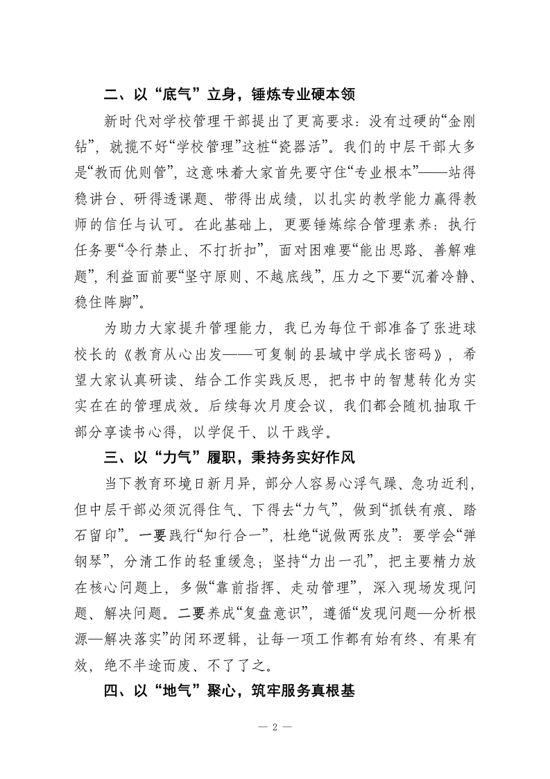 校长在学校中层班子会议上讲话:涵养“五气”抓实效,共促学校新发展各位中层干部:大家下午好!常有人说“一位好校长成就一所好学校”,这话虽肯定了校长的引领作用,但教育从来不是独角戏。一所学校要实现高质量运行、可持续发展,离不开班主任团队的勤勉务实,离不开教师团队的深耕教研,更离不开我们中层干部团队的承上启下、担当作为一一你们是学校管理的“中坚力量”,是连接校领导与一线师生的“桥梁纽带”,责任重大、使命光荣。本学期,学校已正式建立中层干部月度工作会议机制,“学习提升”也将作为每次会议的核心议题。今天,我想围绕“涵养‘五气’,从心出发”这个主题,与大家深入交流如何当好中层干部、履职尽责,也给大家提几点希望和要求。一、以“朝气”立魂,涵养教育使命感孟子说“得天下英才而教育之,三乐也”。教育本身就是一份充满荣光的事业,我们中层干部作为“教师中的骨干、团队中的标杆”,更要扛起这份使命与担当。一方面,要保持朝气蓬勃的精神状态,用向上向善的姿态感染身边每一位教师;另一方面,要找准自身定位一一做教师的“服务保障员”,及时解决教学与工作中的难题;做教师的“精神引领者”,用专业与热忱为团队注入动力。唯有满怀“朝气”,我们的管理工作才能充满温度与活力,才能带动整个团队焕发生机。1