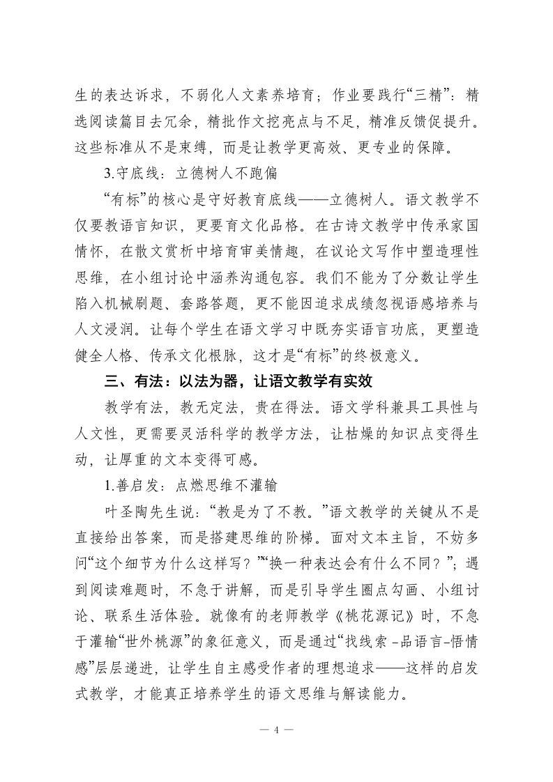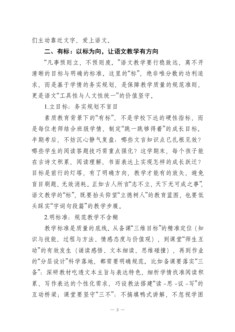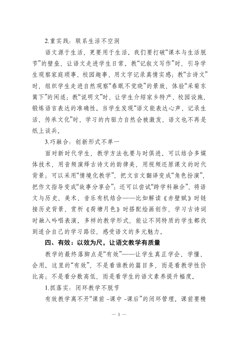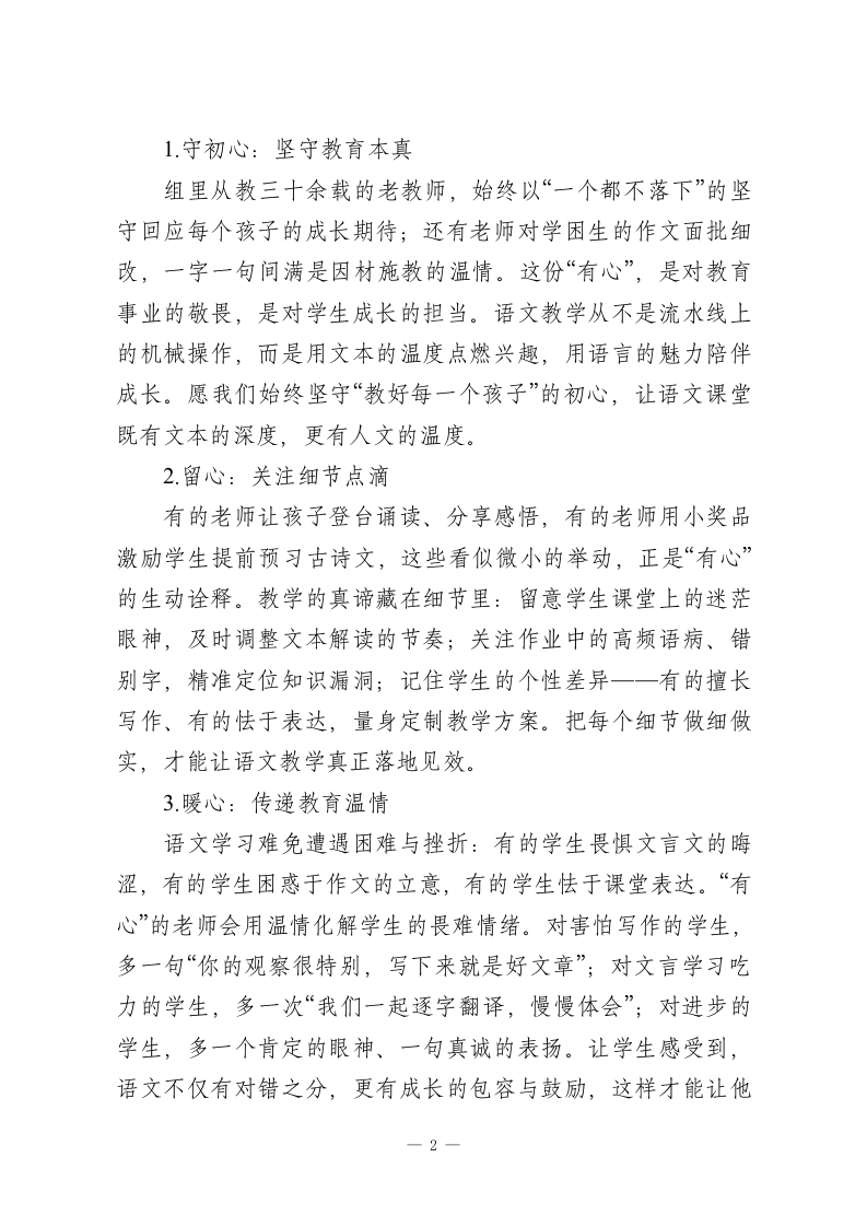 校长在语文组教研活动上的精彩讲话:聚焦“五有”筑根基,深耕语文润人文各位语文老师:今天沉浸式参与我们语文组的教研活动,既聆听了两位老师干货满满的经验分享,也见证了大家在提质增效路上的巧思与深耕,心中满是感动与敬意。正如分管教学的校领导所言,每位语文老师要扛起两个班级近百名学生的教学重任,背后牵动着上百个家庭的期盼,这份压力可想而知。更让人动容的是,不少行政干部在繁杂的管理事务之余,依然深耕语文课堂一线,与各位老师并肩扛起教学重任。正是这份全员聚力的担当,让部分年级学业监测成绩亮眼夺目,也让学校语文教学的根基越扎越牢。教育是一场温暖的修行,语文教学更是人文的启蒙与深耕。语言是思维的载体,文字是文化的根脉,语文教育既要夯实学生的语言运用能力,更要滋养其精神成长。结合今天的分享,我想以“五个有”与大家共勉,愿我们以初心为帆,以方法为桨,在语文教育的航道上稳步前行,让每个孩子都能收获语言的成长与精神的丰盈。一、有心:以心育心,让语文教学有温度苏霍姆林斯基说:“教育的本质是心灵唤醒心灵。”语文看似是文字与篇章的世界,但冰冷的铅字背后,藏着滚烫的人文力量。成为优秀的语文老师,首先要做“有心人”,把情感与责任注入每一个教学细节。1
