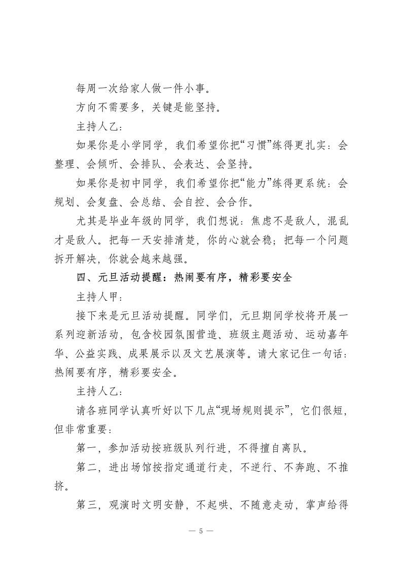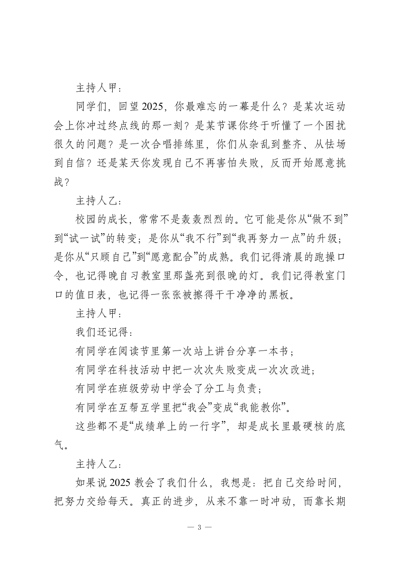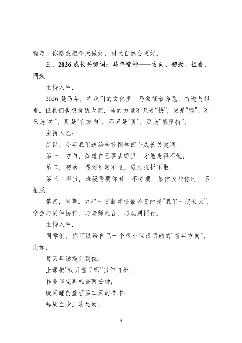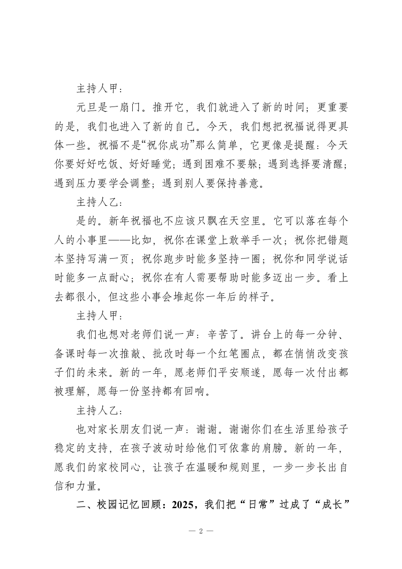 新岁有声,校园有光2026年元旦校园广播稿主持人甲:亲爱的老师们、同学们,大家早上好。这里是校园广播站。新岁的第一缕阳光已经落在操场上,树梢上也像挂着一层薄薄的金色。今天,我们在广播里相遇,共同迎来2026年的元旦。主持人乙:老师们、同学们,大家好。此刻无论你是在走进教室的路上,还是在整理书包、翻开课本,甚至只是抬头看了一眼窗外一一都请允许我们用一段声音,为你的新年开场。愿你心里有光,脚下有路,今天从容,明天可期。主持人甲:新年快乐。今天的特别节目,我们为你准备了:新年问候与校园祝福、2025校园记忆回顾、2026成长关键词、元旦活动提醒、点歌与寄语、文明安全温馨提示,以及最后的“新年宣言”时刻。希望每一位听到广播的你,都能带着更清晰的目标、更踏实的行动,迈出新年的第一步。主持人乙:如果你愿意,也可以把你的新年愿望写在心里,跟随我们的节目,一段一段地把“愿望”变成“行动”。那么,新岁的钟声已经敲响一我们正式开始。一、元旦问候:把祝福说具体,把温暖送到位-1