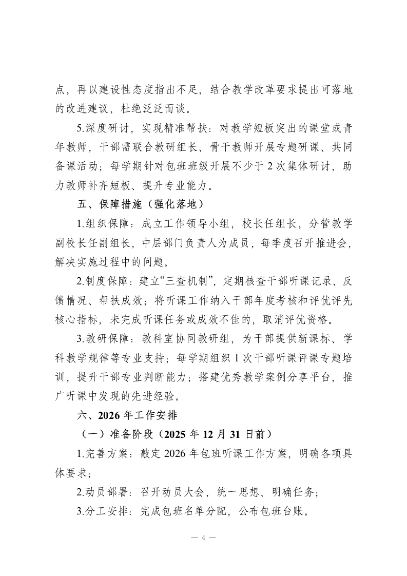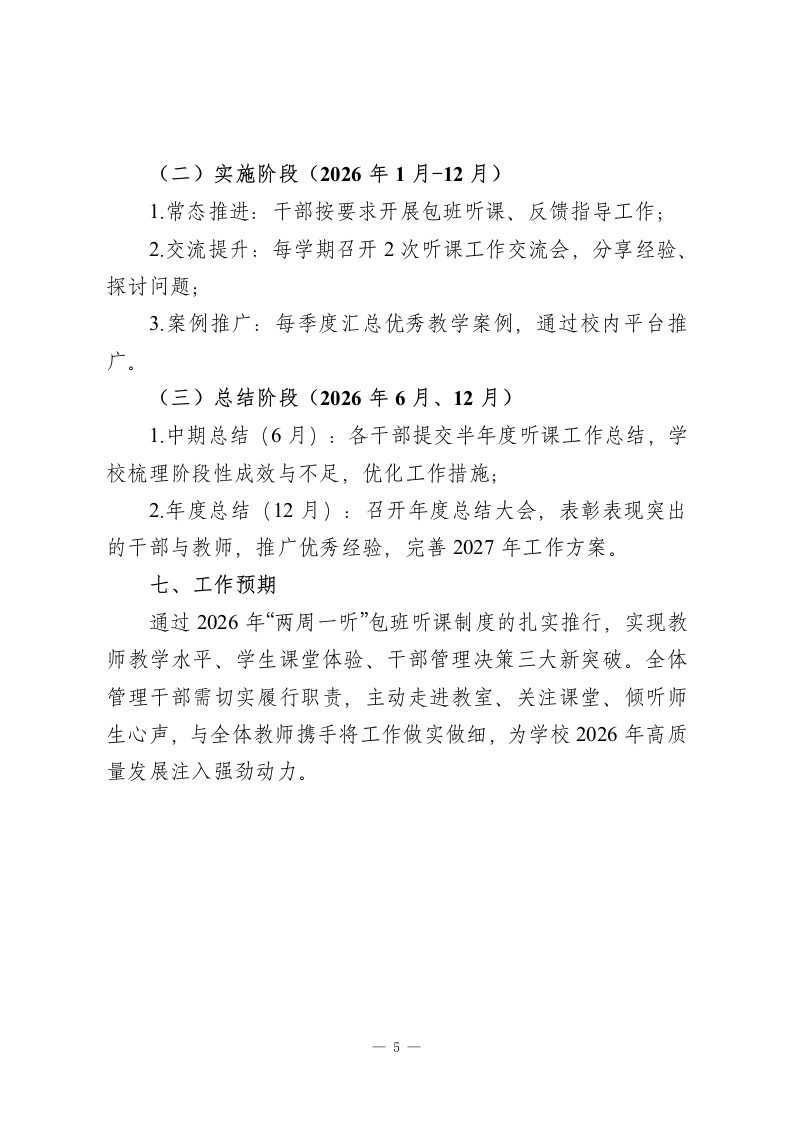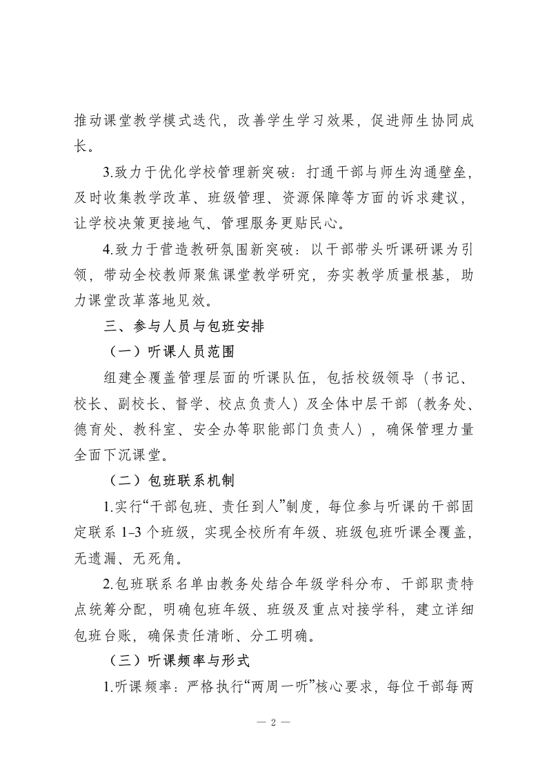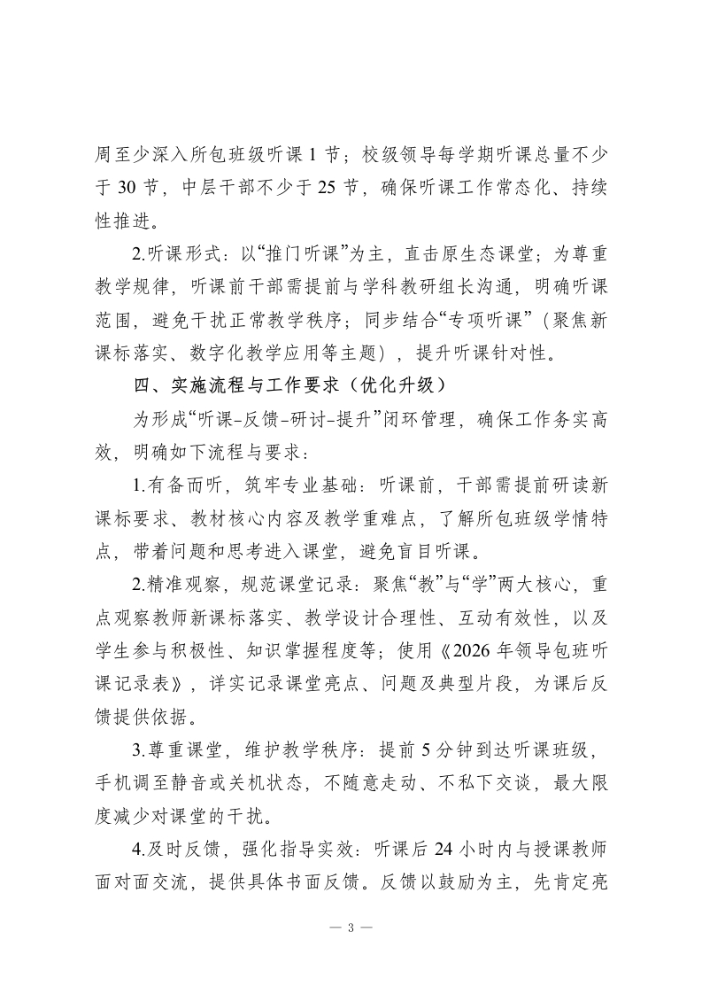 学校领导“两周一听”包班听课工作方案(2026修订版)为深入贯彻“以教学为中心”的办学理念,推动管理重心下沉课堂一线,精准掌握2026年教育教学实情,搭建管理与教学的深度沟通桥梁,助力教师专业成长与学生全面发展,全面提升学校教育教学质量,特修订本领导干部“两周一听”包班听课工作方案,作为2026年学校教学管理核心工作之一。一、指导思想以素质教育理念为指引,立足学校2026年高质量发展目标,将课堂作为教育管理的主阵地。通过领导干部常态化、制度化深入课堂听课,形成“人人关注课堂、潜心研究教学”的浓厚教研氛围,为教师专业成长赋能,为学生学习体验提质,为学校科学决策提供精准依据,推动学校整体办学水平实现新跨越。二、工作目标(重点聚焦)本次“两周一听”包班听课工作核心聚焦四个“新突破”,实现教学与管理双向提升:1.致力于掌握教学实情新突破:深入常态课堂,全方位了解新课标落实情况、教师教学方法创新、课堂组织效能等教情,以及学生课堂参与度、思维活跃度等学情,精准掌握一线教学真实状态。2.致力于促进师生成长新突破:通过精准诊断和针对性指导,为教师提供个性化、专业化教学建议,助力优化教学策略:1