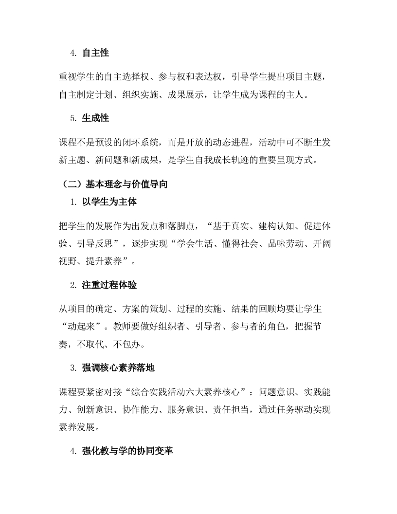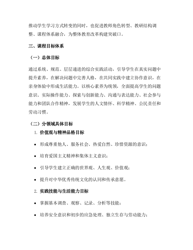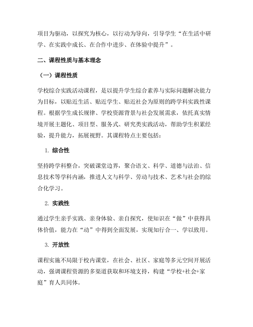 学校综合实践活动课程规划总体方案(2025年12月修订)一、指导思想与课程定位为深入学习贯彻党的教育方针,全面落实立德树人根本任务,积极推进国家新课程改革落地,根据教育部颁布的《义务教育课程方案(2022年修订)》《综合实践活动课程指导纲要(2023年版)》及《普通中小学综合实践活动课程实施指南》等文件精神,按照省、市、区相关教学工作的部署要求,结合学校“以人为本、实践育人、融合发展”的教育理念,特制定本校综合实践活动课程总体规划方案。综合实践活动课程是基础教育阶段的一门国家规定性必修课程,具有跨学科、重体验、强实践的特色,在教师指导下由学生自主参与,在真实生活情境中完成探究、服务、设计、创新等实际任务,是学生学习方式转变的重要途径,是发展核心素养的典型载体,是打破学科壁垒、贯通知行结合、融合五育并举的重要通道。本校将综合实践活动课程视为落实“五育并举”的关键抓手,围绕“贴近生活一服务成长一融入课程一协同推进”的基本思路,按照“课程化、项目化、融合化、常态化”的路径进行统筹安排,坚持以