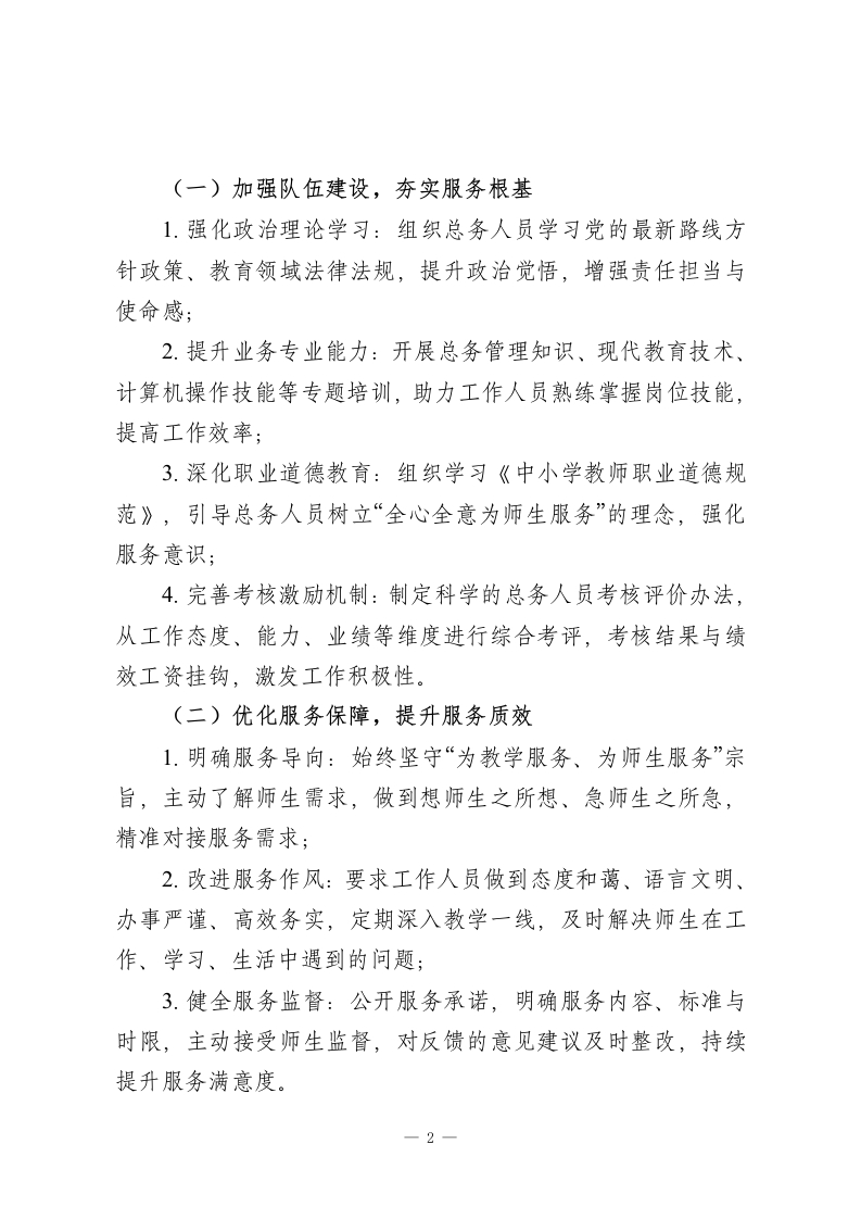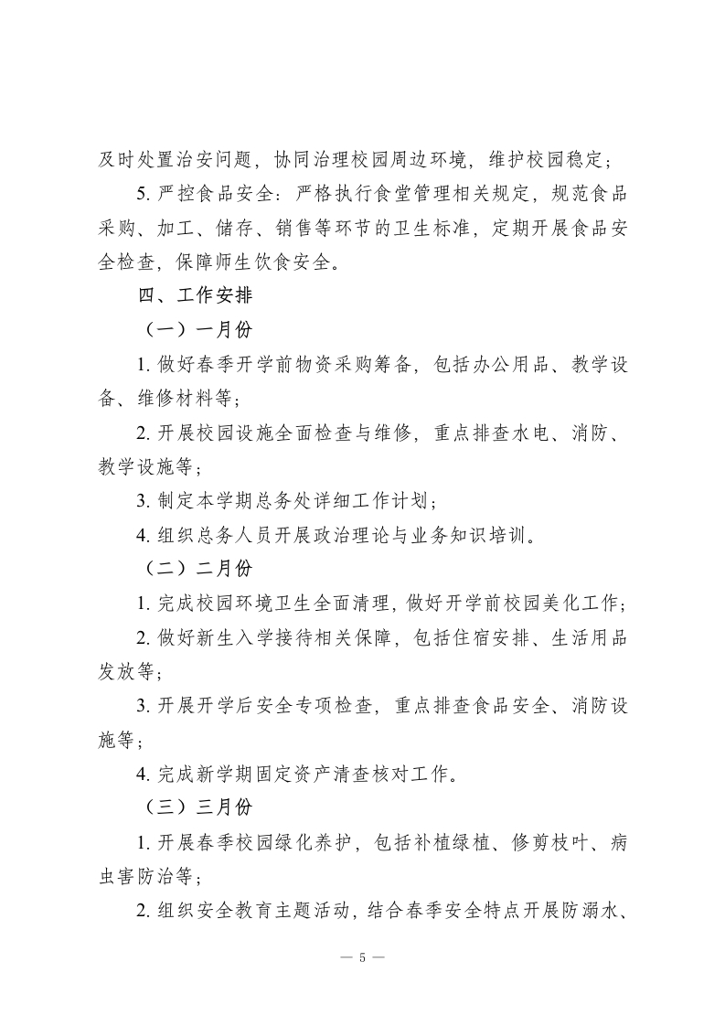 学校总务智绿创行一一2026年中小学总务处工作计划一、指导思想以学校总体工作部署为引领,紧扣“为教学服务、为师生服务”核心宗旨,进一步强化总务内部规范化管理,全面提升总务人员的思想素质与业务能力,着力增强服务意识、提高服务质量与效率,推动总务工作制度化、精细化发展,为学校教育教学工作的有序开展提供坚实保障。二、工作目标1.坚持“以人为本”,强化队伍建设,打造高素质、高效率的总务工作团队;2深化服务理念,优化服务流程,为师生营造舒适、便捷的工作、学习与生活环境;3.严守财务制度,规范经费使用,合理统筹资源,提升资金使用效益;4.健全校产管理体系,加强资产全周期管控,确保学校资产安全完整;5.持续优化校园环境,推进绿化、美化、净化建设,营造整洁优美的校园氛围;6.筑牢校园安全防线,抓实各环节安全管理,保障师生生命财产安全。三、工作措施-1